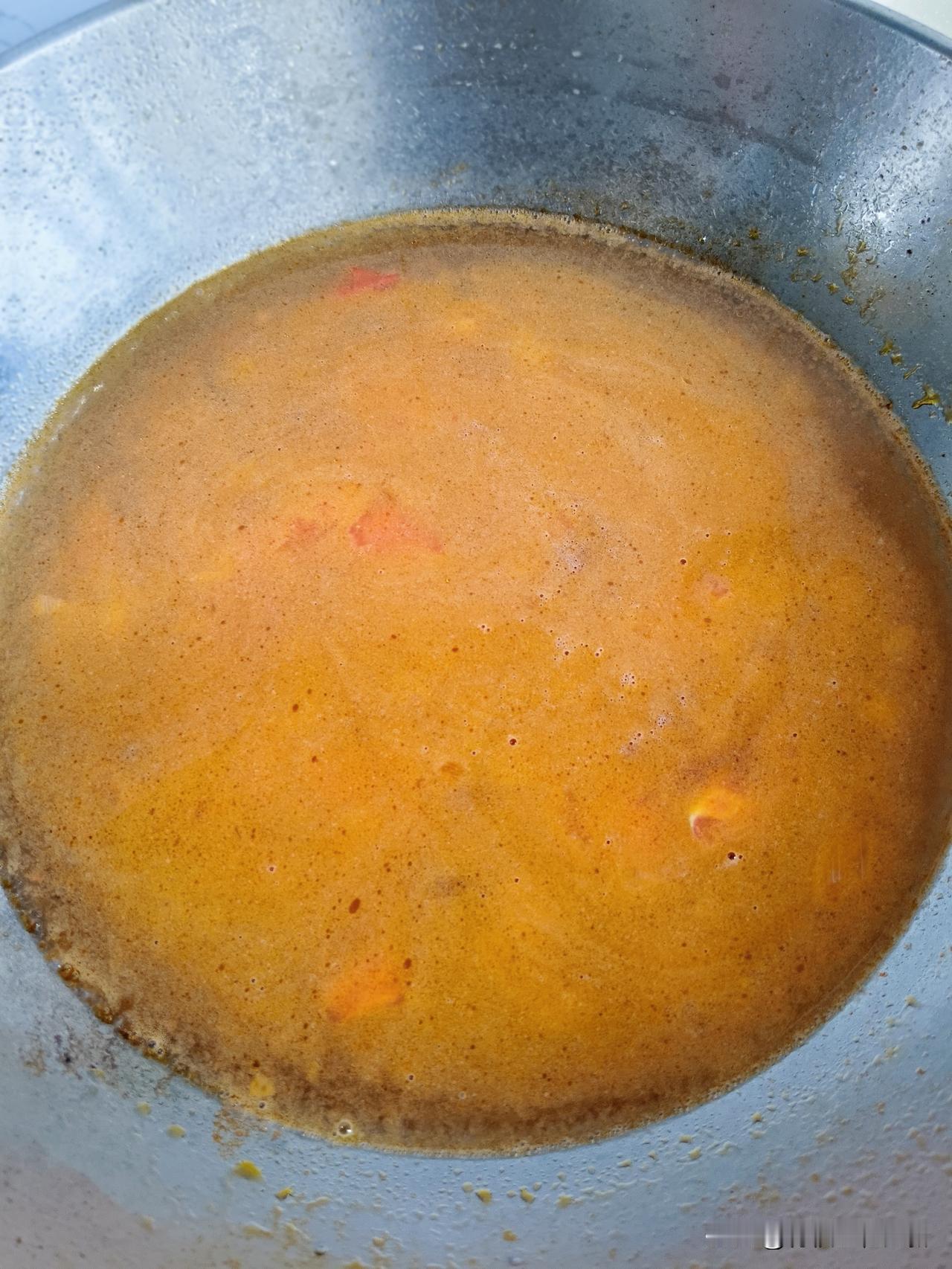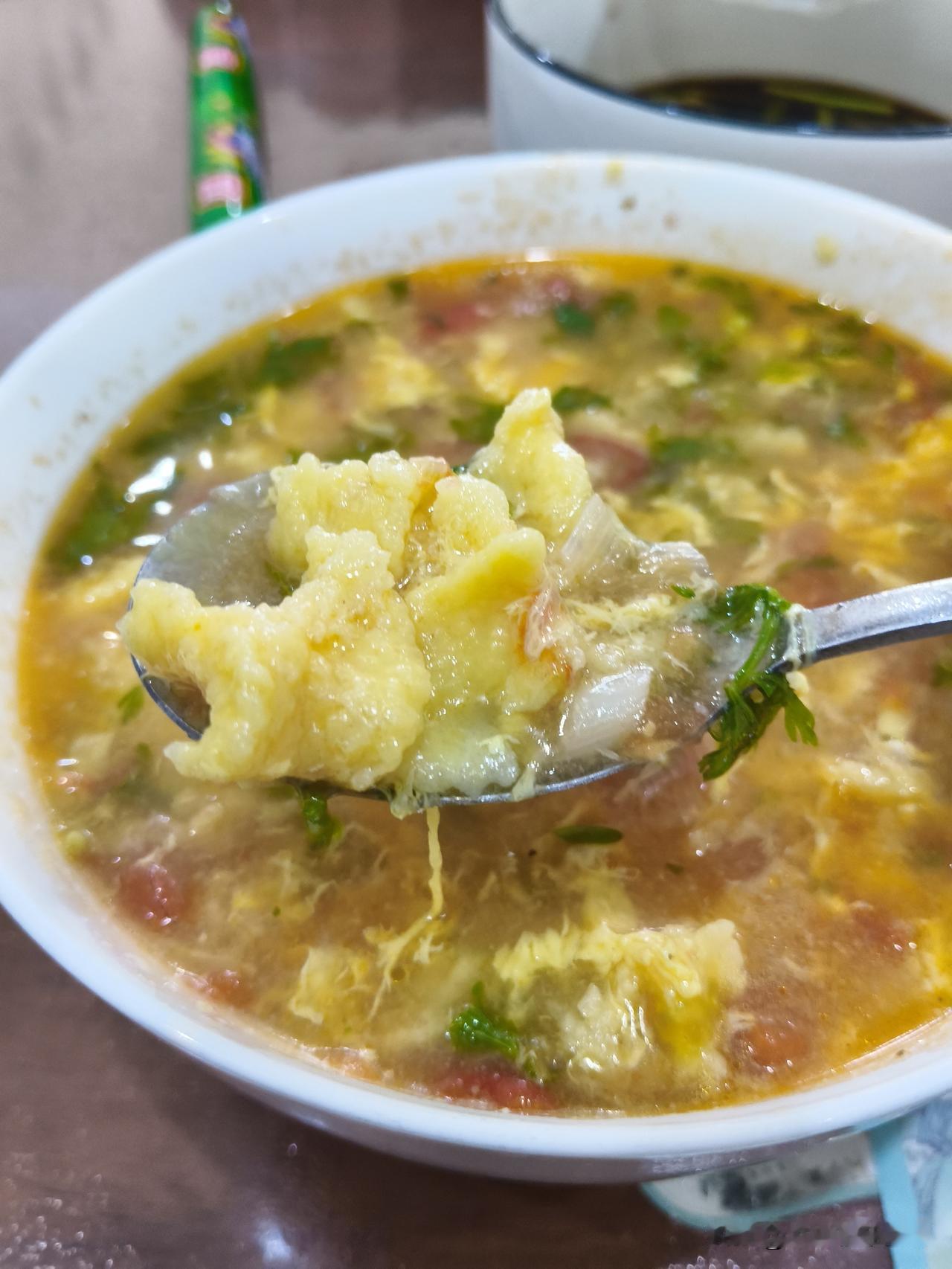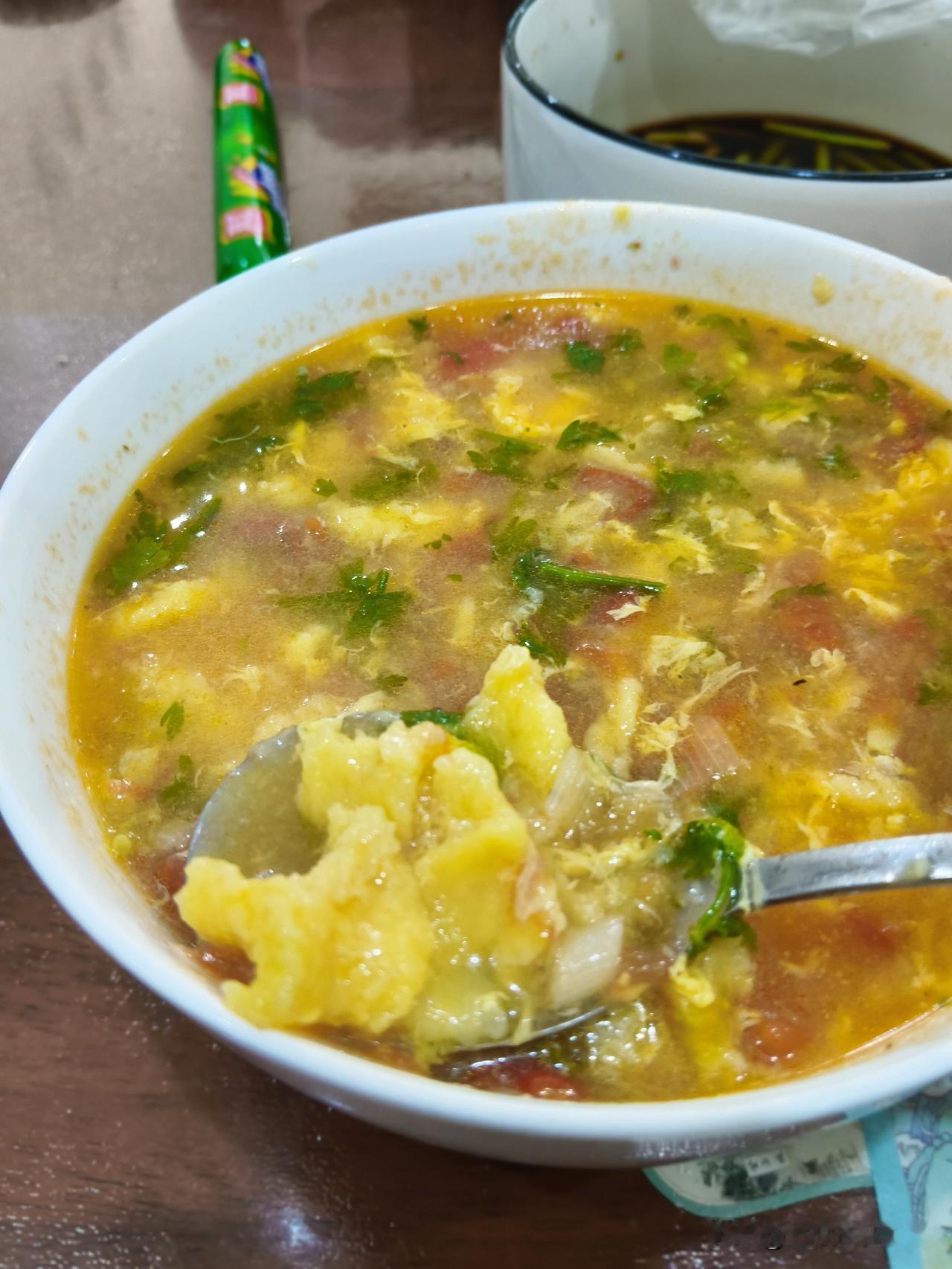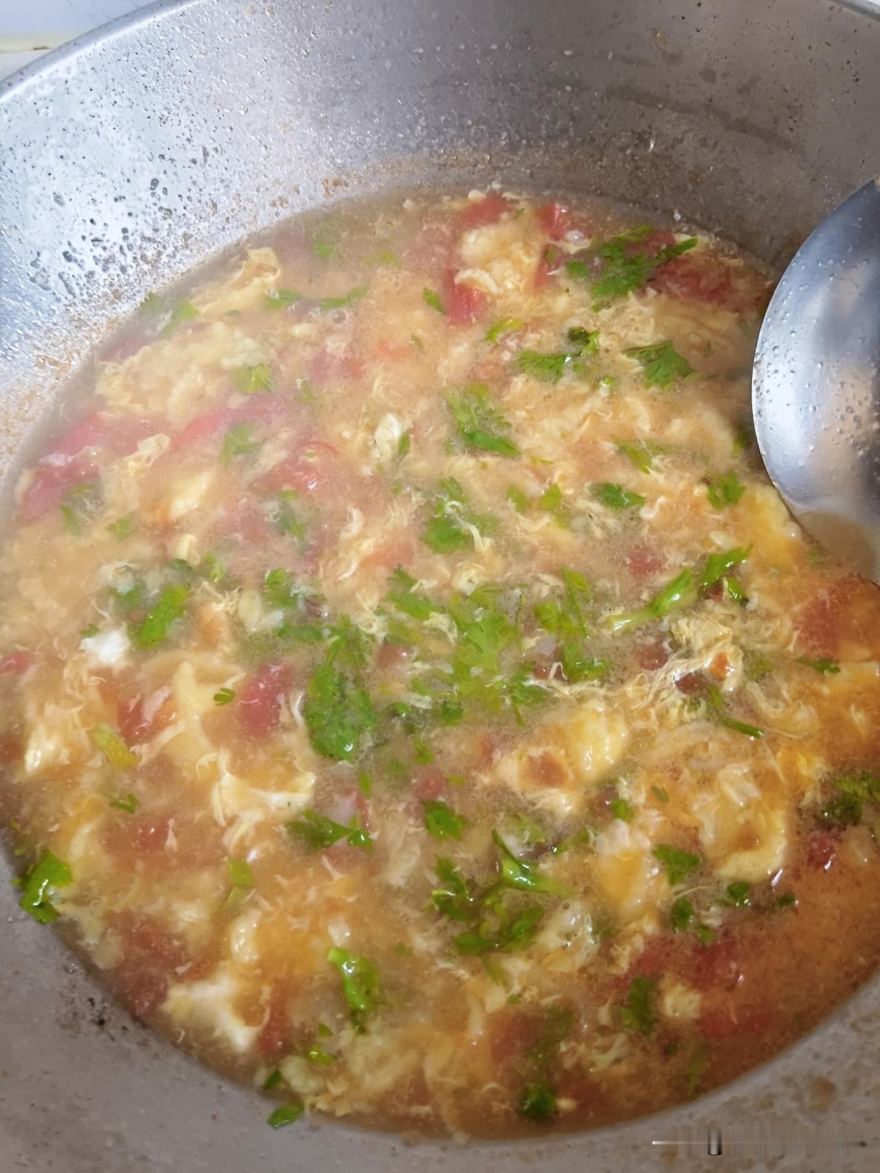 摘好香菜,西红柿切丁,来三勺面,打一个鸡蛋,搅拌成糊状,葱花炝锅,炒西红柿,出沙,加水,煮开,面糊绞进锅里,开锅,打一个鸡蛋碎儿,放香菜,胡椒面,香油。