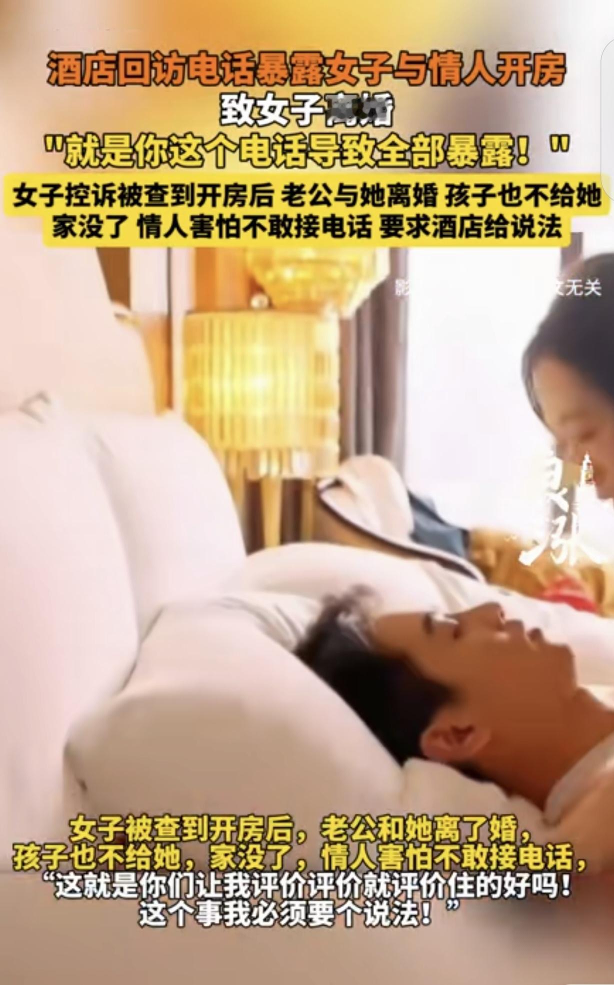 “这就是放纵的代价!”山西大同,一女子和情人去酒店开房,给了条差评,酒店进行电话回访,要求她把差评改成好评,竟然被女子老公知道了,老公气炸了,直接跟女子离了婚,孩子也不给她,家没了,情人害怕到不敢接电话,女子怒了:酒店泄露我隐私,必须给一个说法。酒店:给你打规回访电话,你压根没接,可能是别的酒店打的。