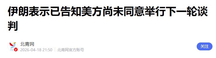 4月18日,据伊朗塔斯尼姆通讯社的消息称:“伊朗已经通过巴基斯坦通知美国官员,并未同意下一场谈判,主要原因是由于美方对伊朗实施海上封锁并在谈判中提出过分要求”,伊朗的态度很明确,提过分要求就不谈,但特朗普在几个小时前也发出警告:“下周三不签协议,美国就会在伊朗上空继续投掷导弹”,看当前双方的态势,大概率是准备打第二场了。