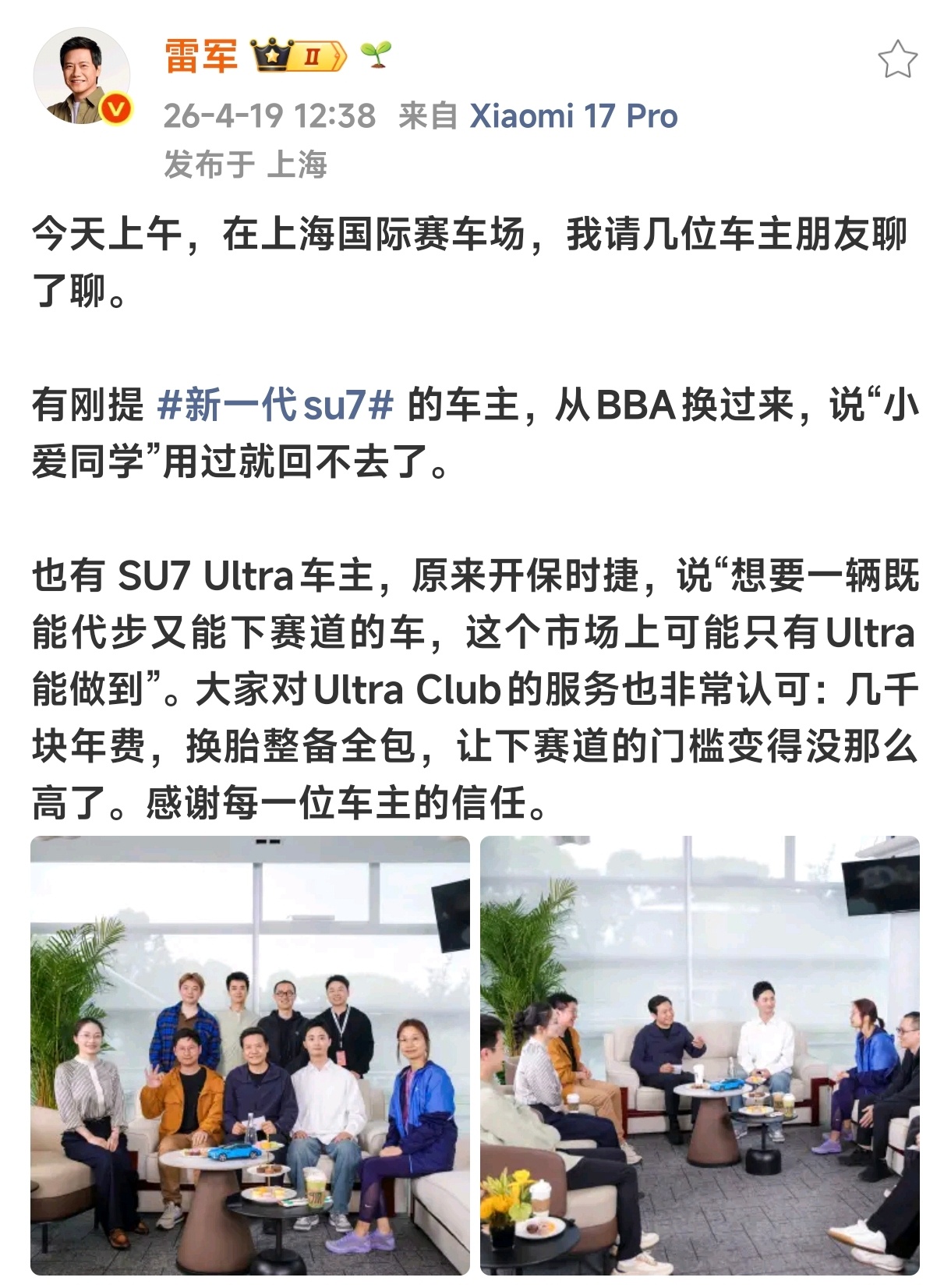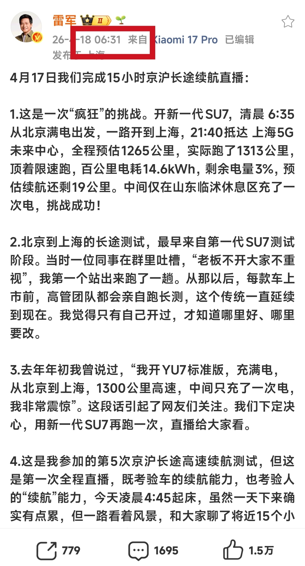 就光看雷总的工作状态,我是真觉得小米汽车想不稳都难。千亿老总,十几个小时,跑完1313公里长途实测,同时还连轴直播。结果周末也是一点都没闲着,同样坚持早起,甚至还邀请车主开会聊天。从产品用料到工艺品质,从技术配置到用户沟通,小米始终把用户放在心上,愿意听建议、肯改问题、敢较真。敢用量化的数据来展示实力,更敢直播拆车展示细节。SU7和YU7能火遍市场,从来不是靠运气,而是靠实打实的产品力和拼到底的造车态度。认真、踏实、靠谱,这就是小米,也是大家首选它的原因。真心佩服雷军,真心佩服小米。