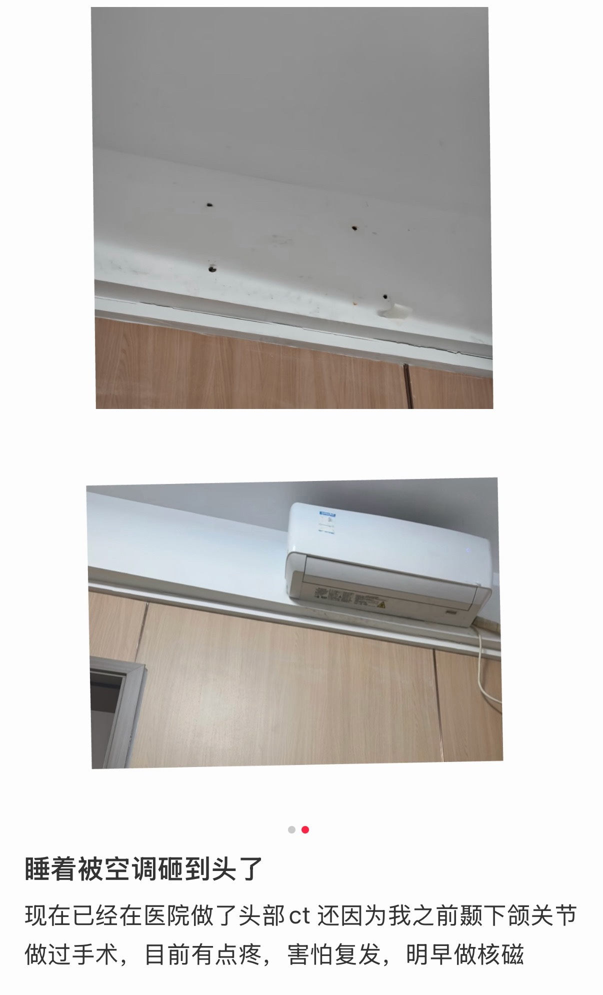 睡觉时被空调砸到头了空调不都是装在床尾的吗?谁家好人把空调装床头,一睁眼就看见,不掉也害怕啊