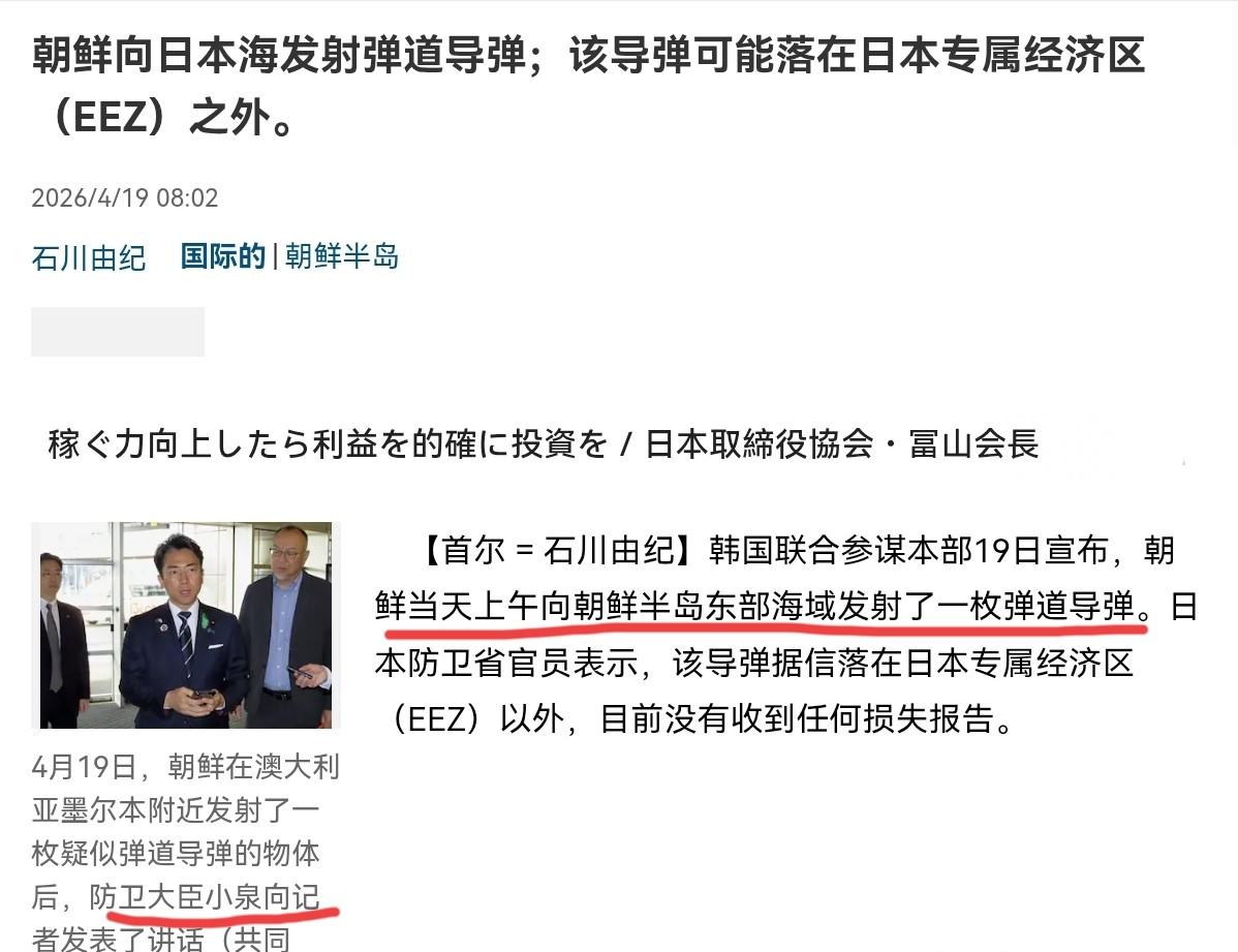 4月19日,根据日本产经新闻报道,日媒称,朝鲜当天上午向朝鲜半岛东部海域发射了一枚弹道导弹。日本防卫省官员表示,该导弹据信落在日本专属经济区以外,目前没有收到任何损失报告。