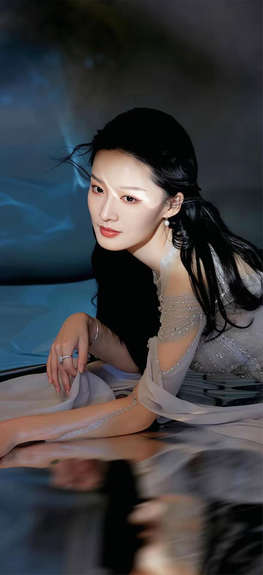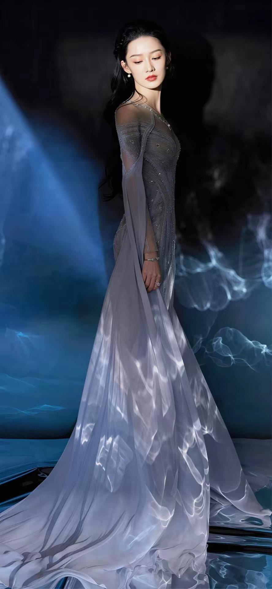 美女壁纸~李沁身着一袭渐变烟蓝色钉珠礼裙,如从深海月色中走出的清冷美人 钉珠勾勒