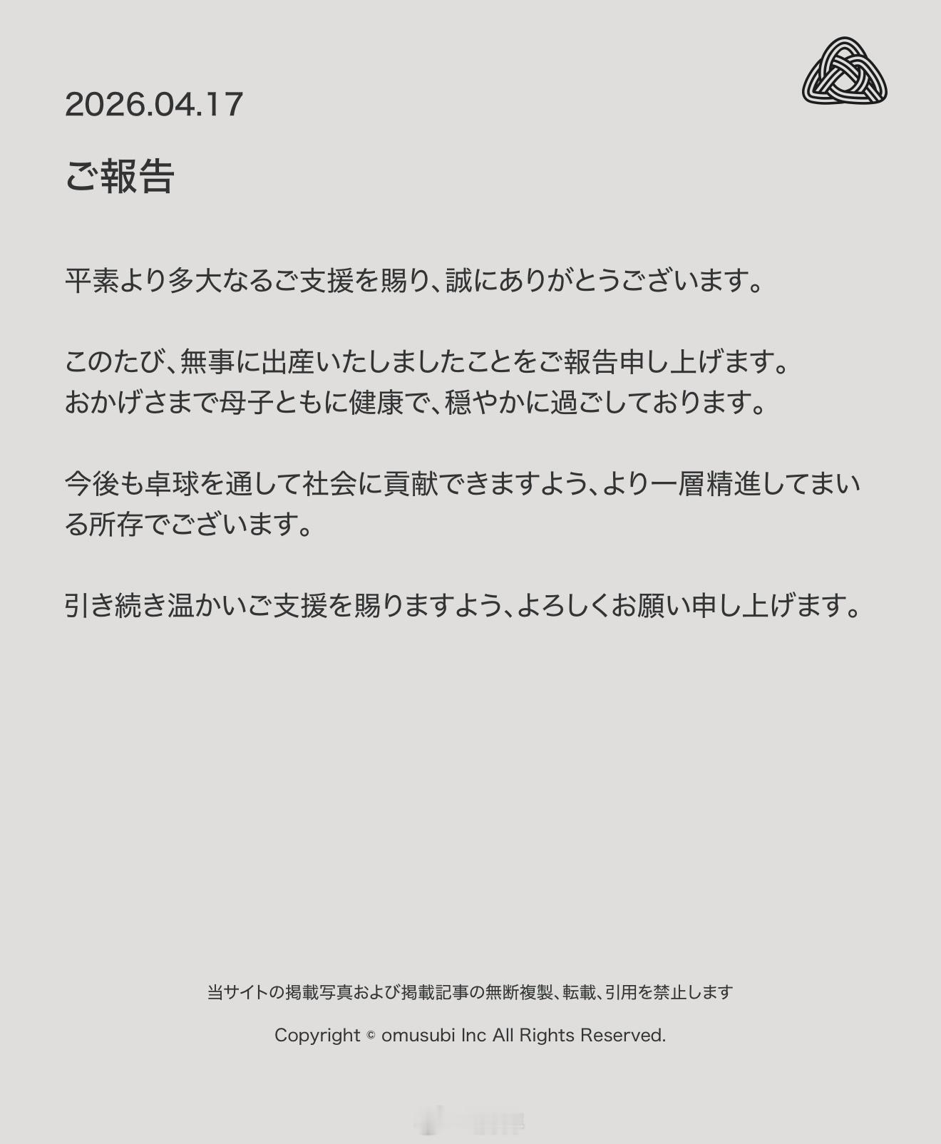 她在官网写道:“感谢大家一直以来的大力支持。特此报告,我已平安生产。托大家的福,我和宝宝都很健康,生活安稳。为了能继续通过乒乓球为社会做出贡献,我将更加努力。恳请大家继续给予温暖的关照。”