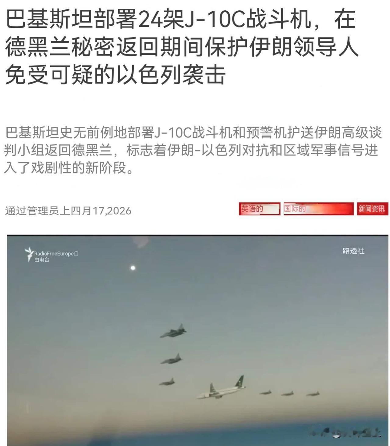外媒称为了让伊朗代表和平返回德黑兰,巴基斯坦派出了24架歼10C进行全程护航