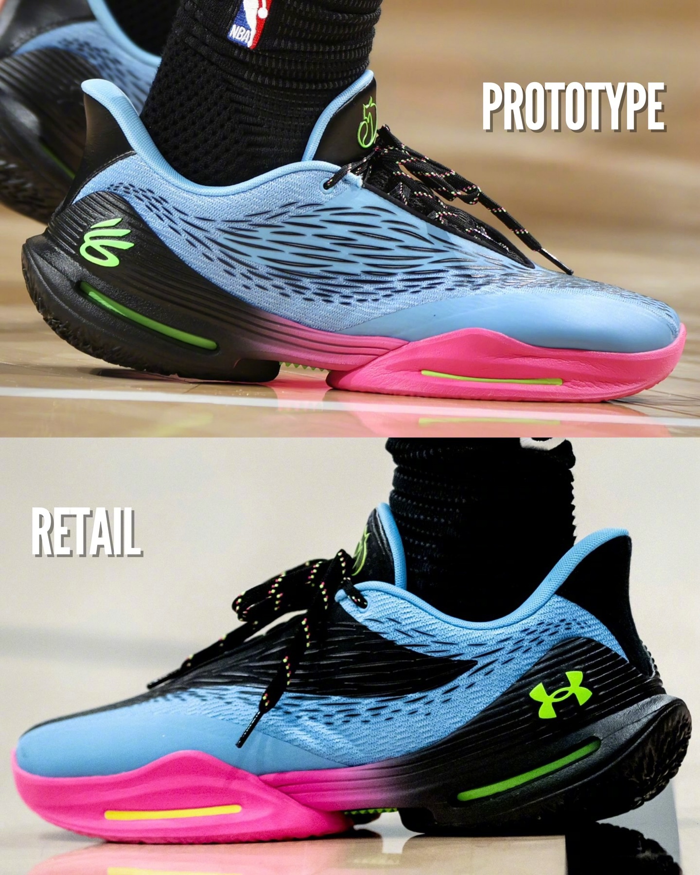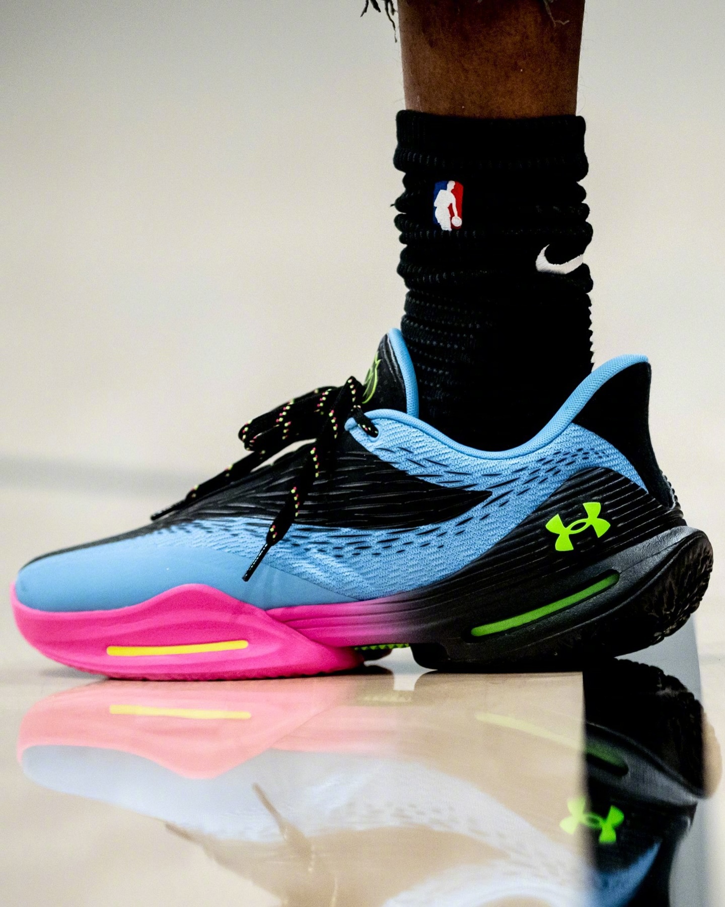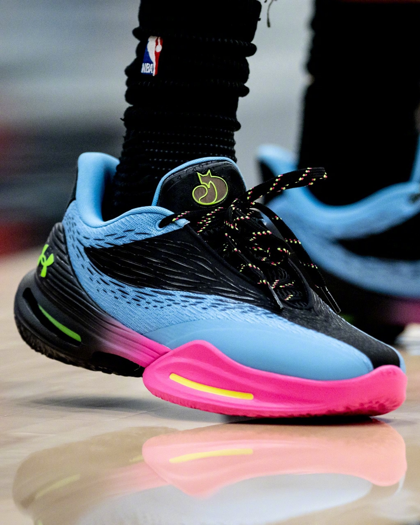 福克斯上脚了他的最新签名鞋Fox 3,而这双本人上脚的和之前戴维恩-米切尔上脚的原型鞋也有不同,福克斯上脚的将库里品牌的logo换成了UA的Logo。