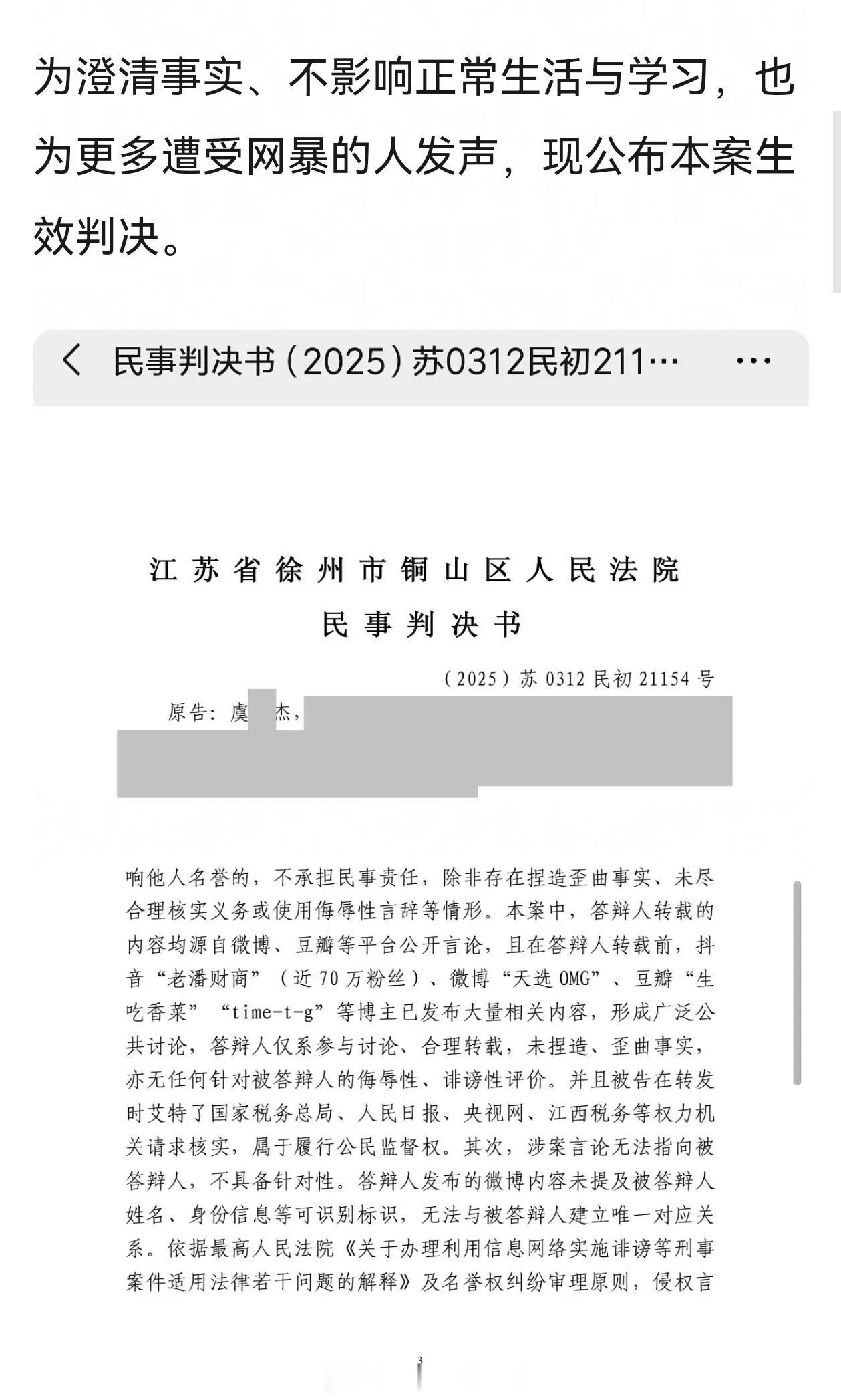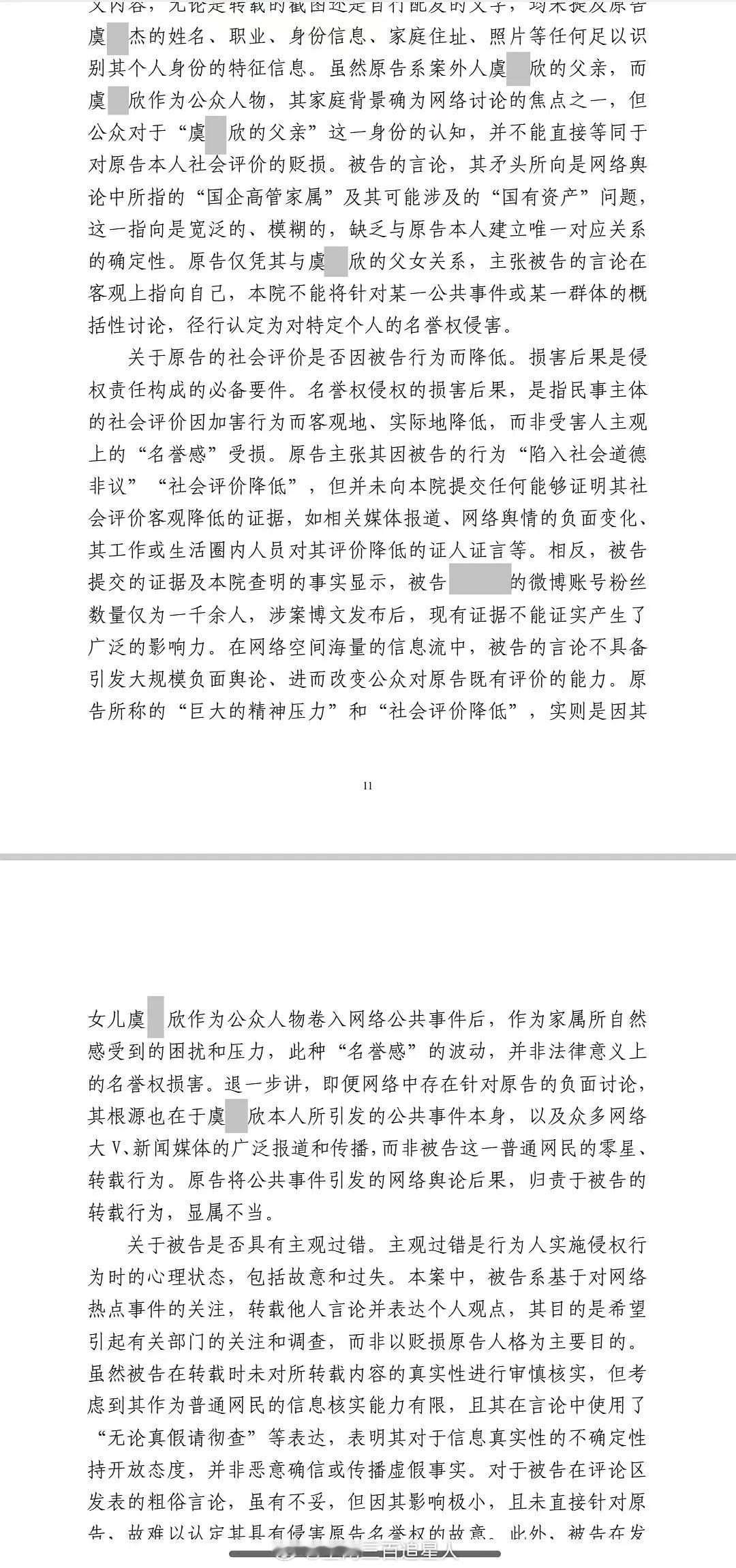 虞书欣父亲告网友名誉权败诉了,看了下当事人发出来的判决书,关键点好多啊