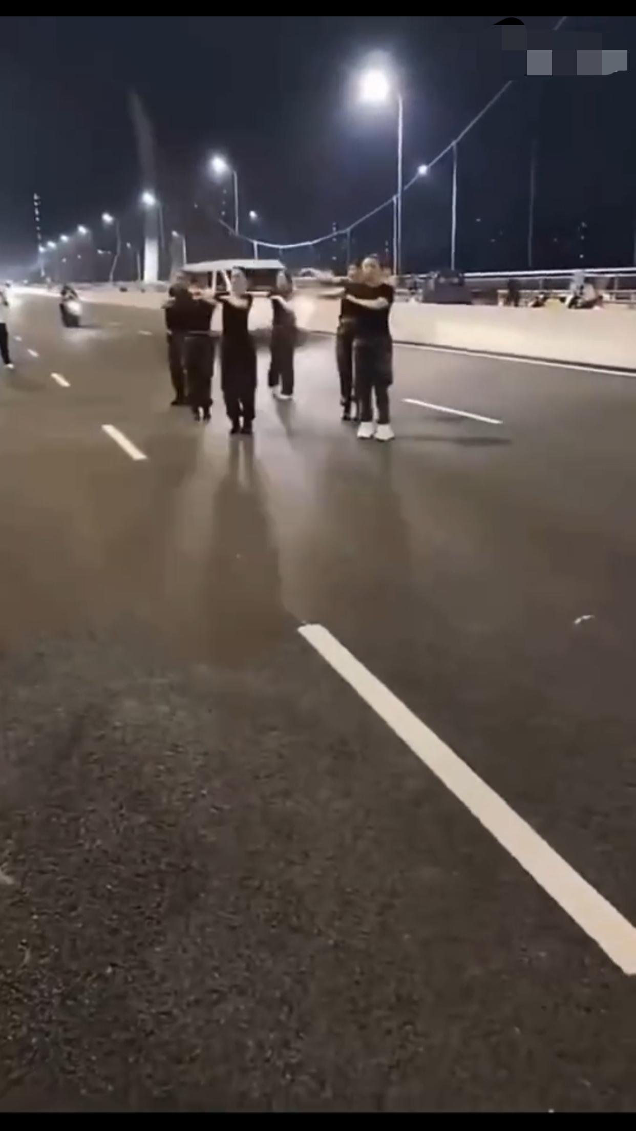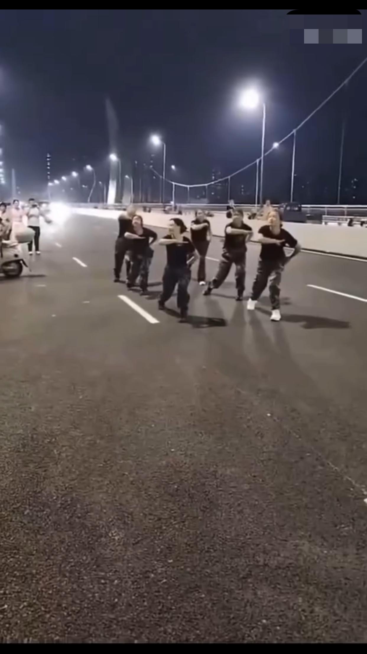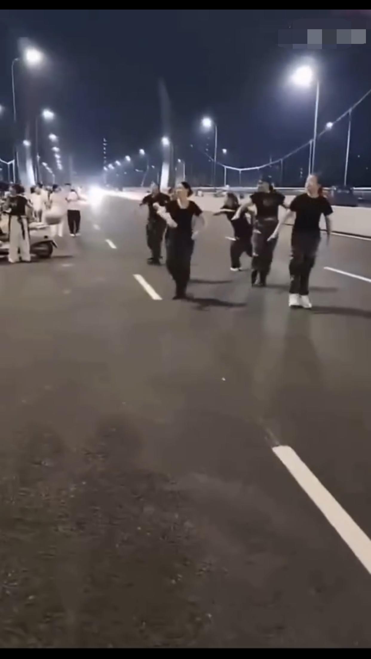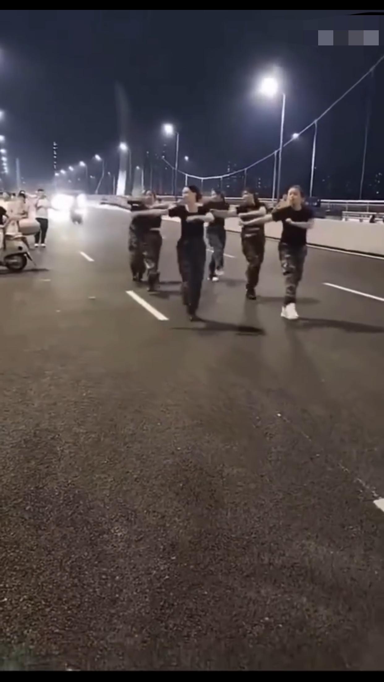 在中国某地的公共机动车道上,一群女子无视来往的车辆,占着车道,在马路中间忘我的跳