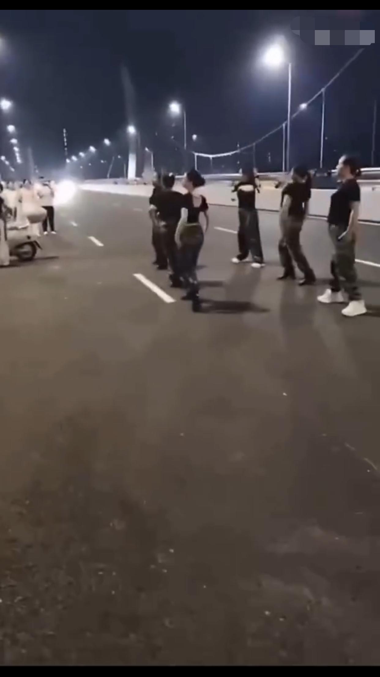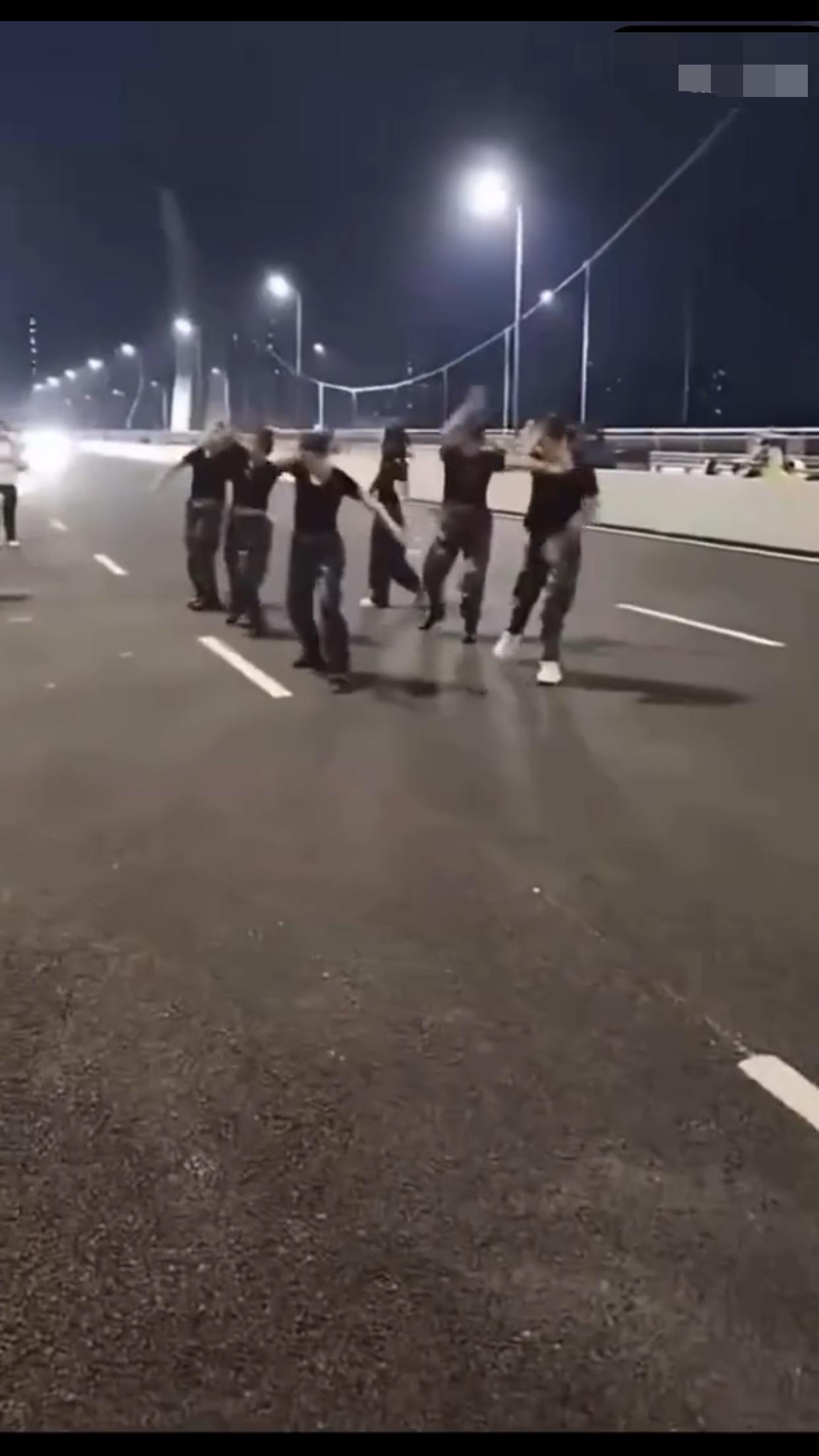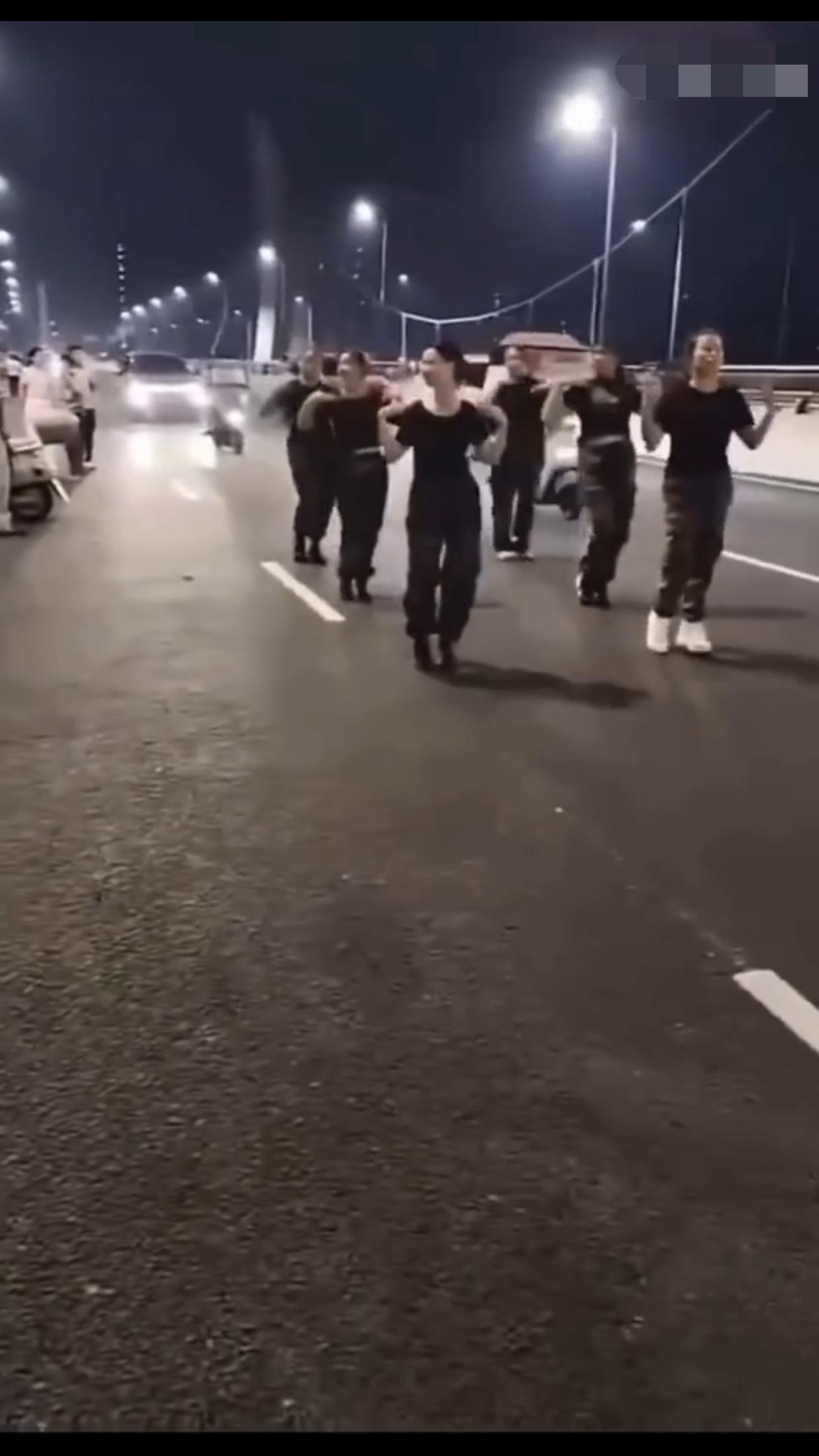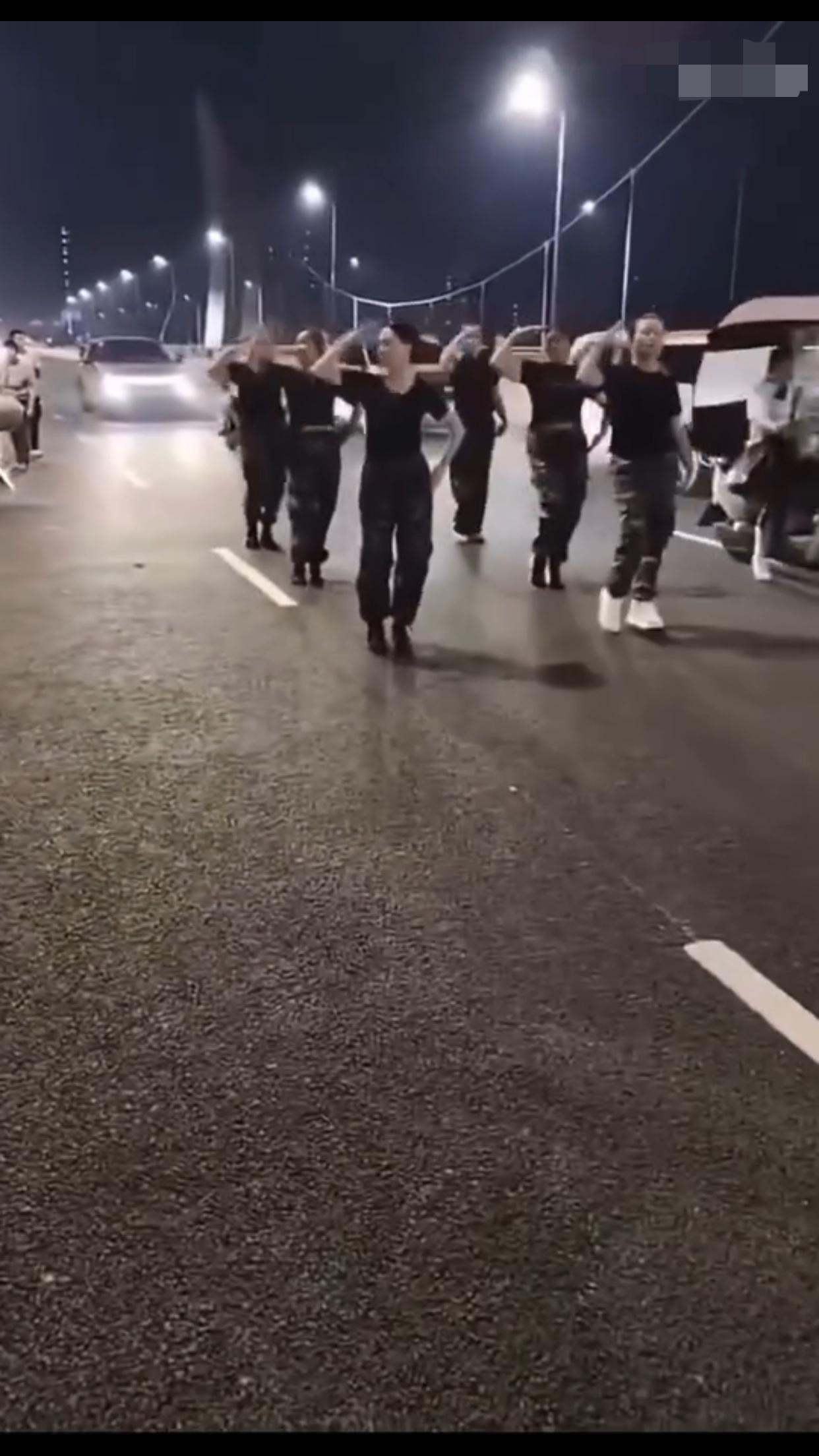 在中国某地的公共机动车道上,一群女子无视来往的车辆,占着车道,在马路中间忘我的跳