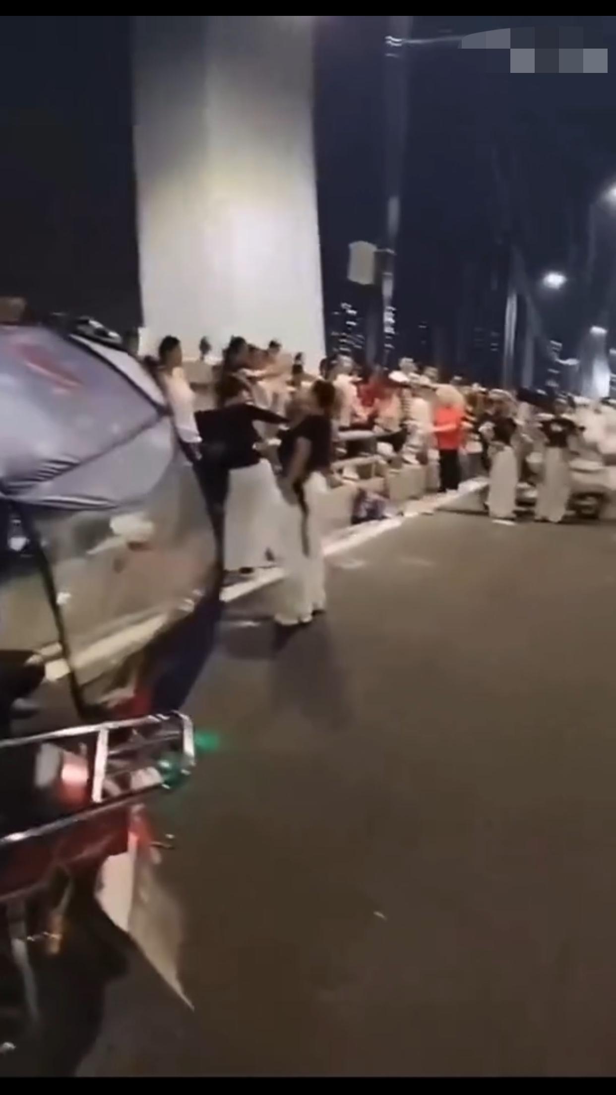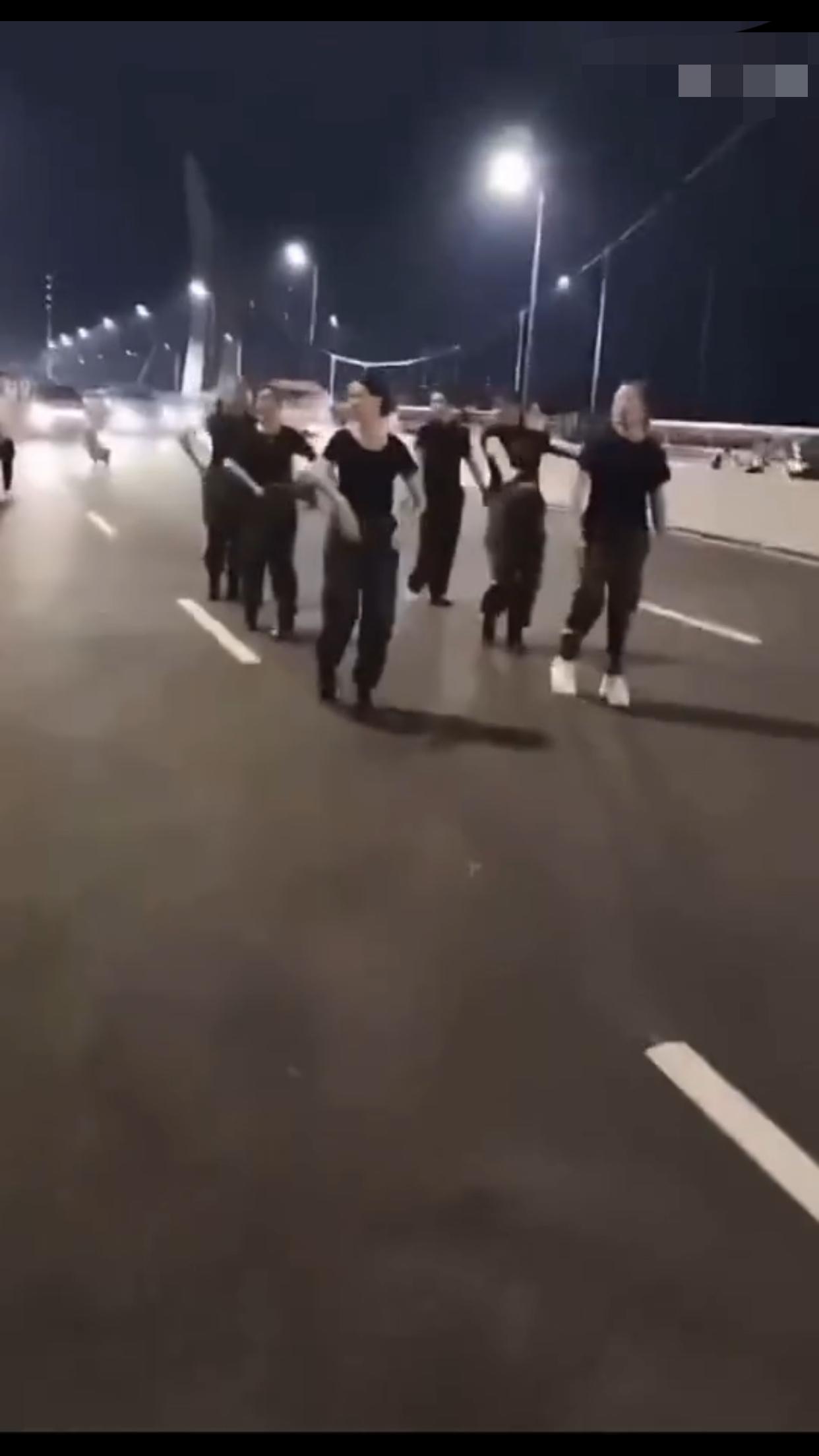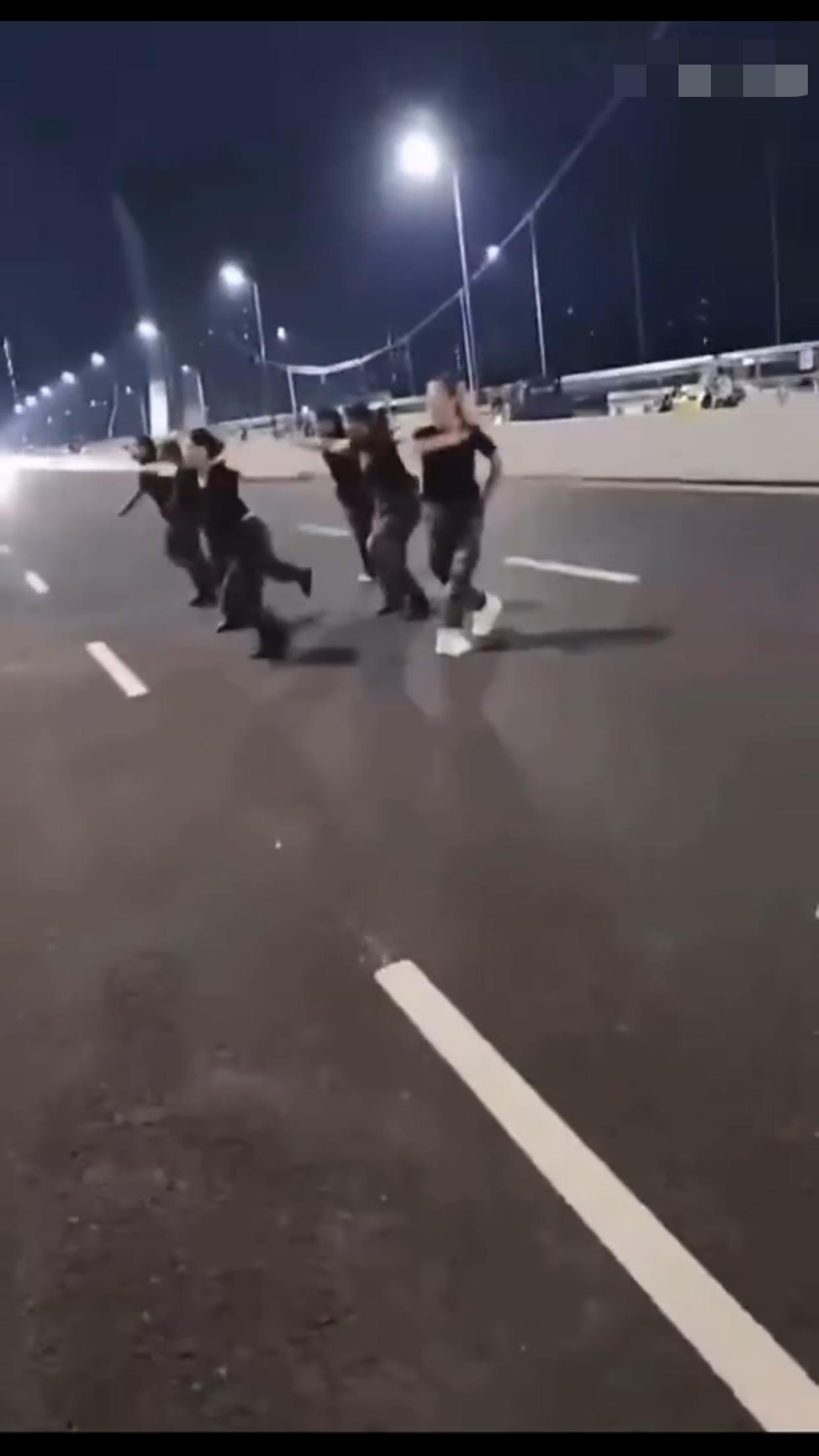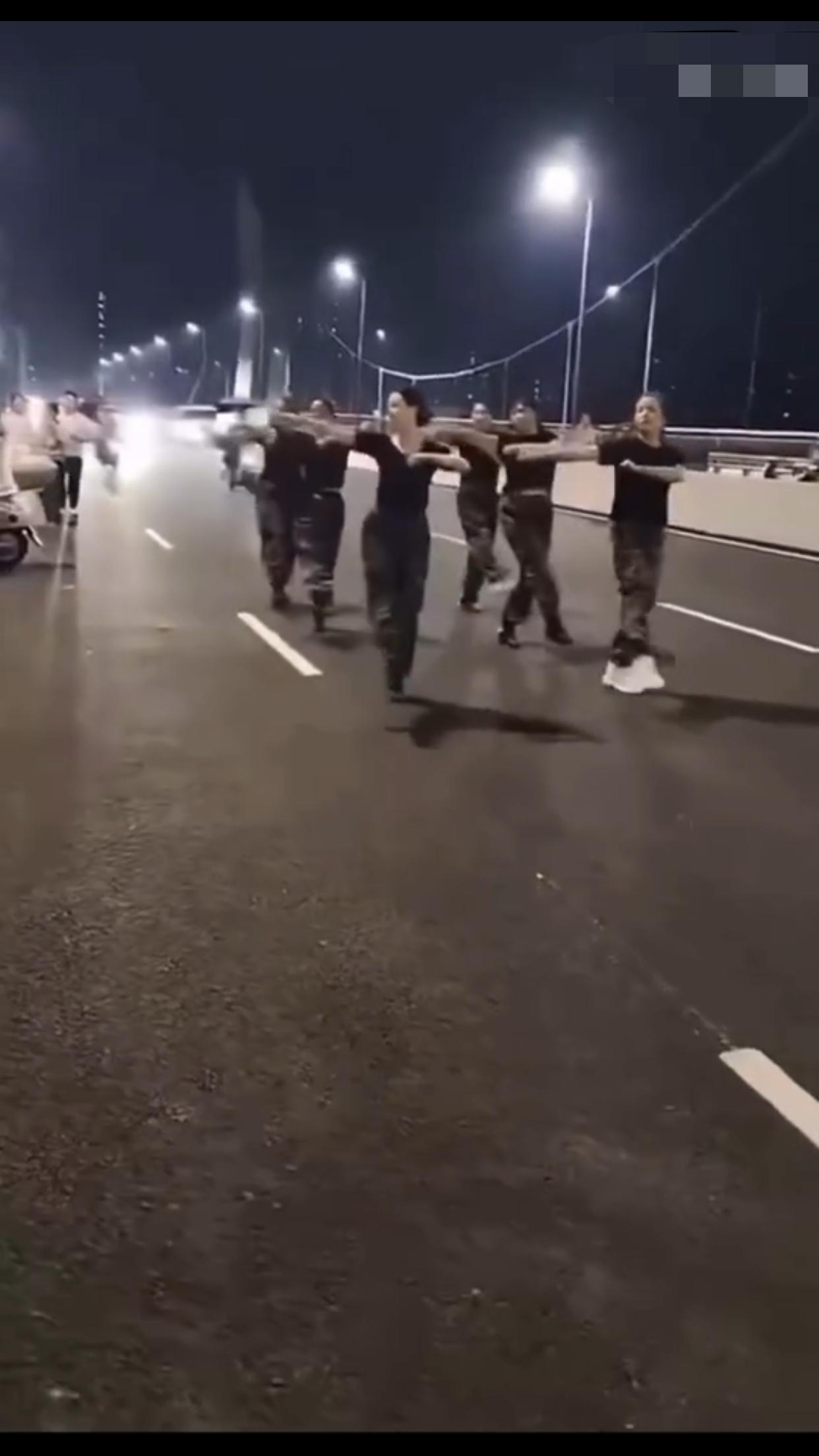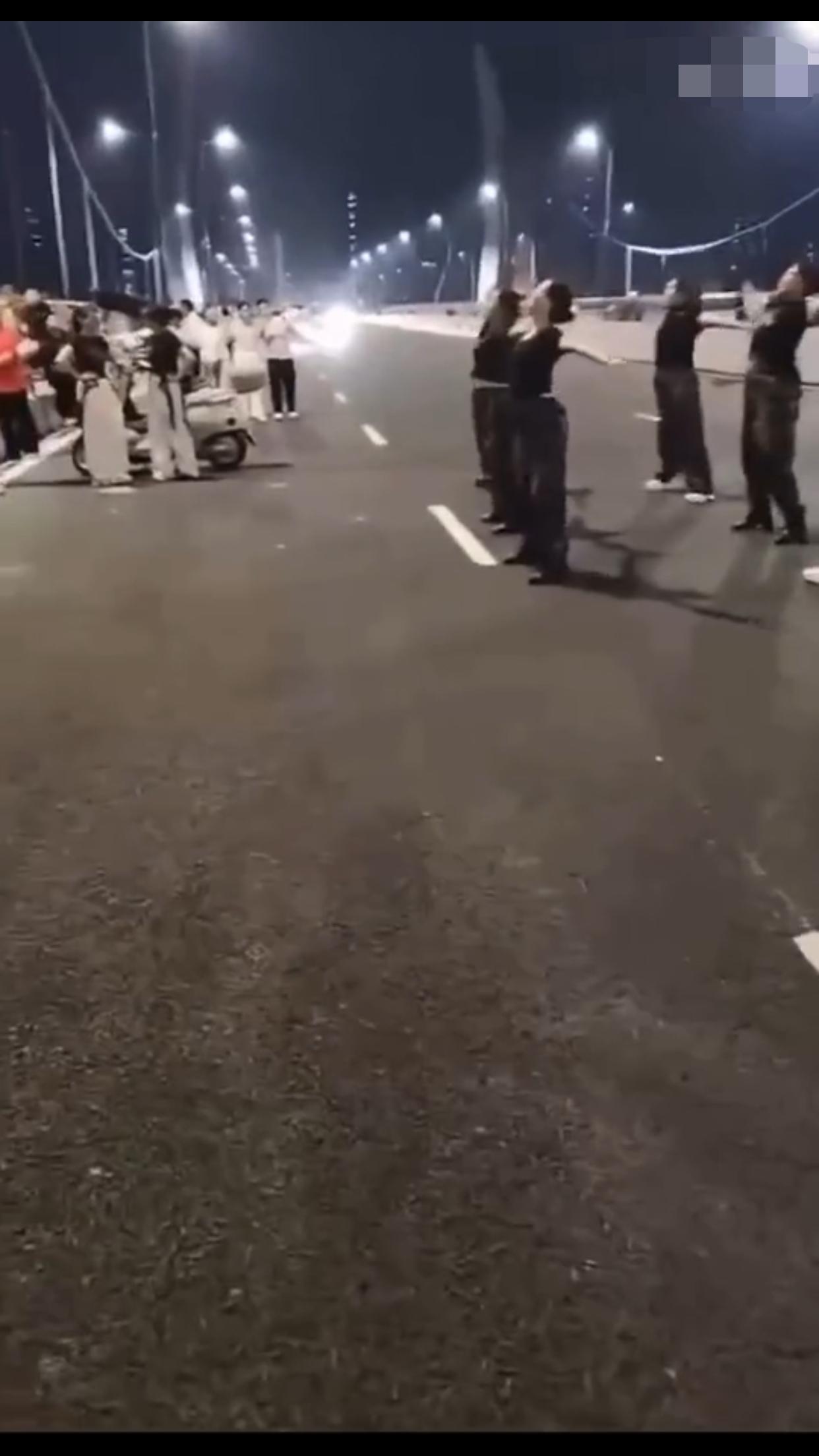 在中国某地的公共机动车道上,一群女子无视来往的车辆,占着车道,在马路中间忘我的跳