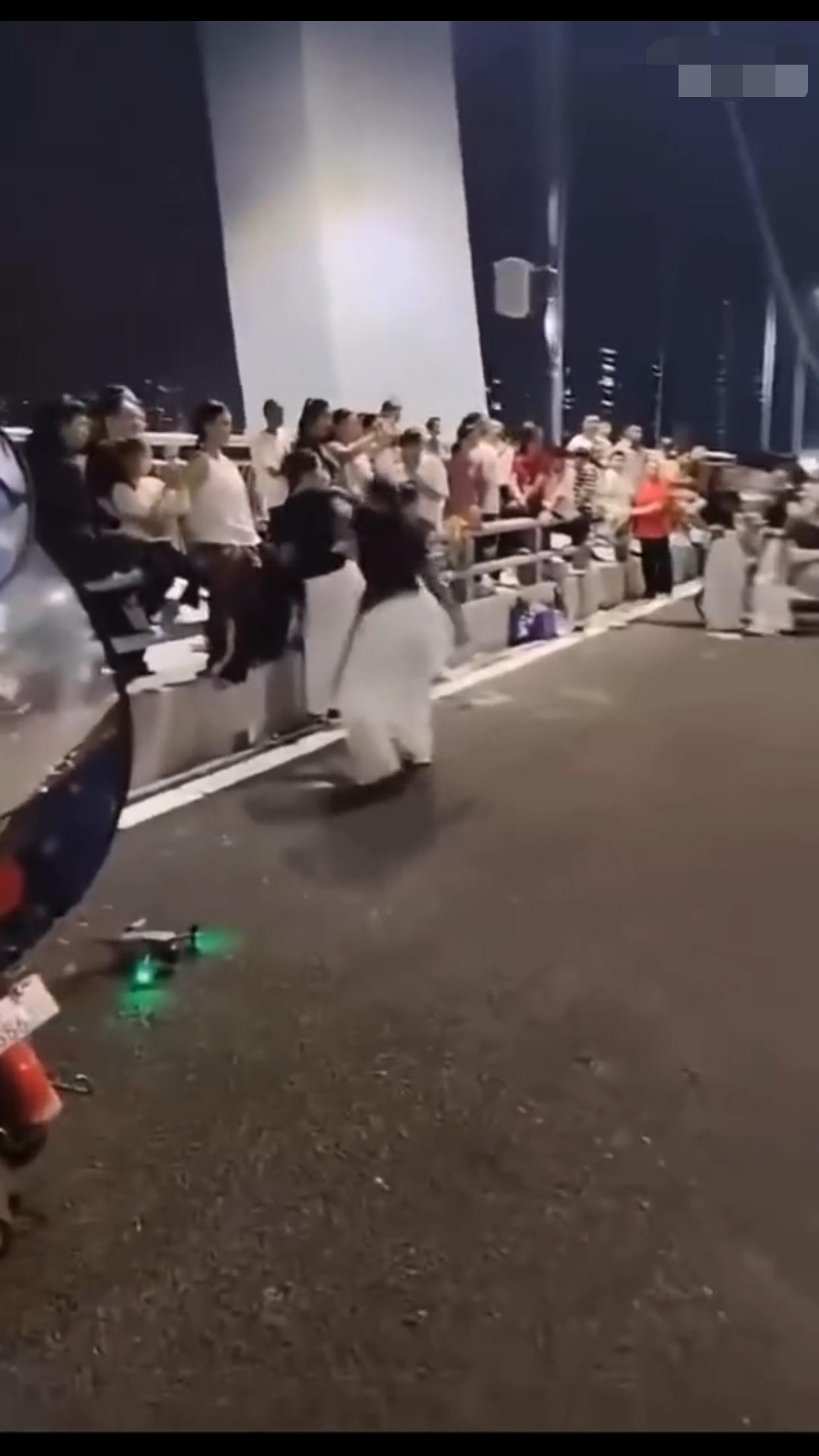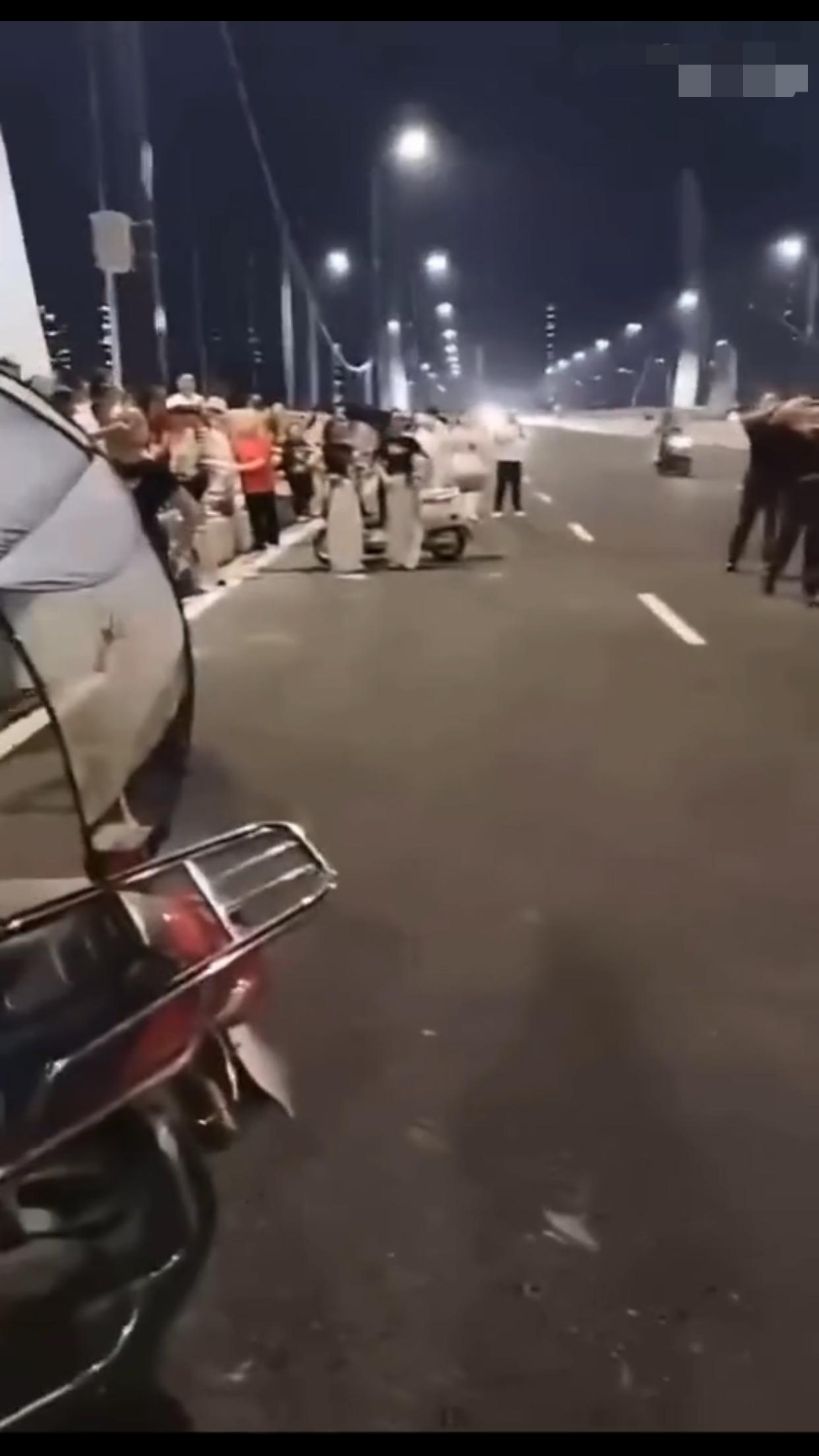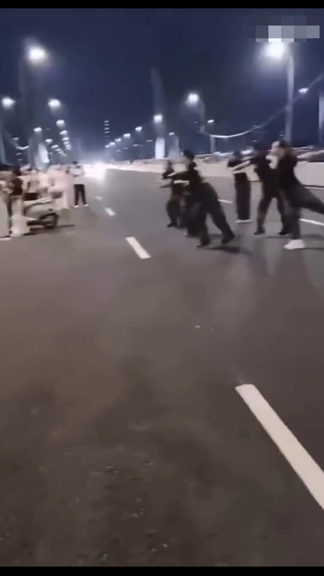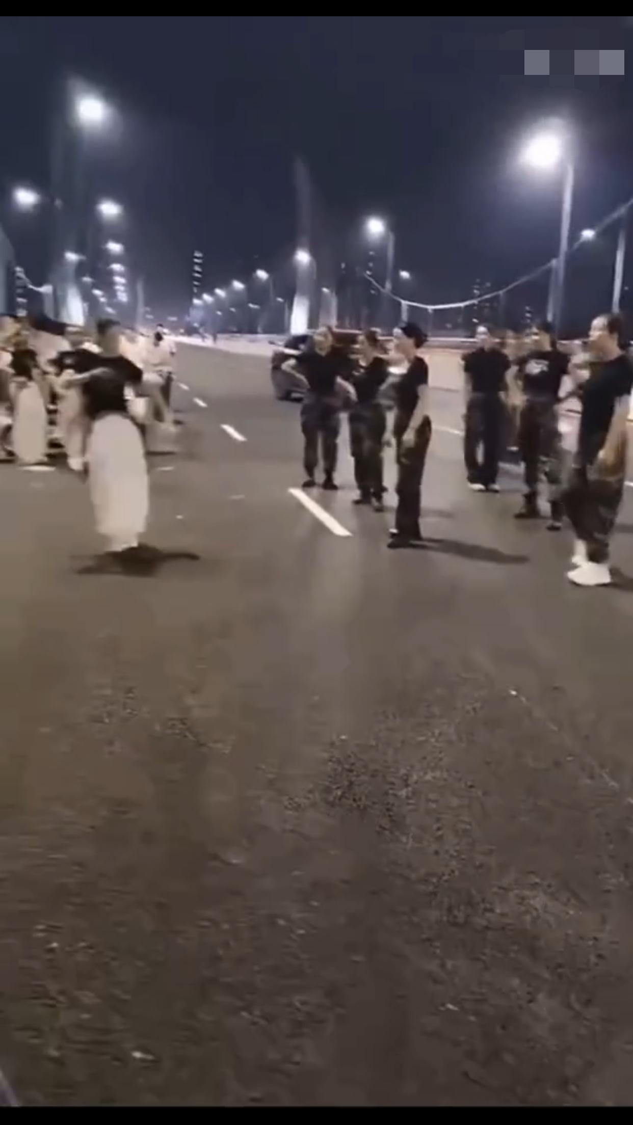 在中国某地的公共机动车道上,一群女子无视来往的车辆,占着车道,在马路中间忘我的跳