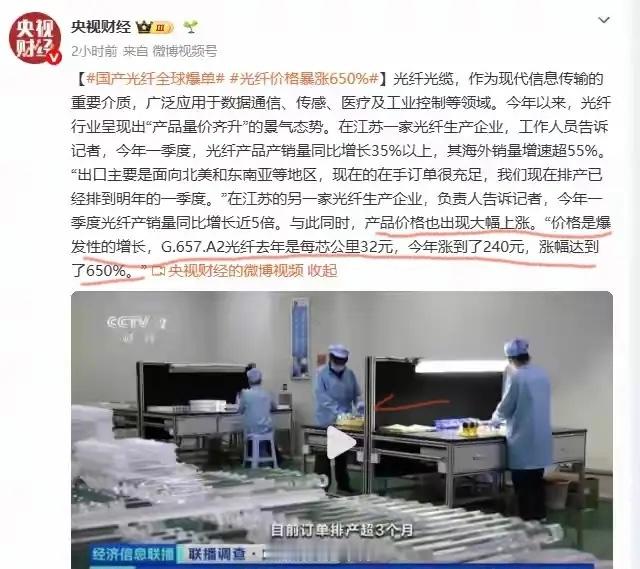 国产光纤全球爆单,G.657.A2价格涨幅650%,这是央视财金的报道。年初涨幅还在400% ,现在就650%,这公司利润还不蹭蹭往上串,光纤板块无疑就是下一个光模块。高端光纤需求爆发,AI数据中心增长10倍,光纤无人机每架消耗20—50公里,反过来挤压低端光纤产能,而新产能建设需要时间,结过就是都涨价,目前G.657.A2涨幅650%,G.654.E涨幅100%,G.652.D涨幅400%。随着产品价格的暴涨,光纤企业的股价也大幅上行。康宁:市占率19%,目前市值1412美元,折合人民币9690亿元;长飞光纤:市占率14.6%,目前市值3029亿;中天科技:市占率11.4%,目前市值960亿元;亨通光电:市占率11.2%,目前市值1373亿元;烽火通信:市占率10.2%,目前市值669亿。光纤板块涨幅已经很大了,但从市占率来看,相关公司市值与康宁还是差距很大。在产品涨价超预期的情况下,业绩提升也会超预期,股价调整以后还可能新高。长飞光纤的技术优势没得说,市占率与康宁只差5%,市值却只有其三分之一。烽火科技的市占率比长飞光纤少不到5%,市值只有长飞的五分之一,其市值比中天、亨通也低不少,就烽火科技的产能和实力,不应该有这么大差距才是,各位怎么看?