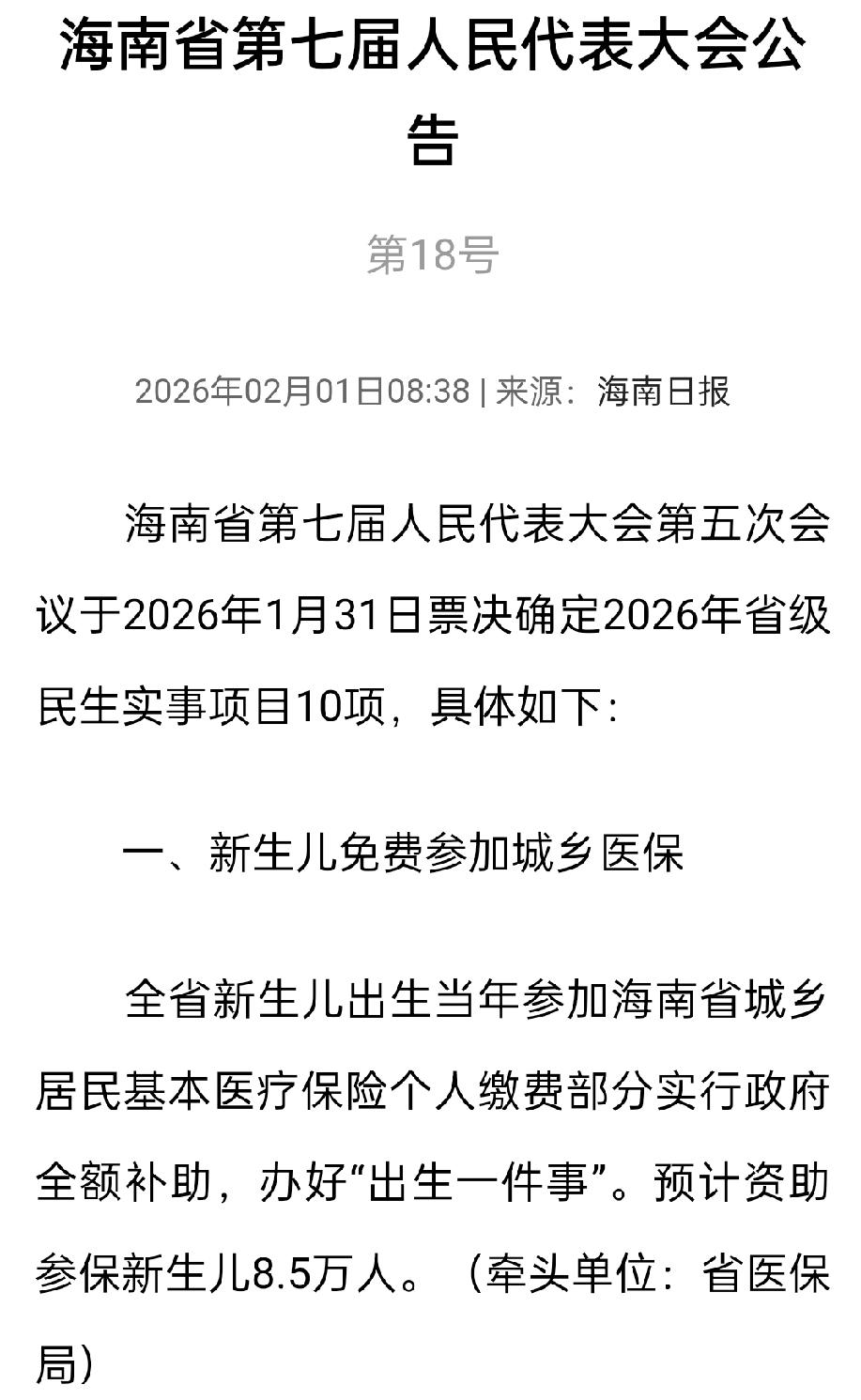 这是2026年省级民生实事项目里的重头戏!全省新生儿出生当年参加海南省城乡居民医保的个人缴费部分,由政府全额补助,预计资助8.5万人。
