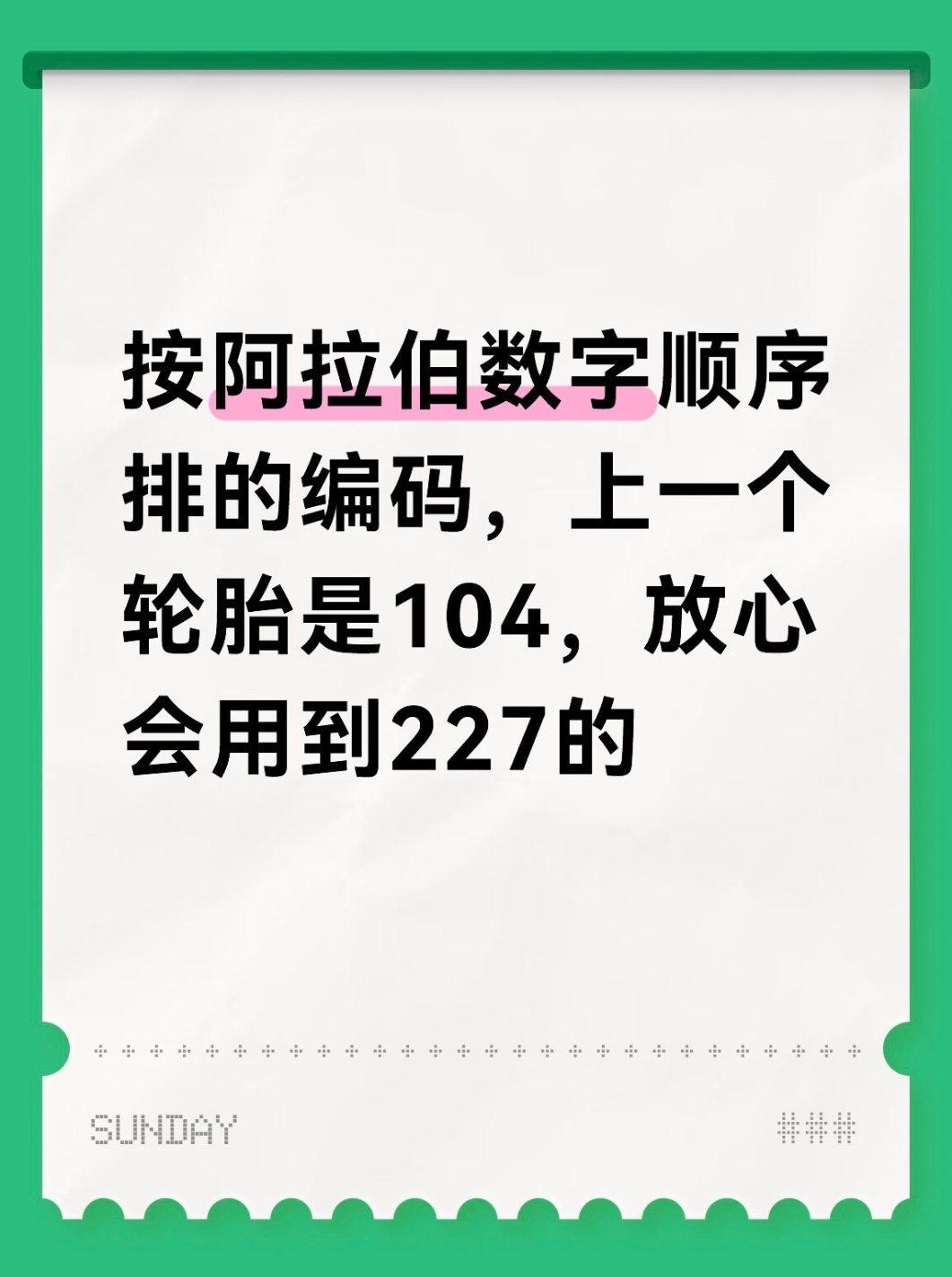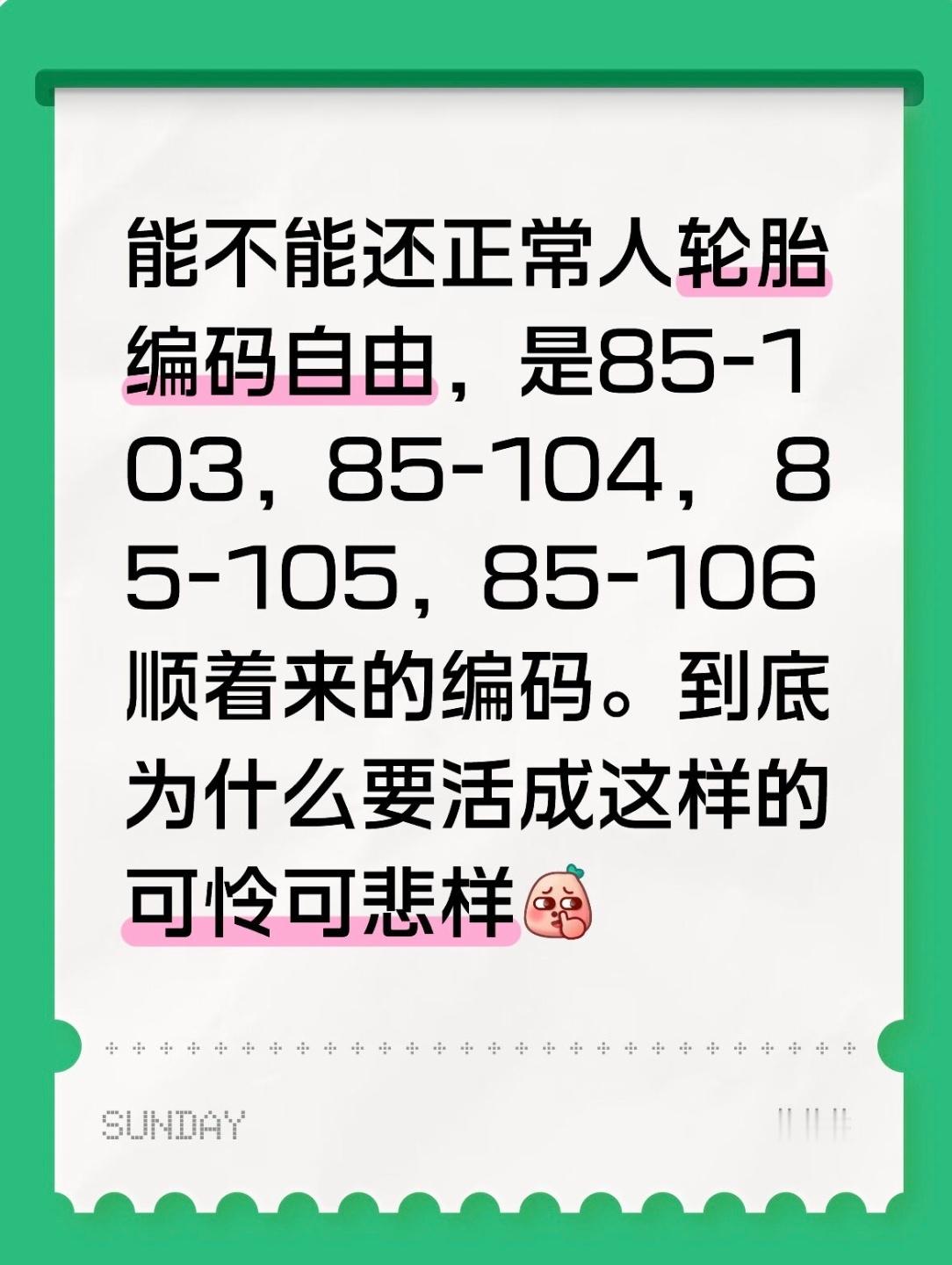 王一博车轮 85105 能不能还正常人轮胎编码自由,是85-103,85-104, 85-105,85-106顺着来的编码。看起来觉得可怜……