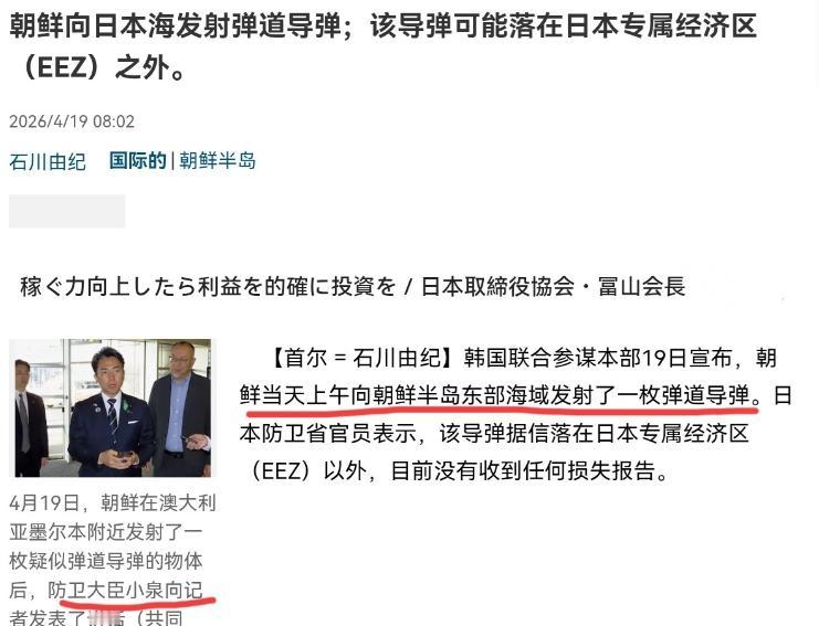 日本惊出一身冷汗!日本军舰刚挑衅性的经过台湾海峡,朝鲜直接朝着日本经济海域方向发射导弹,日本防卫大臣小泉进次郎紧急出来表态回应!4月19日,根据日媒报道,朝鲜当天上午向朝鲜半岛东部海域发射了一枚弹道导弹。日本防卫省官员表示,该导弹据信落在日本专属经济区以外,目前没有收到任何损失报告。