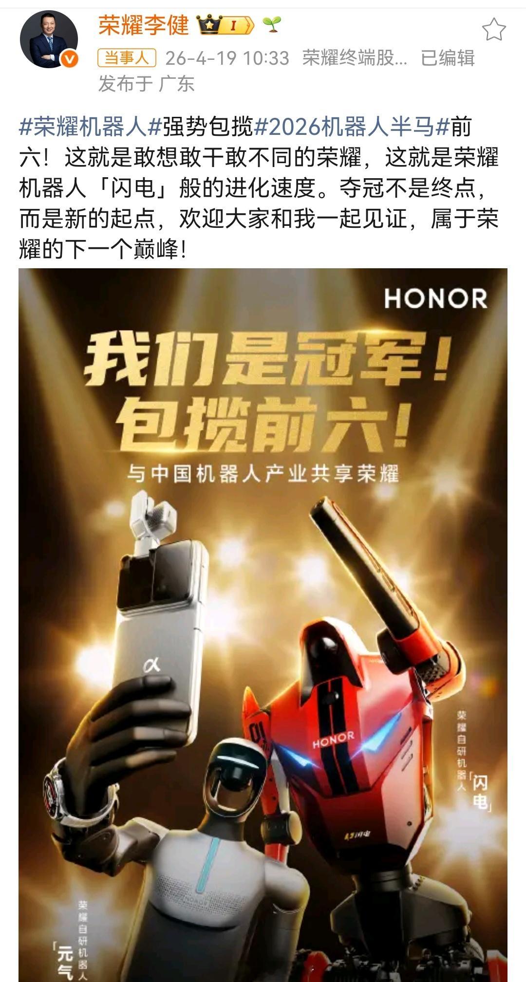 荣耀机器人打破人类半马纪录荣耀「闪电」直接封神——50分26秒夺冠,打破人类半马世界纪录,还包揽前六!自研液冷+高扭矩关节,全程稳控31.5℃以下,彻底解决长跑发热宕机难题 。