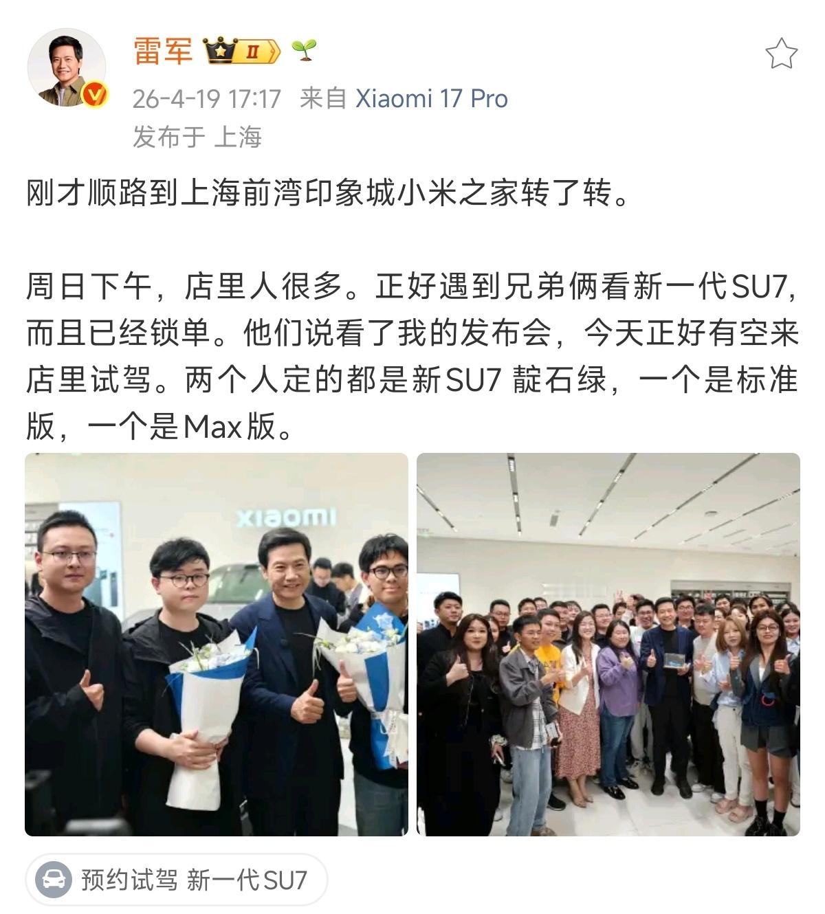 雷总的行程太满了吧,下午三点多还在上海赛车场挥旗子,然后五点多就出现在上海前湾城