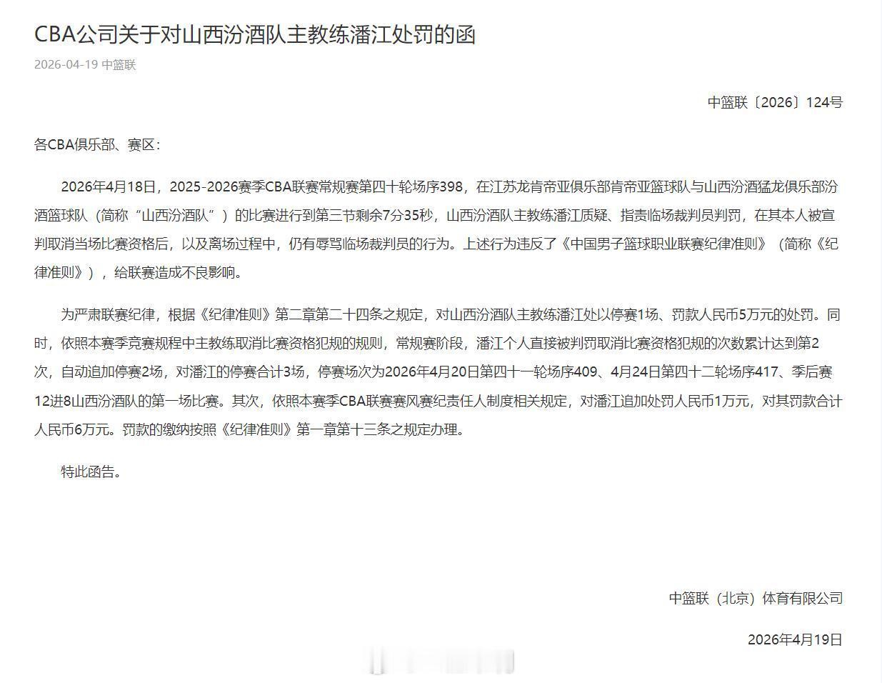 CBA公司对潘江开出了一份超级大罚单!刚刚,CBA公司给山西队主教练潘江,开出