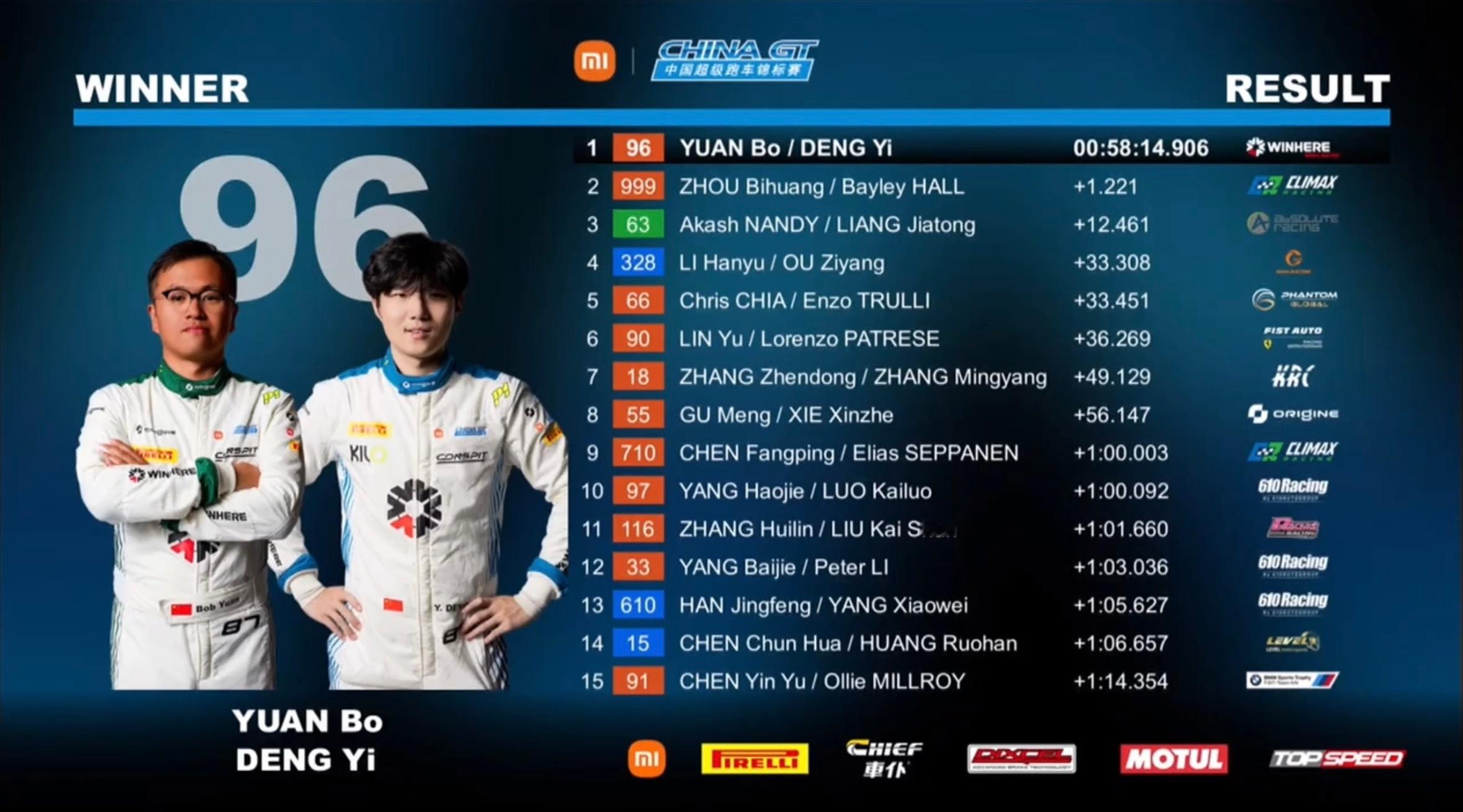 2026赛季小米•China GT中国超级跑车锦标赛 GT3组别第二回合正赛结束🏎🔚全场冠军🥇:Climax Racing的999号车组(车手Bayley Hall➕车手周碧煌)