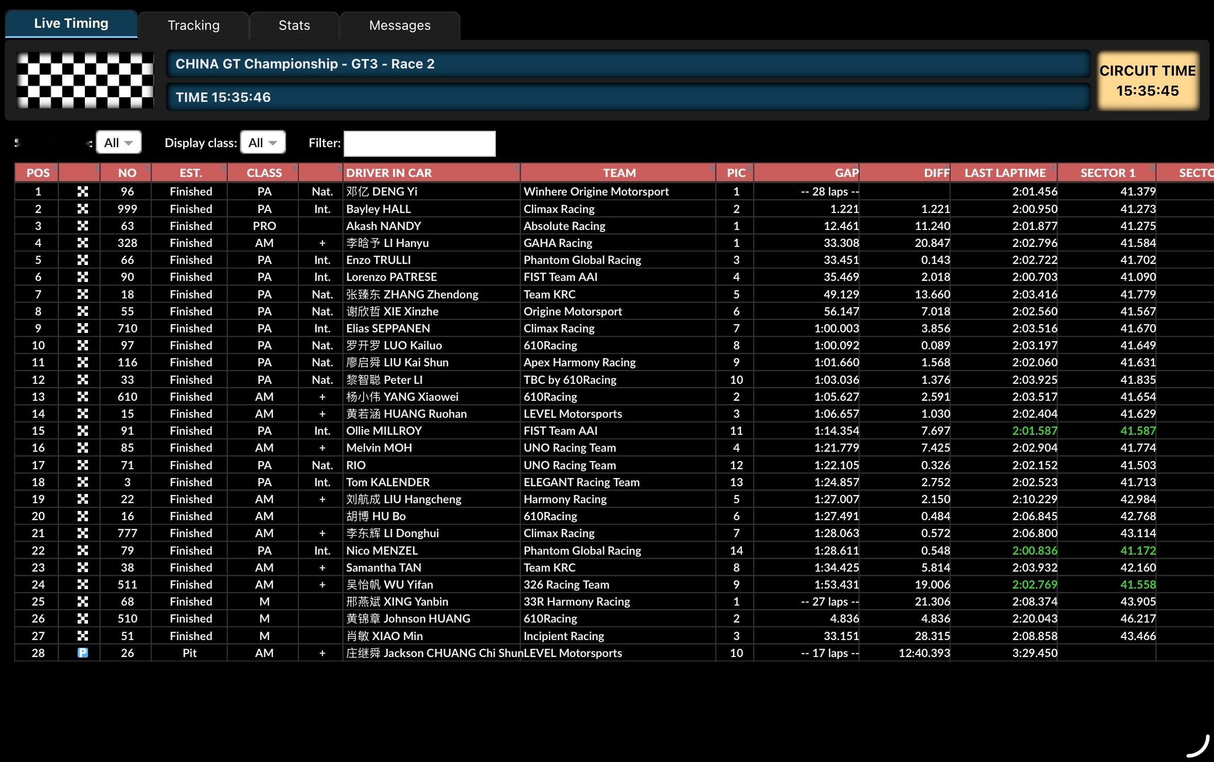 ……Uno Racing Team的85号车组(车手毛骏豪➕车手王一博)以全场第16(Am组别第4)冲线~王一博全场第24位发车后长距离表现稳定,一度上升到第19位将赛车交给队友,最终85号车组顺利完赛!GT3赛车ChinaGT中国超级跑车锦标赛