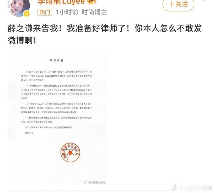 薛之谦方回应李雨桐被行拘家人们,娱乐圈这 “瓜田” 永远不缺新鲜事儿!最近薛之谦方对李雨桐被行拘一事做出了回应,这又在网上掀起了一阵热议的风浪。想当年,薛之谦和李雨桐的那一场 “大战” 可谓是闹得满城风雨。2017 年,李雨桐在网上爆料薛之谦在感情中的种种 “黑料”,什么骗财骗感情,还牵扯出了高磊鑫等一系列复杂的情感关系。这一爆料瞬间让薛之谦的人设崩塌,他的事业也受到了巨大的冲击。薛之谦当时也进行了回应,但双方各执一词,吃瓜群众们看得是一头雾水,就像陷入了一个永远解不开的谜团。而如今,李雨桐被行拘的消息传来,薛之谦方也终于发声。据相关报道,薛之谦方的回应态度比较微妙,既没有落井下石,也没有表现出过多的同情。这一回应又让网友们开启了新一轮的猜测和讨论。有网友说:“这娱乐圈的事儿啊,就像一团乱麻,永远理不清。” 也有网友觉得:“这么多年过去了,是是非非也该有个定论了。”从这件事儿我们也能看出,娱乐圈的 “黑料” 和 “洗白” 一直是大众关注的焦点。根据某社交媒体的数据显示,在李雨桐被行拘和薛之谦方回应的消息传出后,相关话题的阅读量迅速突破了数亿,讨论热度居高不下。这充分说明了大家对娱乐圈这些明星的情感纠葛和八卦新闻有着极高的兴趣。专家也表示,娱乐圈的这种现象反映了大众的一种娱乐心理。在快节奏的生活中,大家需要一些轻松的话题来缓解压力,而明星们的故事就成了最好的谈资。但我们也应该理性看待这些事情,不能盲目跟风,更不能被一些不实的消息所误导。薛之谦方回应李雨桐被行拘这事儿,就像是娱乐圈这出大戏里的又一个小高潮。它再次提醒我们,娱乐圈的故事永远充满了变数和惊喜。我们在吃瓜的同时,也要保持一颗清醒的头脑,不要让这些八卦影响到我们的生活。说不定过不了多久,娱乐圈又会有新的 “瓜” 等着我们去吃呢!