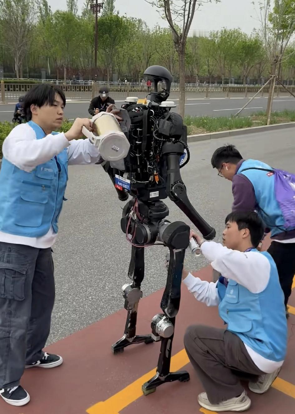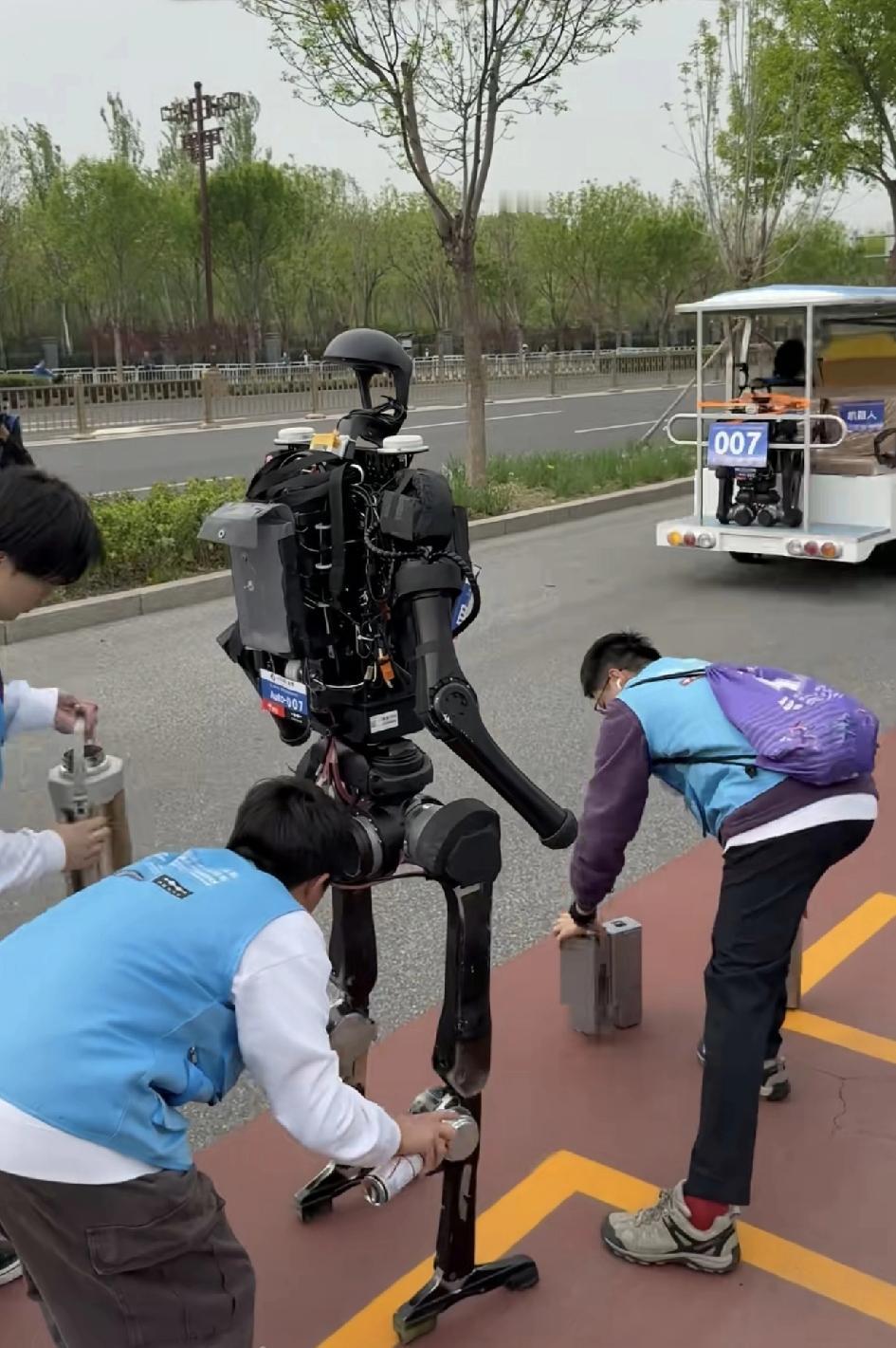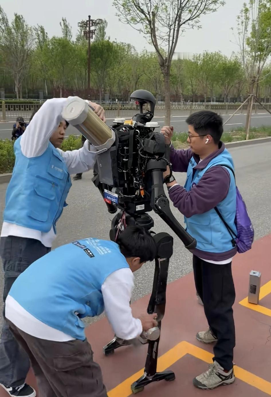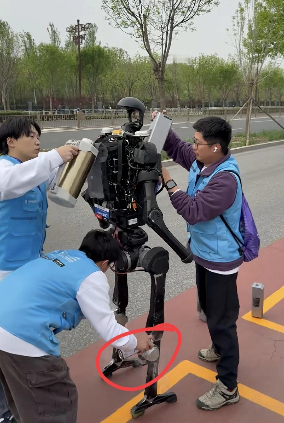 厉害了,哪怕你是机器人,跑马拉松中间也得补充能源,你跑马拉松自己给自己补给,但是人家机器人有三个人专门伺候着。一个负责遥控,一个喷正骨水活血化瘀,另一个更换能量电池,相当于这个喝了电解质功能饮料,最后一个是喝瓶藿香正气液,防止中暑。