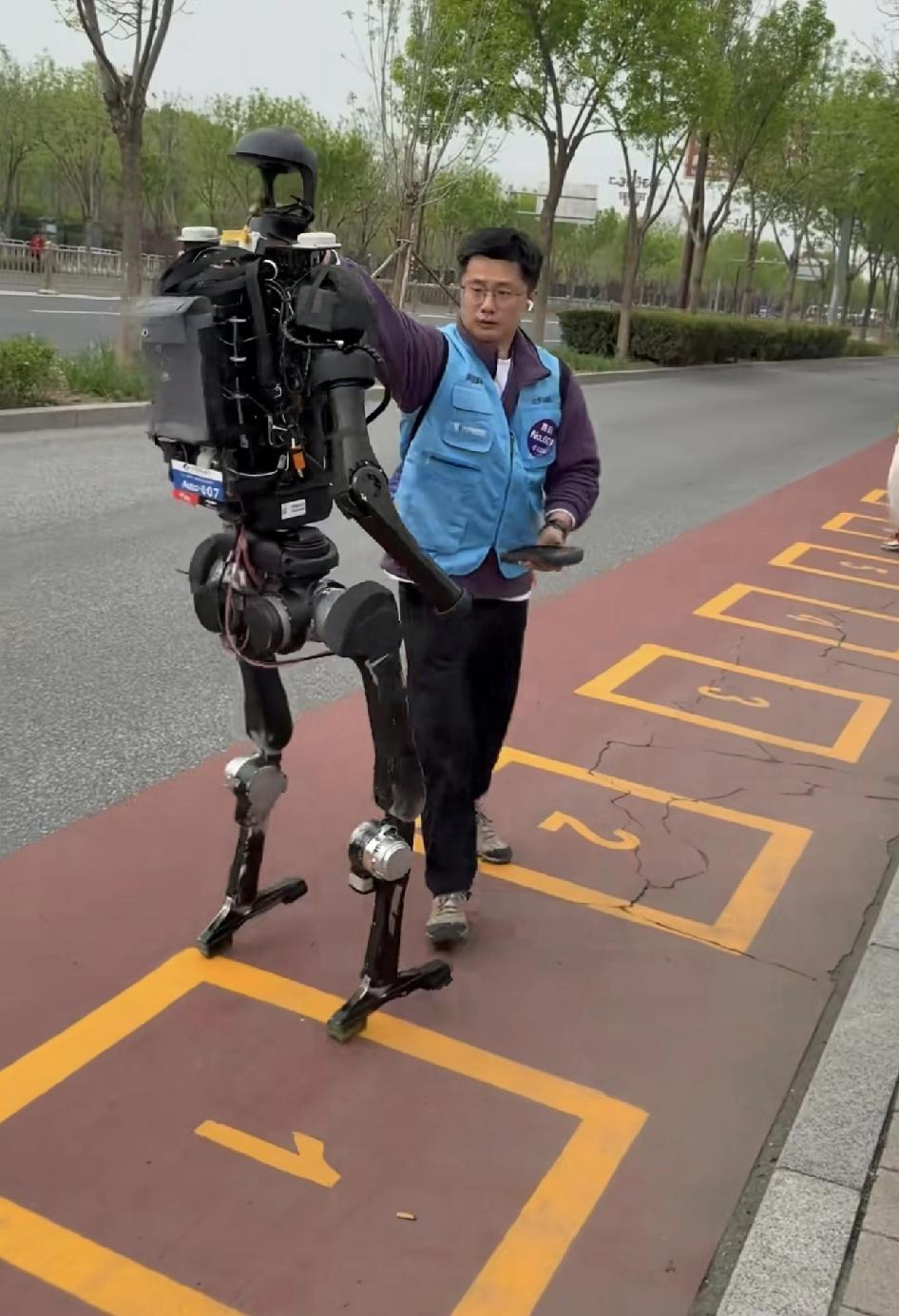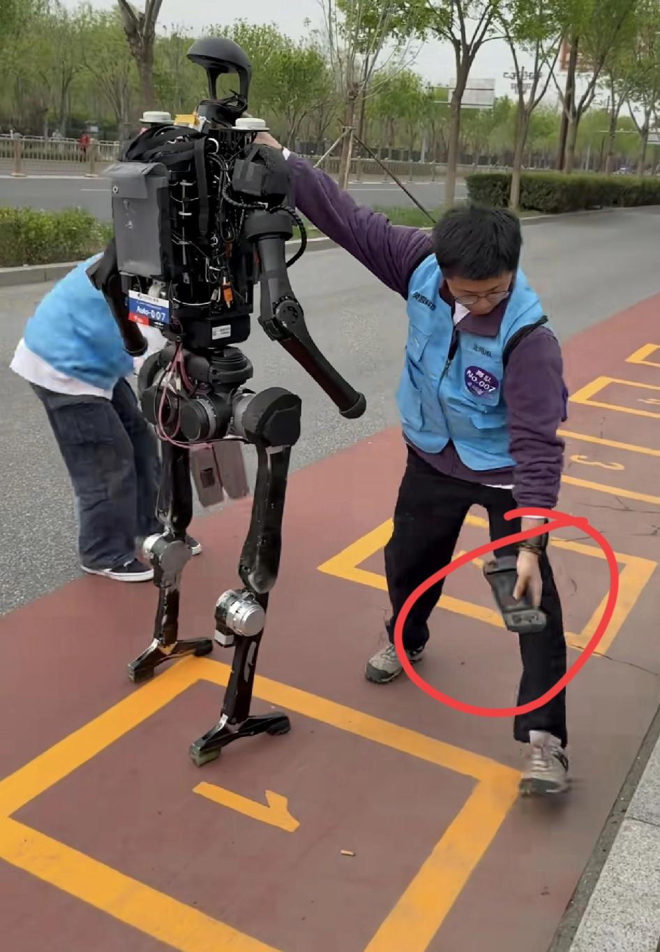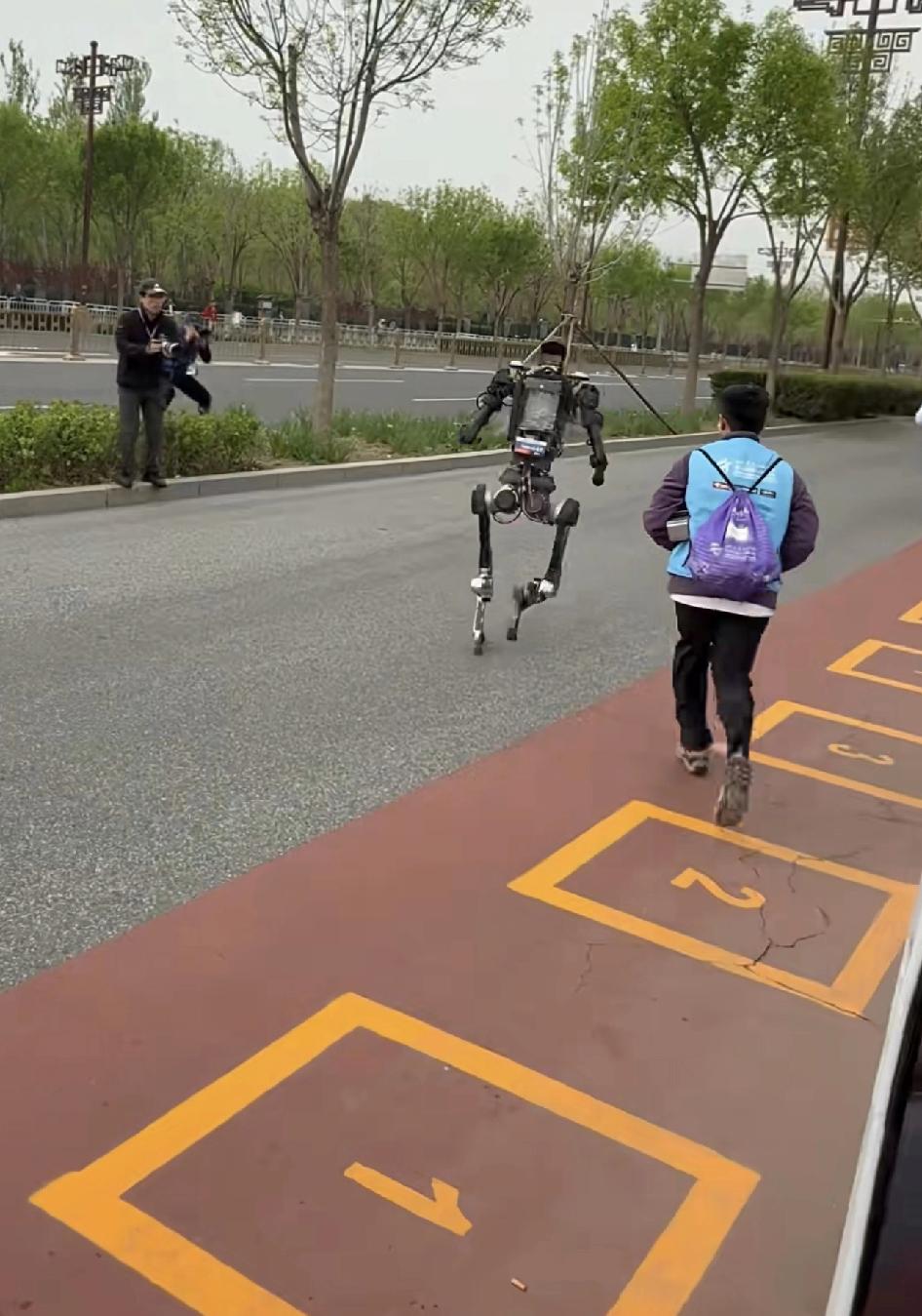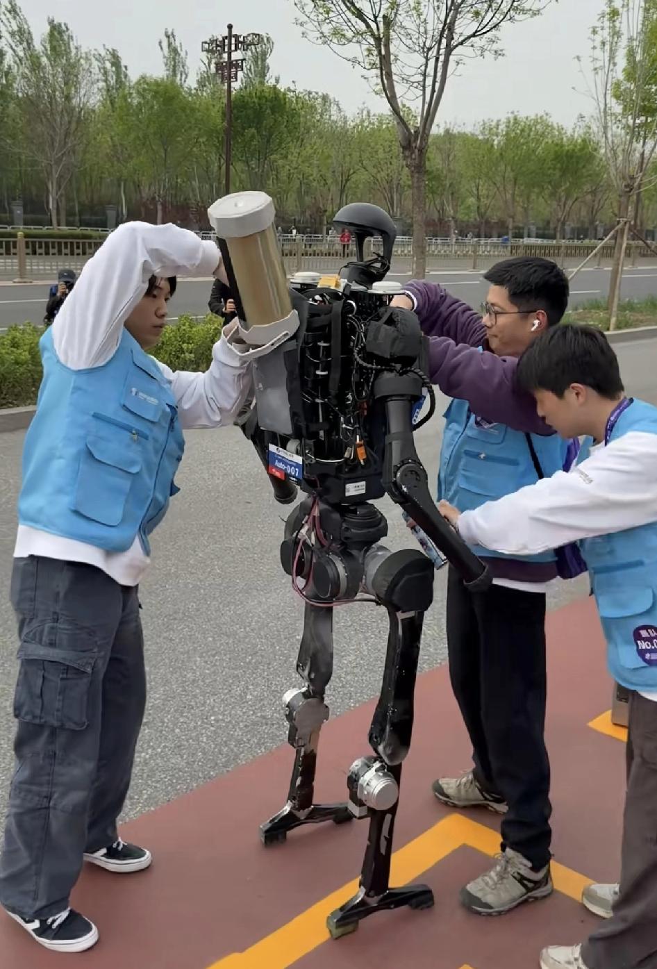 厉害了,哪怕你是机器人,跑马拉松中间也得补充能源,你跑马拉松自己给自己补给,但是人家机器人有三个人专门伺候着。一个负责遥控,一个喷正骨水活血化瘀,另一个更换能量电池,相当于这个喝了电解质功能饮料,最后一个是喝瓶藿香正气液,防止中暑。