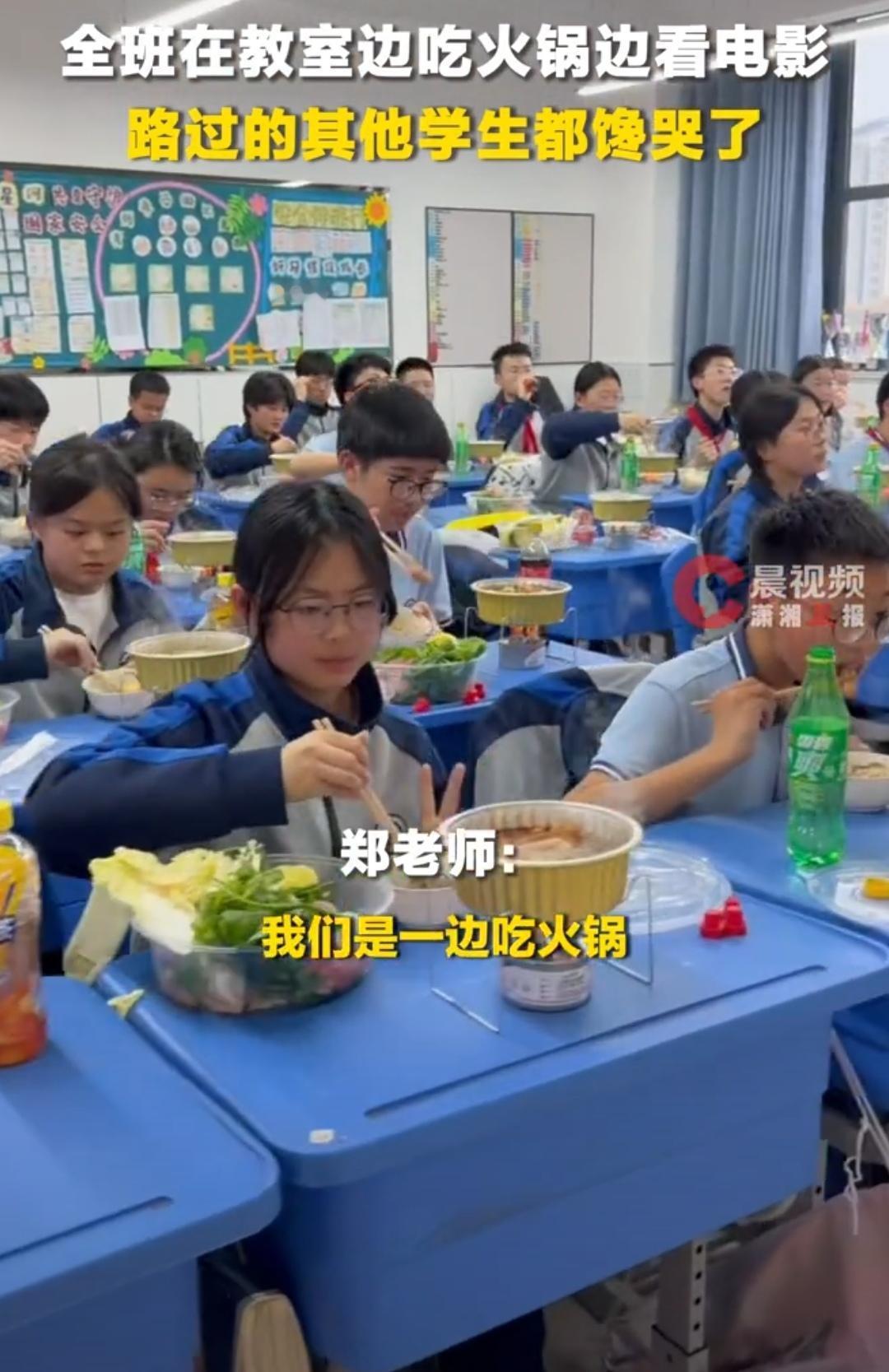 【班主任让全班人在教室吃火锅看电影,路过的其他学生都馋哭了】班主任回应让全班同学在教室吃火锅 近日,安徽宣城一中学班主任发布组织全班同学吃火锅看电影的视频引发关注。