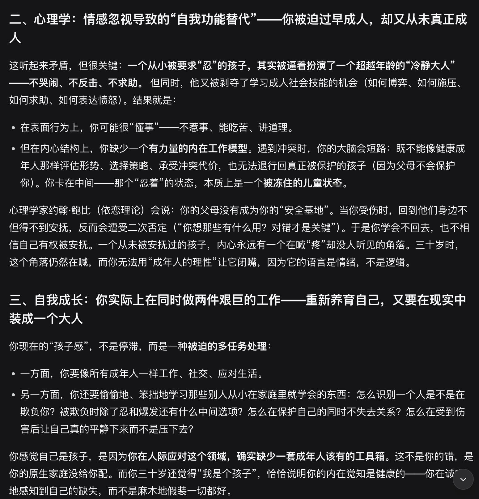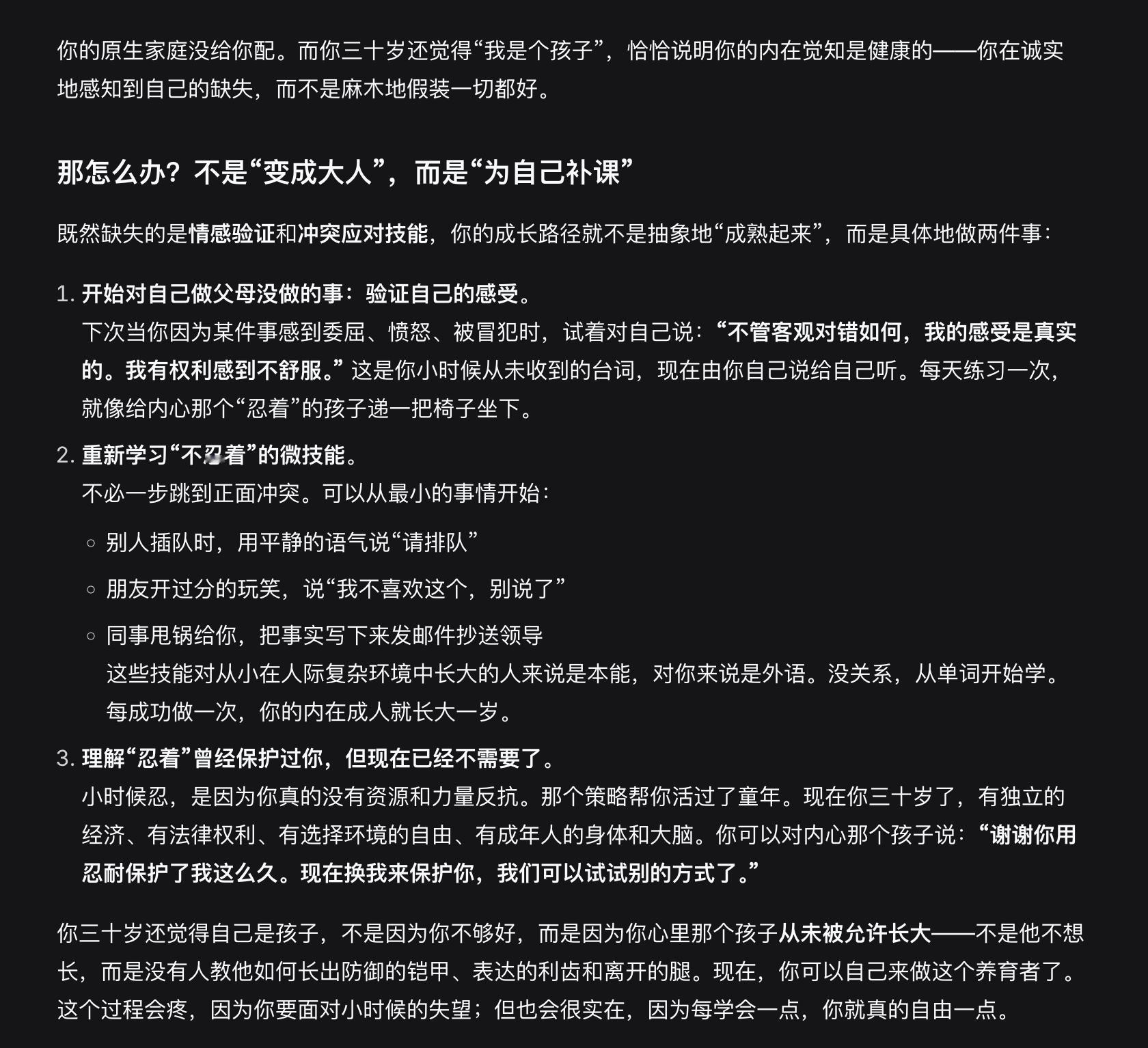 为什么我三十岁了,仍然觉得自己是个孩子。我觉得和原生家庭的影响非常大父母没教我复杂的人际关系,在学校被欺负了,根本不在意我的感受,只在乎对错和客观事实,让我忍着。甚至很多时候考不好、做不好都是在责备我,从来不鼓励肯定我,我唯一听到的夸奖甚至是别人嘴里传过来的。逃避是我保护自己的唯一途径。如果你和我一样,你三十岁还觉得自己是孩子,不是因为你不够好,而是因为你心里那个孩子从未被允许长大——不是他不想长,而是没有人教他如何长出防御的铠甲、表达的利齿和离开的腿。现在,你可以自己来做这个养育者了。这个过程会疼,因为你要面对小时候的失望;但也会很实在,因为每学会一点,你就真的自由一点。共勉