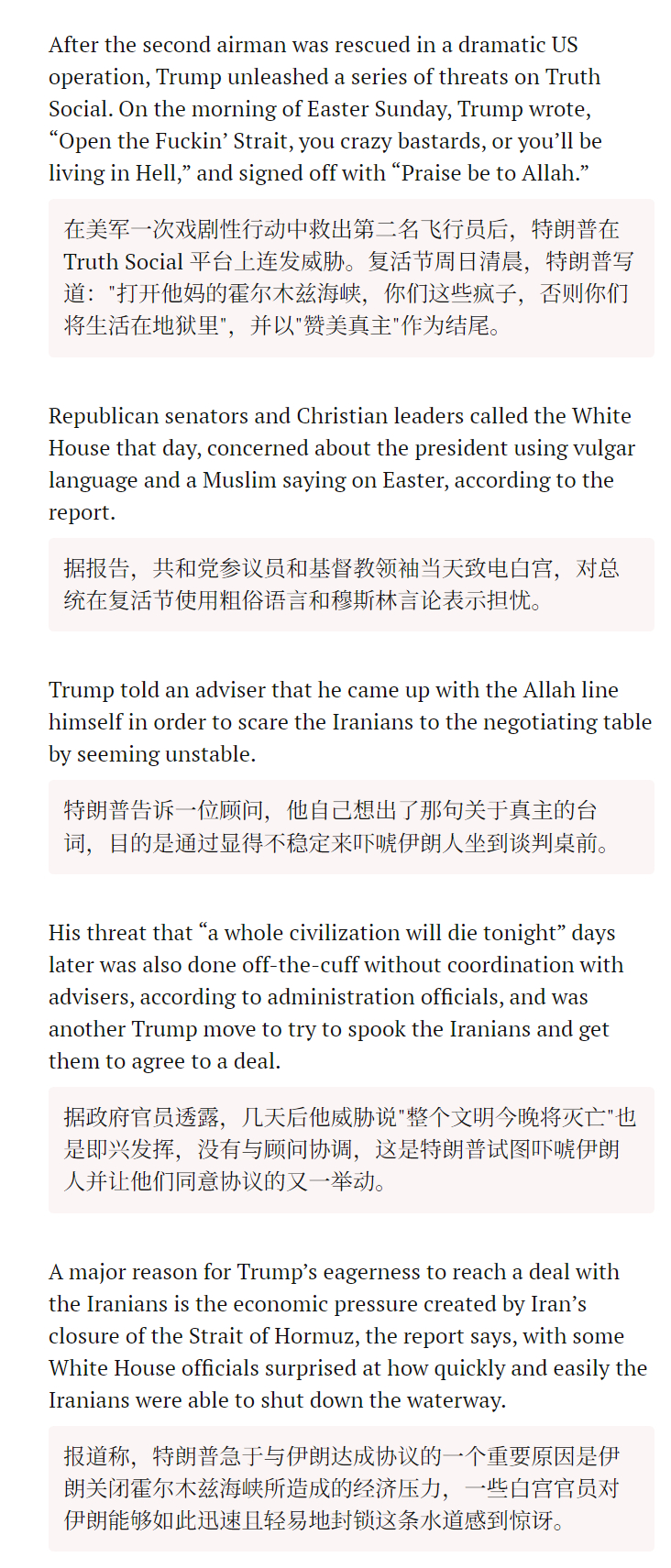 🔻特朗普刚刚发帖:“伊朗昨日决定在霍尔木兹海峡开火——这完全违反了我们的停火协议!许多子弹瞄准了一艘法国船只和一艘来自英国的货轮。这可不友好,对吧?我的代表们将前往巴基斯坦的伊斯兰堡——他们明晚抵达,进行谈判。伊朗最近宣布他们将关闭海峡,这很奇怪,因为我们的封锁已经将其关闭。他们在不知不觉中帮了我们,而关闭通道让他们每天损失 5 亿美元!美国则毫无损失。事实上,多艘船只正前往美国的德克萨斯、路易斯安那和阿拉斯加装载货物,这要感谢伊朗革命卫队,他们总想扮演“硬汉”!我们提供了一个非常公平合理的协议,我希望他们接受,因为如果他们不接受,美国将摧毁伊朗的每一座发电厂和每一座桥梁。别再当好人了!他们会迅速倒下,轻松倒下,如果他们不接受协议,我将荣幸地执行必须采取的行动,这本应在过去 47 年里由其他总统对伊朗实施。 是时候终结伊朗的杀戮机器了!唐纳德·J·特朗普总统特朗普。”🔻via realDonaldTrump🔻刚才我说什么来着?🔻《华尔街日报》:“特朗普告诉一位顾问,他自己想出了那句关于真主的台词,目的是通过显得不稳定来吓唬伊朗人坐到谈判桌前。据政府官员透露,几天后他威胁说"整个文明今晚将灭亡"也是即兴发挥,没有与顾问协调,这是特朗普试图吓唬伊朗人并让他们同意协议的又一举动。报道称,特朗普急于与伊朗达成协议的一个重要原因是伊朗关闭霍尔木兹海峡所造成的经济压力,一些白宫官员对伊朗能够如此迅速且轻易地封锁这条水道感到惊讶。特朗普在未征求顾问意见的情况下,草率地做出了关于伊朗战争的关键决策,并急于达成停火协议以应对不断上涨的燃料价格。”中东局势48小时极致反转伊斯兰堡两大酒店通知住客离店海外新鲜事中东现场直击