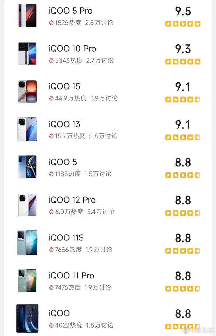 翻完这张iQOO历代评分表,突然有点感慨。当年的iQOO 5 Pro直接杀到9.5分封神,后面的数字旗舰也各有高光,iQOO 15、13热度直接拉满。但也能看到,有些型号的口碑波动确实大,比如15 Ultra热度高但评分掉得厉害。从最早的初代到现在,iQOO在性能赛道上卷了这么多年,有巅峰也有争议。用过哪台的来聊聊?你的iQOO是哪一代?数码