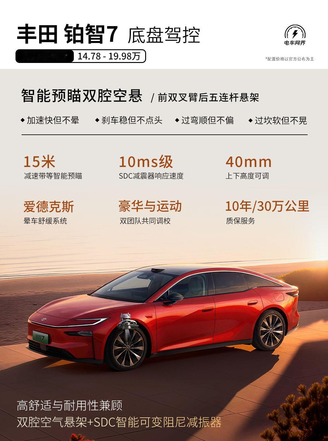 简单来说,铂智7是一台有丰田的品质打底,又将华为鸿蒙生态、Momenta的智能化塞进一台532车身里的纯电旗舰家轿。并且全系价格都压到20万以内。在18万价位就能拥有双腔空悬+SDC电磁减震这么高阶的底盘硬件,再配合丰田的精细调校,最终呈现出30万+级的驾乘高级感,这在同级中是极具竞争力的。【来自懂车帝车友圈】