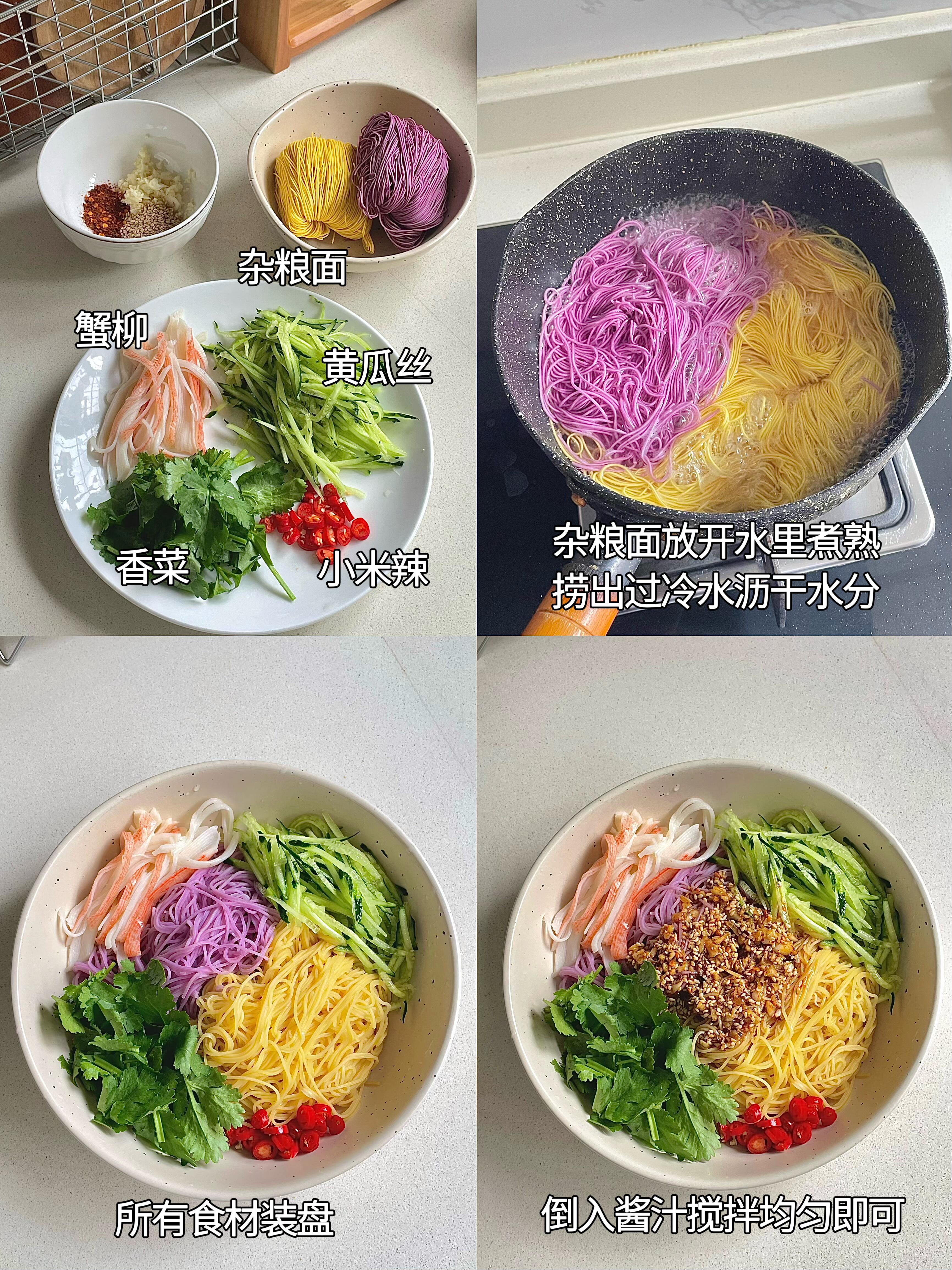 低卡又清爽,彩色杂粮面QQ弹弹,裹上脆嫩的黄瓜丝和鲜美的蟹柳,再淋上灵魂蒜香酱汁,撒点香菜和小米椒提味,酸辣开胃,一口下去浑身都清爽,好吃还没负担~