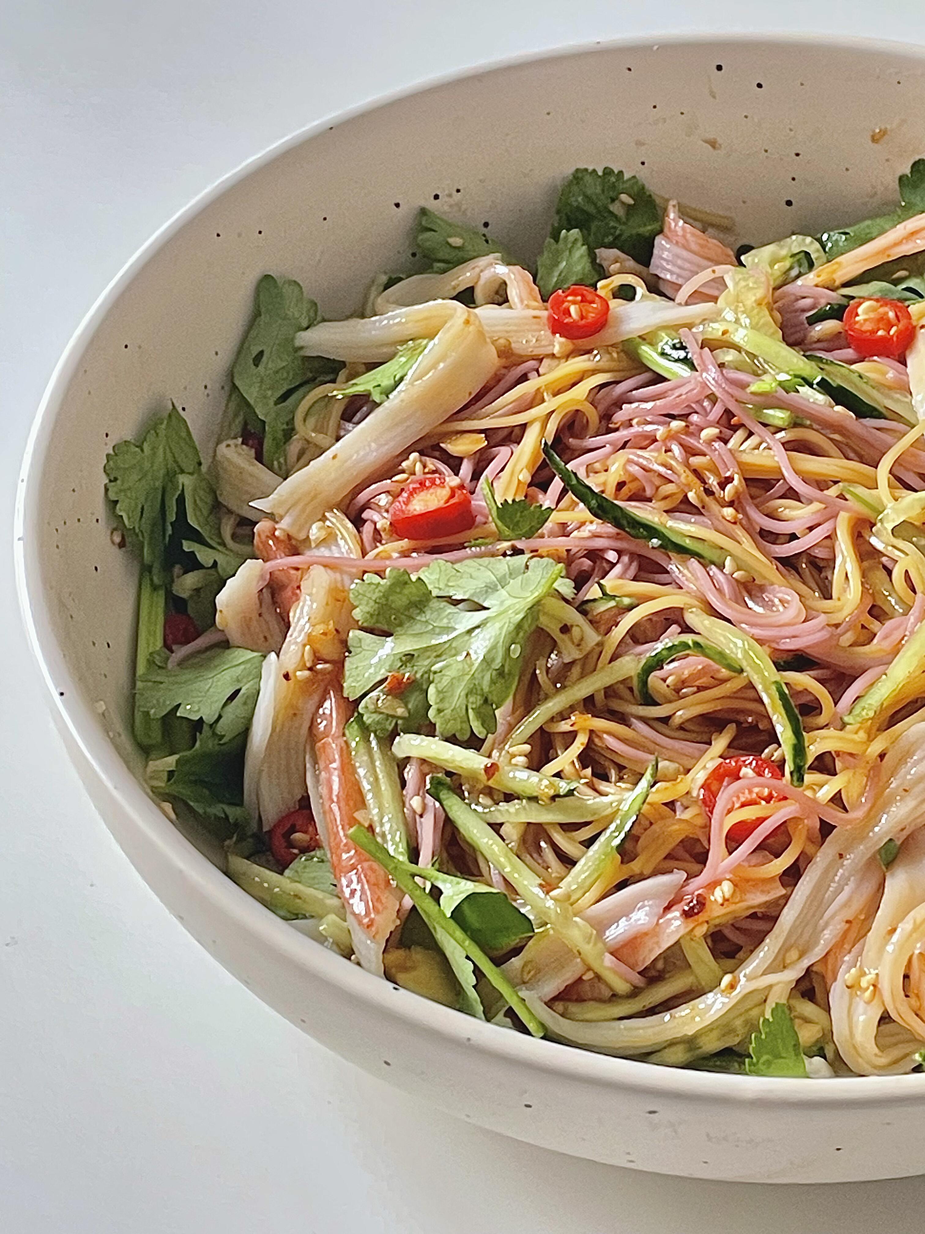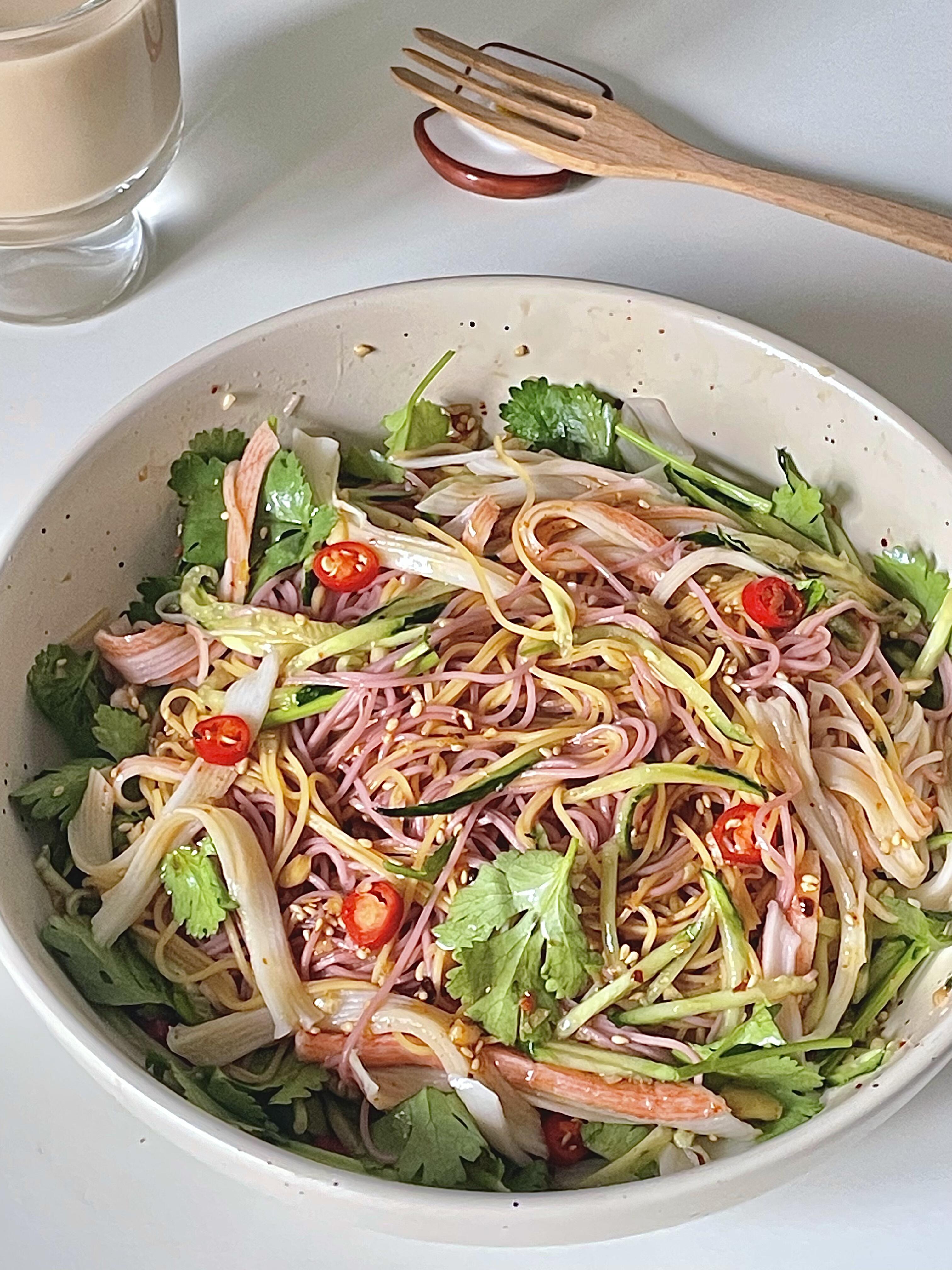 天气一热就没胃口?不想吃油腻大餐,就来碗黄瓜蟹柳拌杂粮面,真的太对味了!