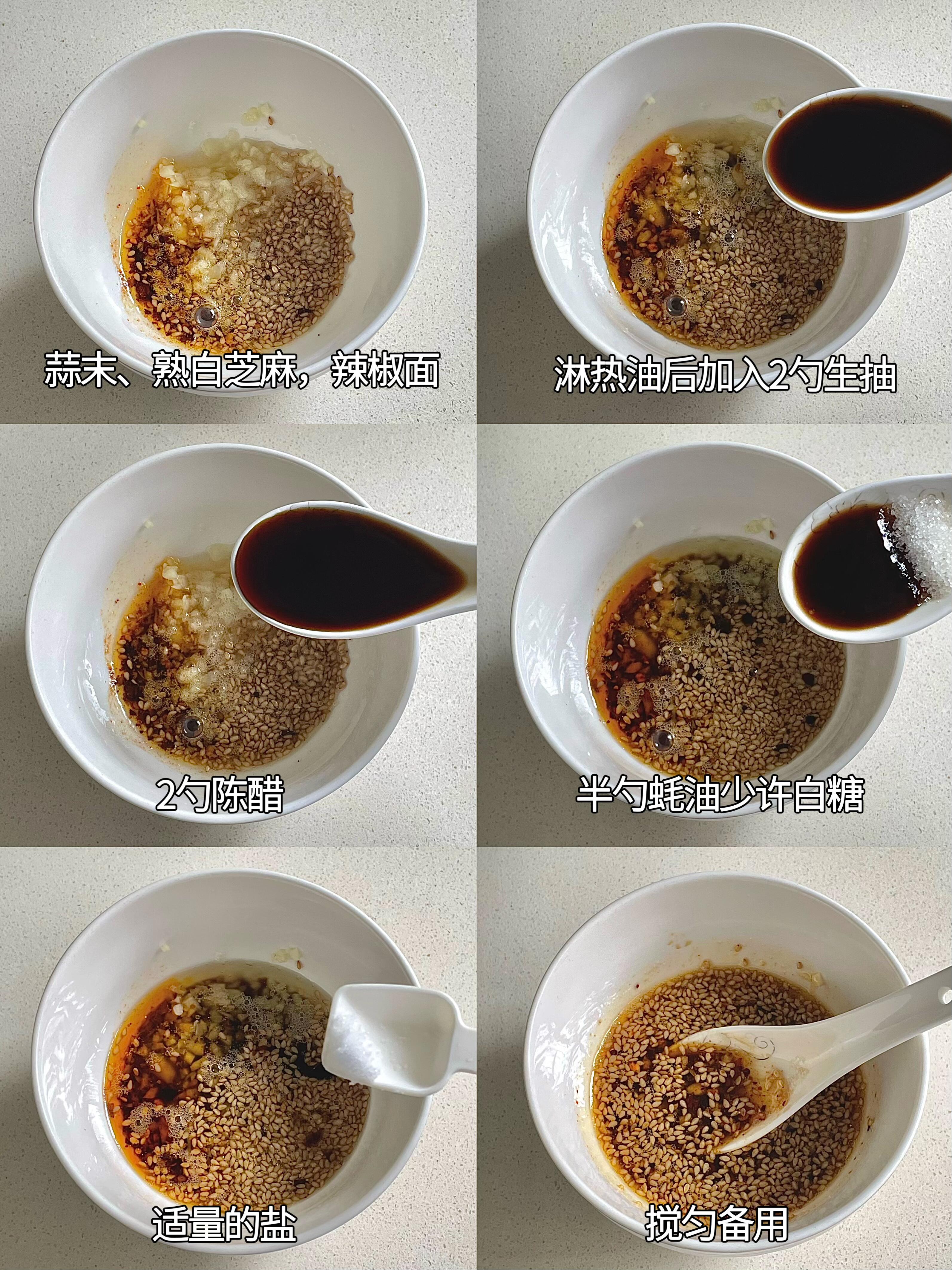蒜末和辣椒面、熟芝麻一起放进碗里,浇一勺滚烫的热油,激出浓郁蒜香和椒香;接着加2勺生抽、2勺陈醋、半勺蚝油,放少许糖和盐调味,用筷子搅拌均匀,静置1分钟让味道融合。