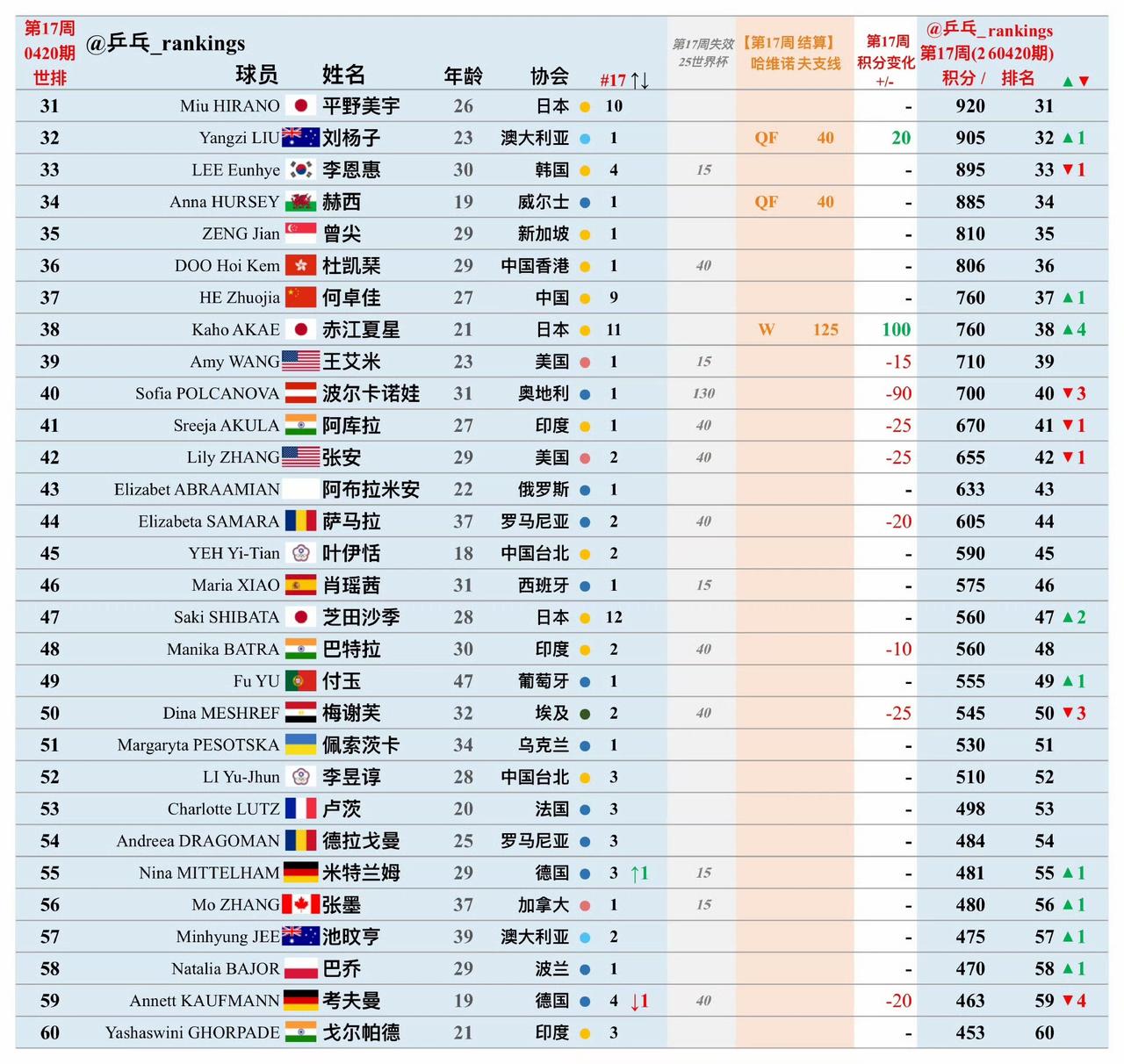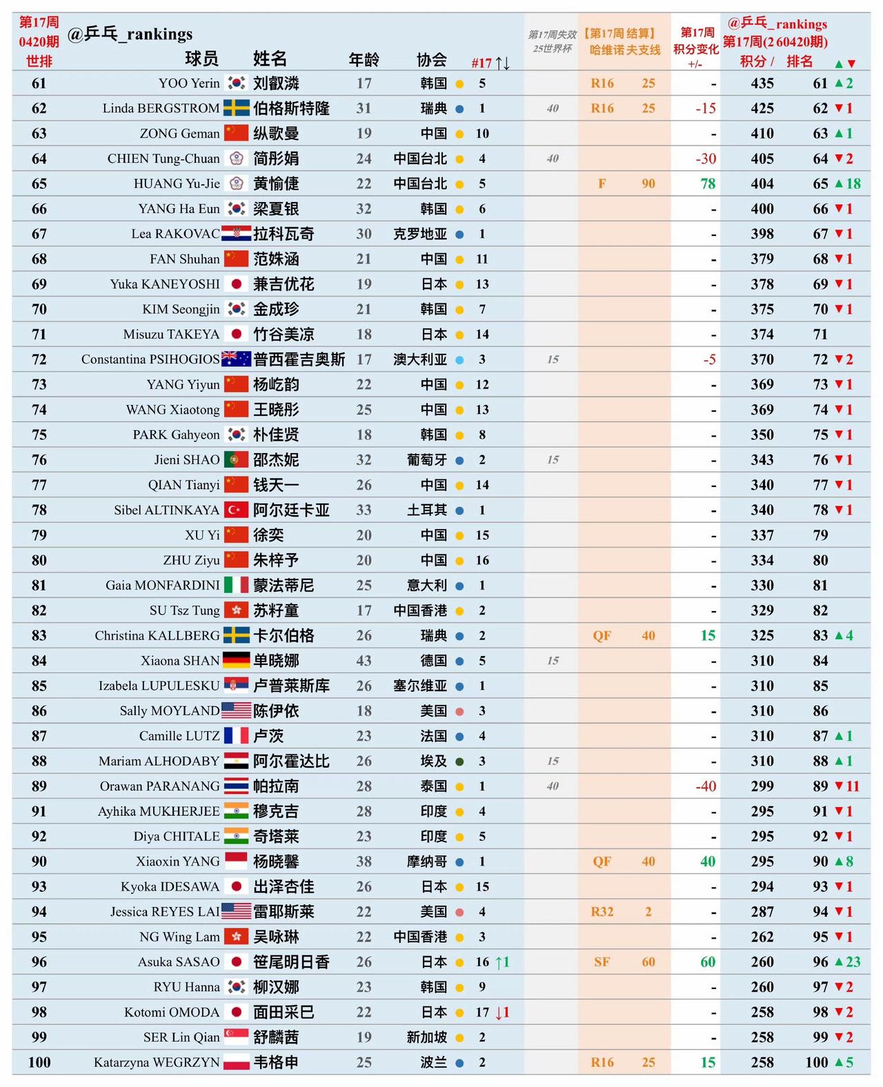 国际乒联第17周(2026年4月20)女单项目世界排名及积分如图所示。