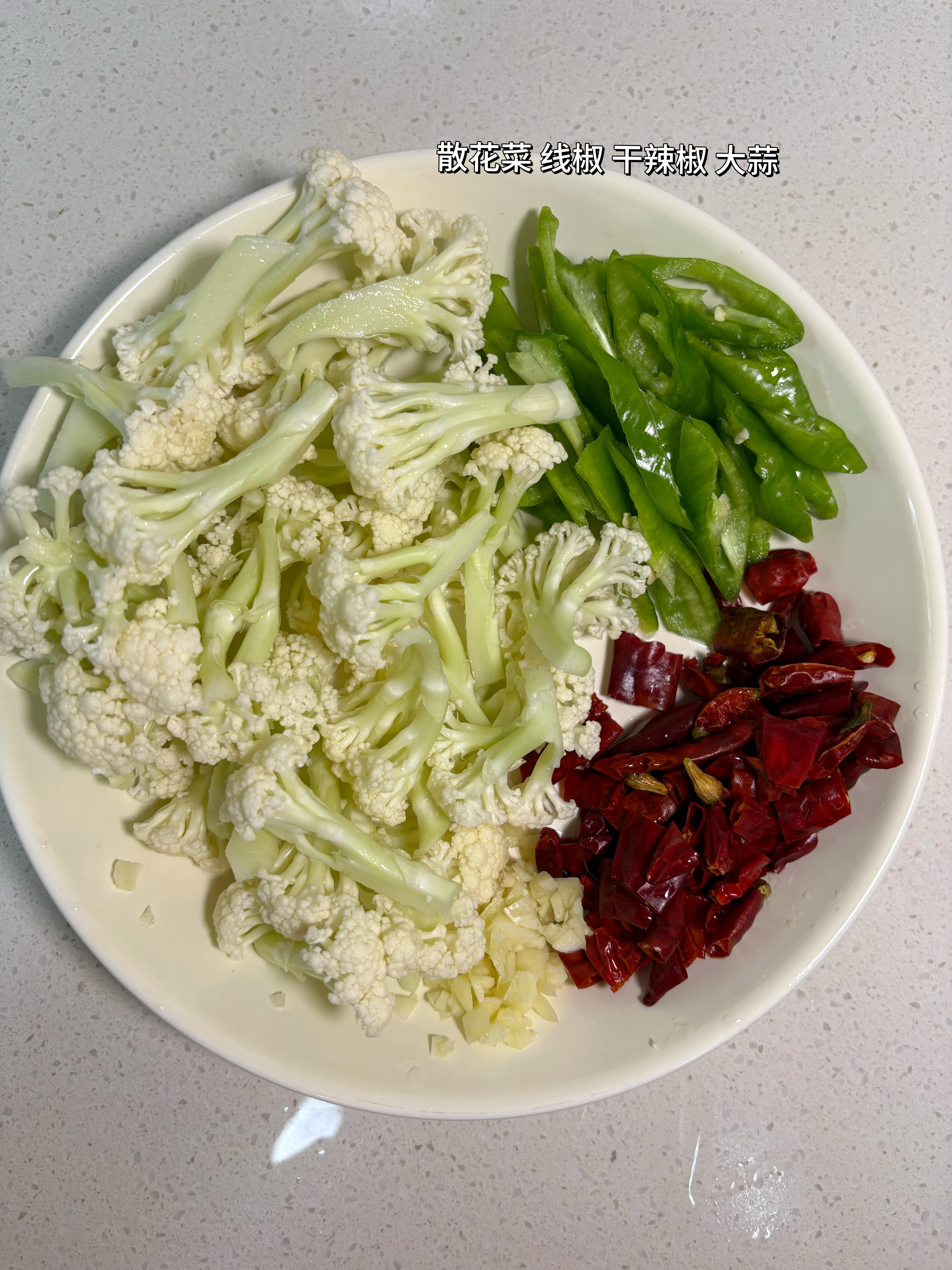 1. 花菜切成均匀的小朵,洗净后彻底沥干水分(这步别省,避免炒的时候出水,影响口感)。