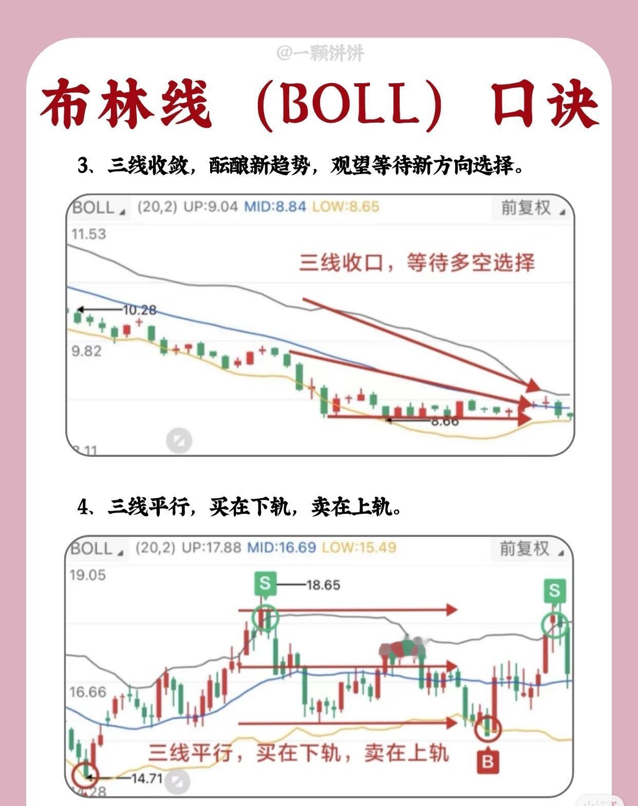 (注:布林线参数为默认的(20,2),实战中可结合周期、成交量等因素综合判断,口诀仅为初步交易逻辑的总结。)