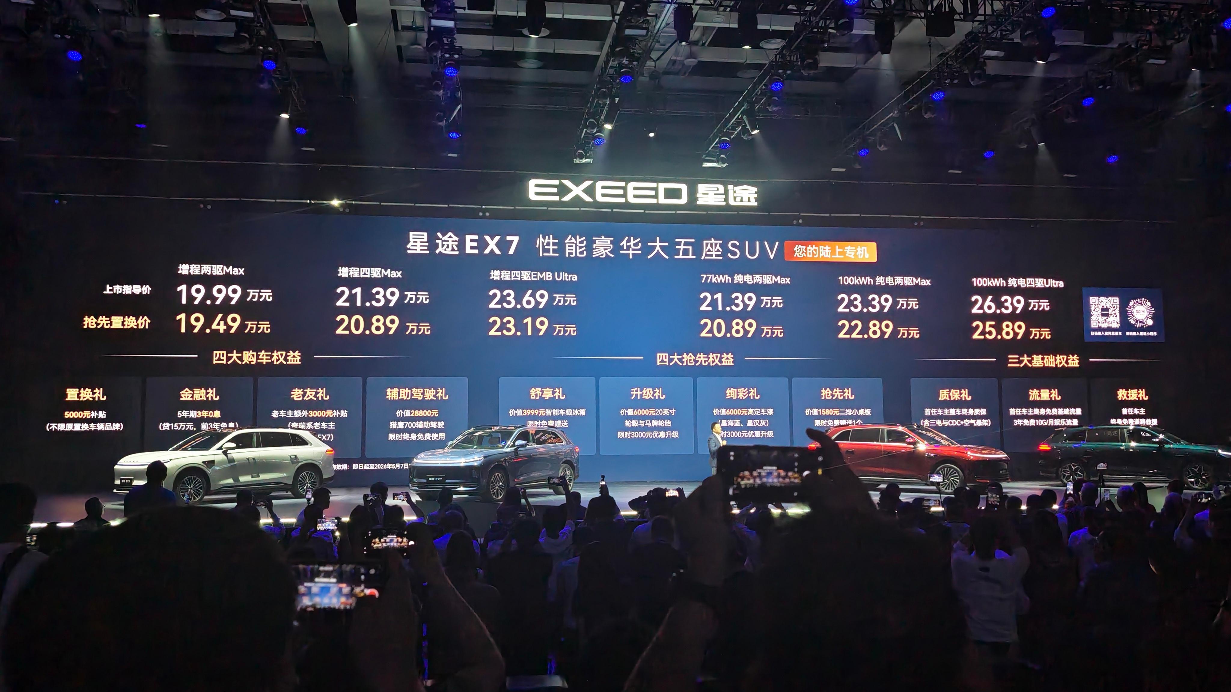 性能豪华大五座SUV星途EX7正式上市就在今晚星途EX7全球上市,价格终于来了,6款配置覆盖增程和纯电,增程两驱Max 19.99万,置换后更是低至19.49万,在20-30万价位诚意很足。奇瑞还是那个低调务实的理科男,不玩套路,安心性能这块一直很靠谱。全球首搭航空级EMB线控制动,电信号响应更快,刹停更稳,再加上三路冗余安全架构,日常开着特别安心。飞鱼底盘3.0加雪豹四驱2.0,操控稳得像在平流层飞行,大车也灵活好开。全系标配猎鹰700智驾,8295P智舱、座椅按摩、冷暖冰箱一应俱全,再加上四重抢先权益,家用、舒适、性能一步到位。不堆噱头只做实在技术,这样的车真的很值得冲,你们觉得怎么样?全球首发航空级EMB线控制动