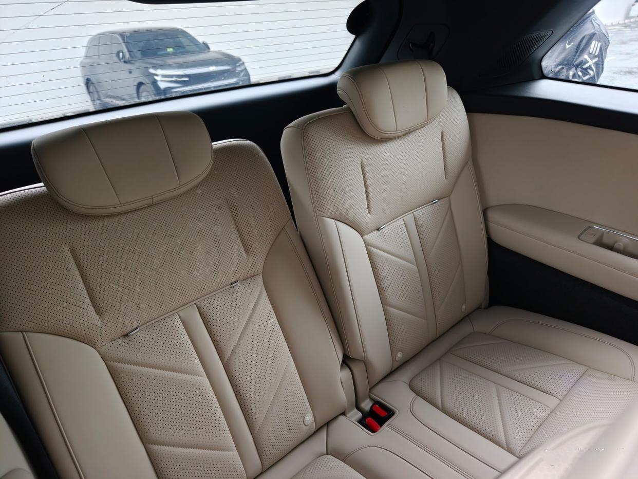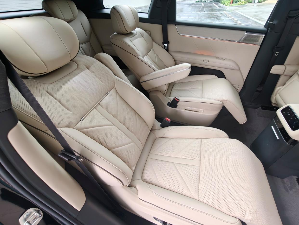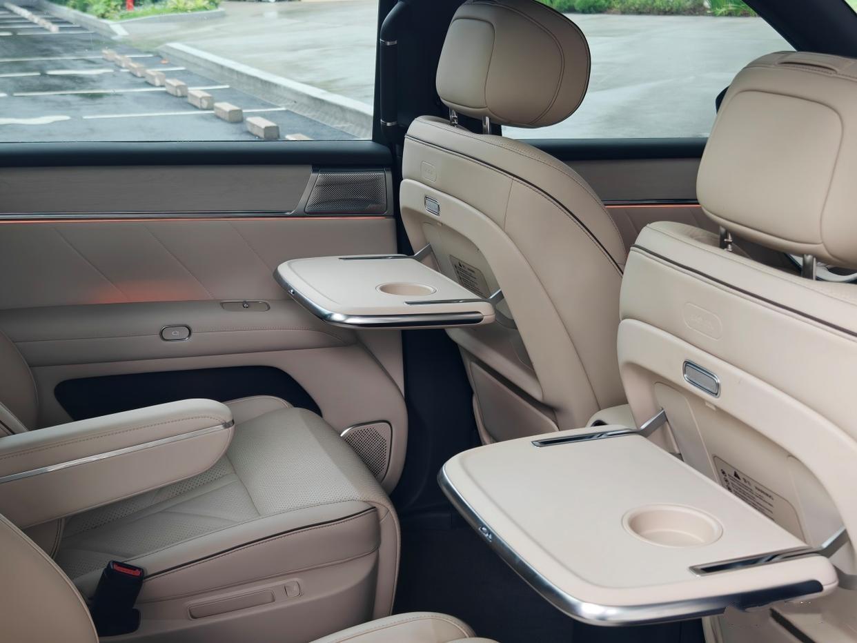 二排舒适度拉满,小桌板、冷暖冰箱都有,中间地台纯平,过道宽度够用,老人小孩进出第三排不用挤来挤去。