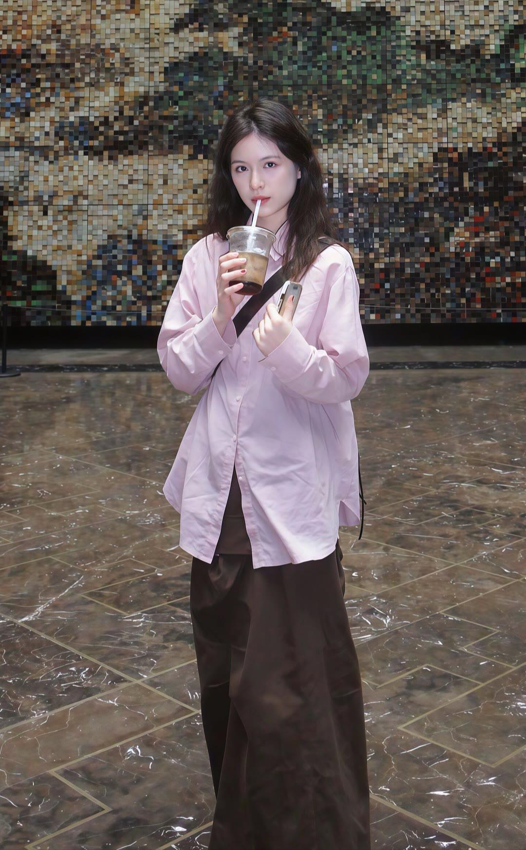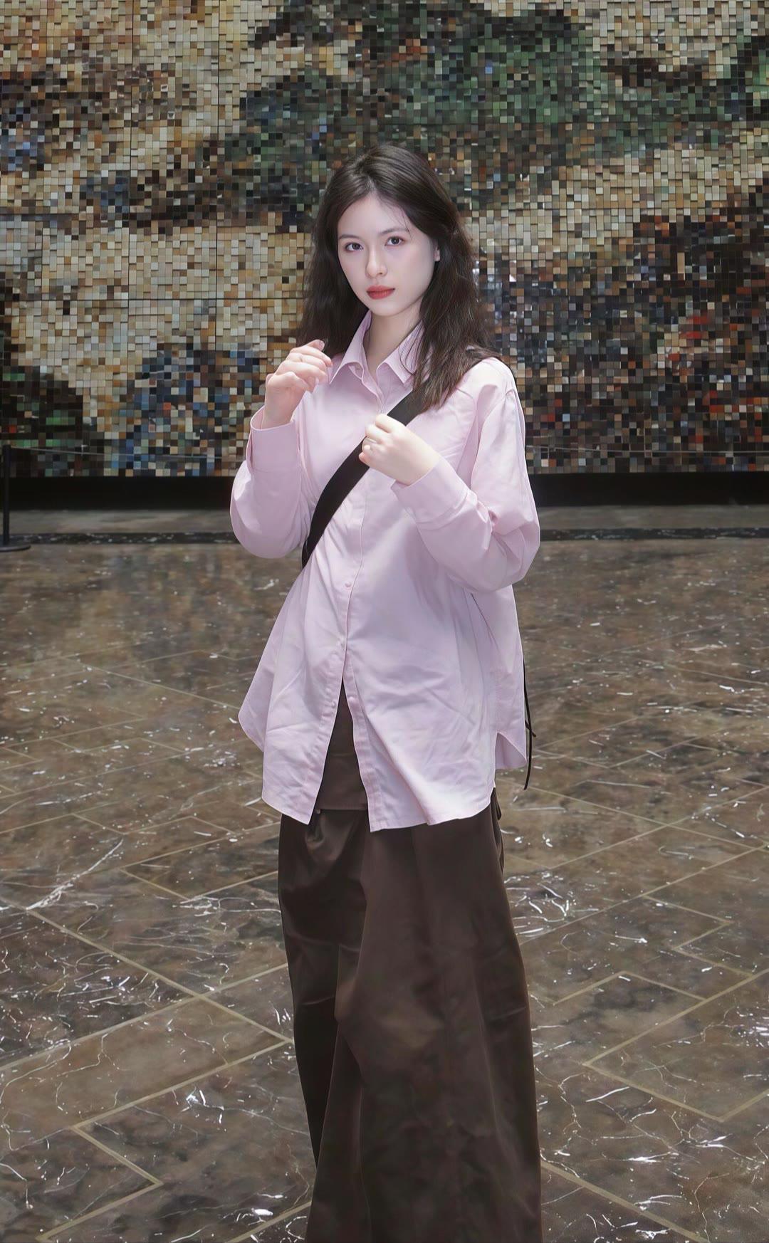 王濛的衬衫竟然不是一件拼接衬衫,而是用两件衬衫合在一起的,淡粉配淡蓝