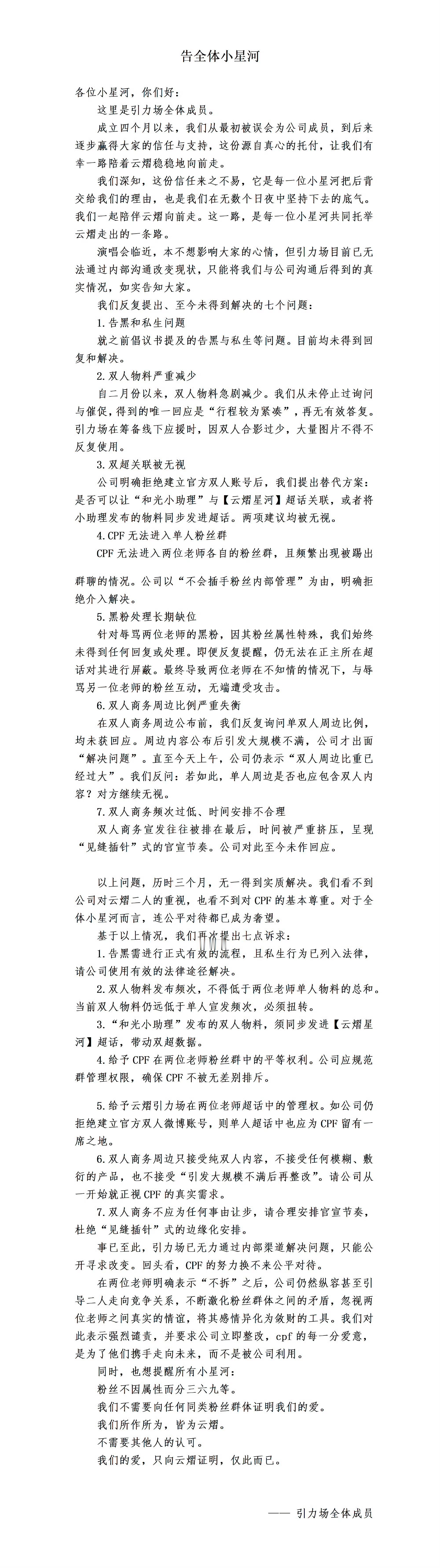 云熠星河维权 云熠星河CP粉发文:提出至今未解决的七个问题,云旗、郝熠然双人物料严重减少,cp粉无法进入单人粉丝群,双人周边商务比例严重失调等,要求尊重cp粉。