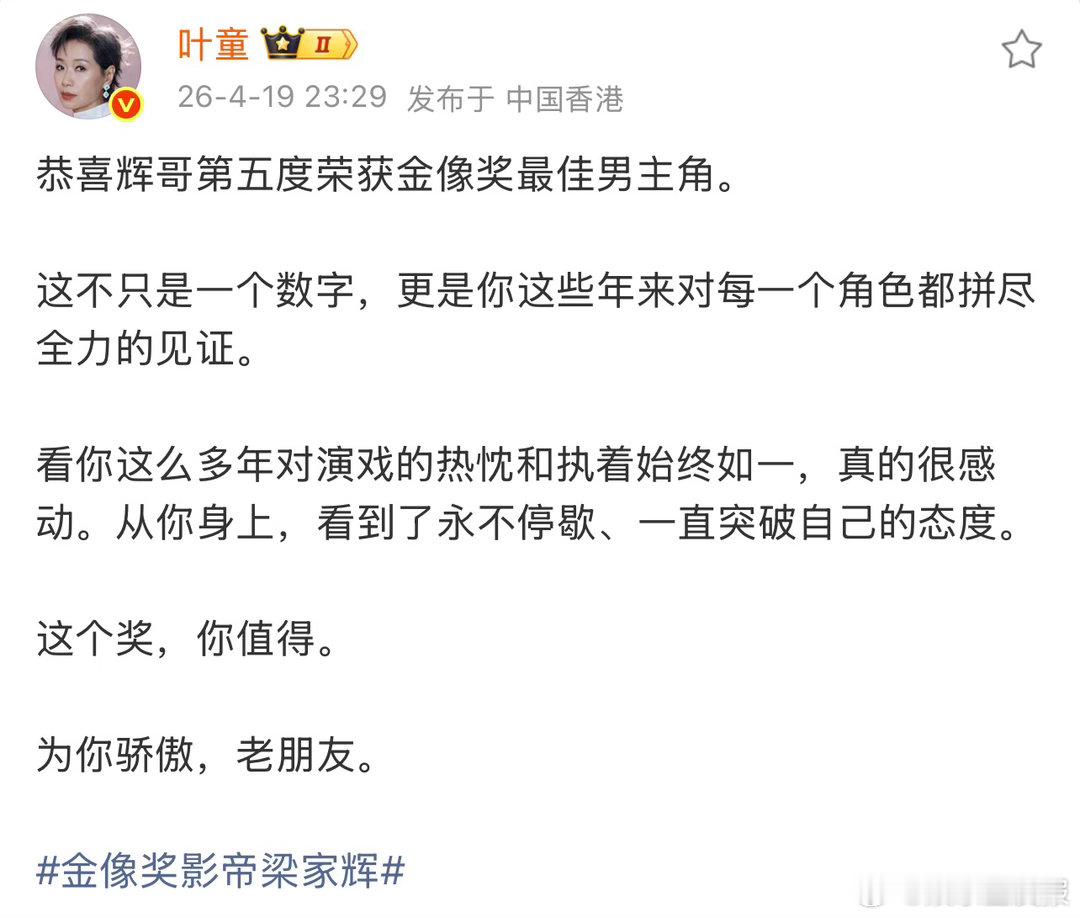 叶童恭喜梁家辉获金像奖最佳男主角 梁家辉五封金像奖影帝,也在第一时间发文送上祝福