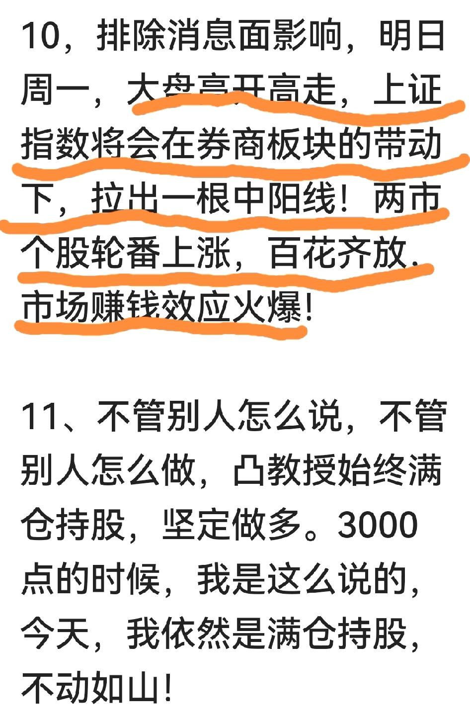 “夜已深”,凸教授的观点与很多大咖的预判恰恰相反:排除消息面影响,大盘高开高走,上证指数将在券商板块的带动下,拉出一根中阳线。