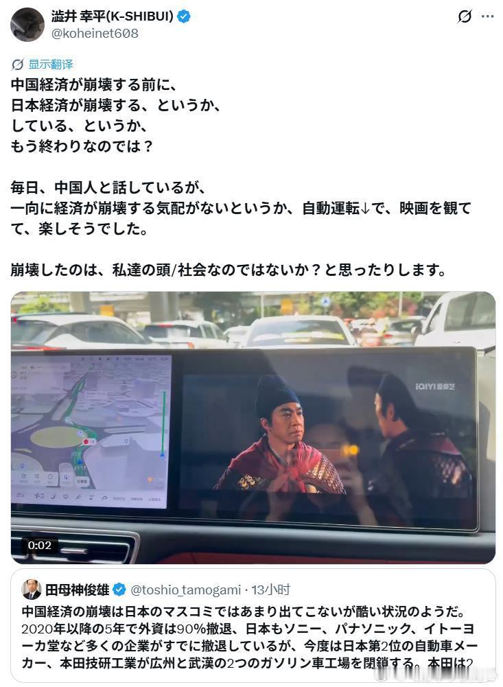 在中国经济崩溃之前,日本经济反而会先崩溃,或者说,已经在崩溃了,或者说,是不是已经结束了?我每天都在和中国人交流,却完全看不到经济要崩溃的迹象。他们坐着自动驾驶(车),一边看电影,看起来很开心。有时候我会想,真正崩溃的,会不会是我们的认知/社会?