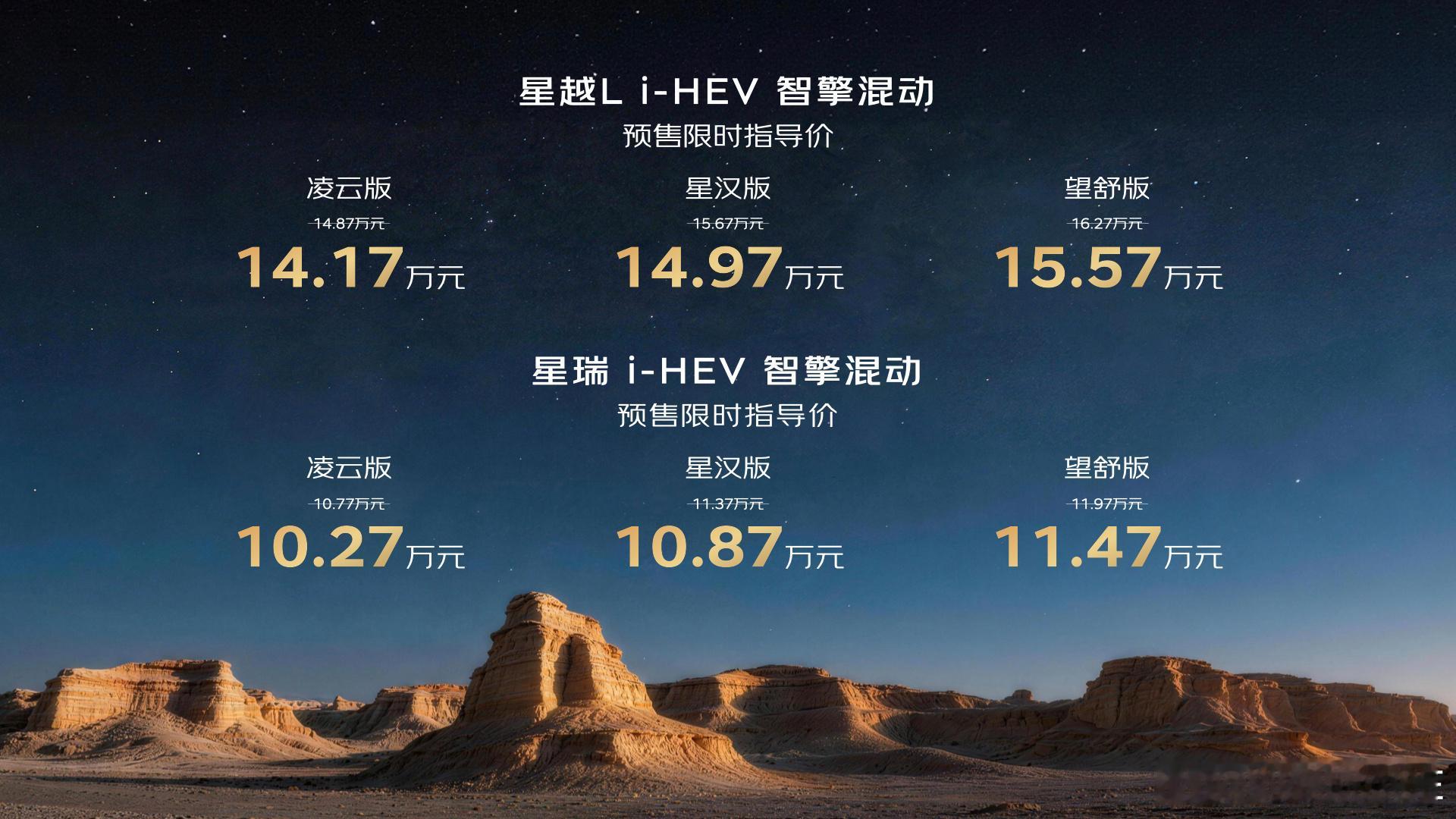 刚刚在新疆乌尔禾,见证了吉利中国星i-HEV智擎混动双车预售。在魔鬼城这种极致环境里发新车,价格先看:• 星瑞i-HEV:10.77万-11.97万