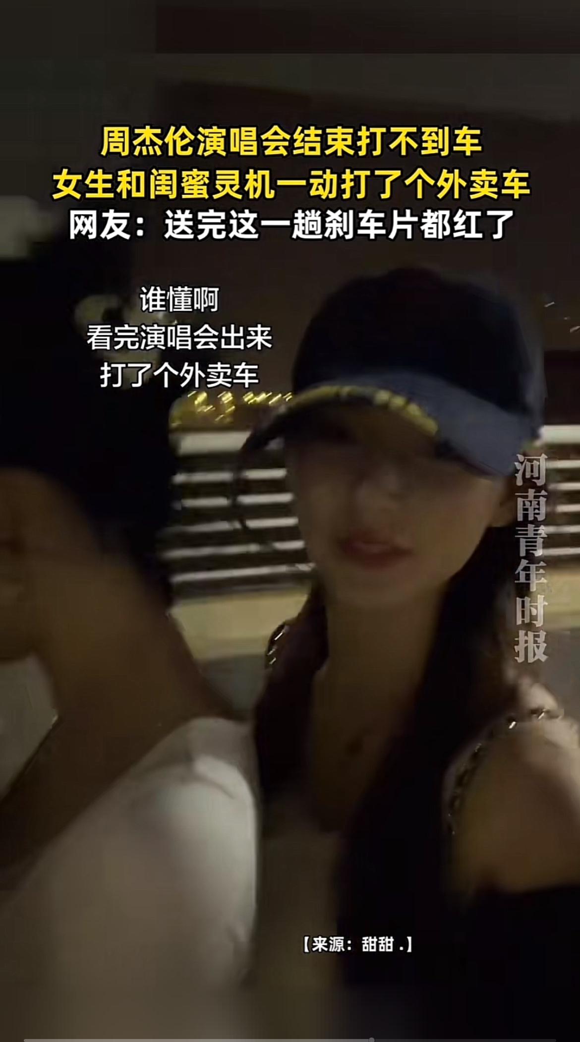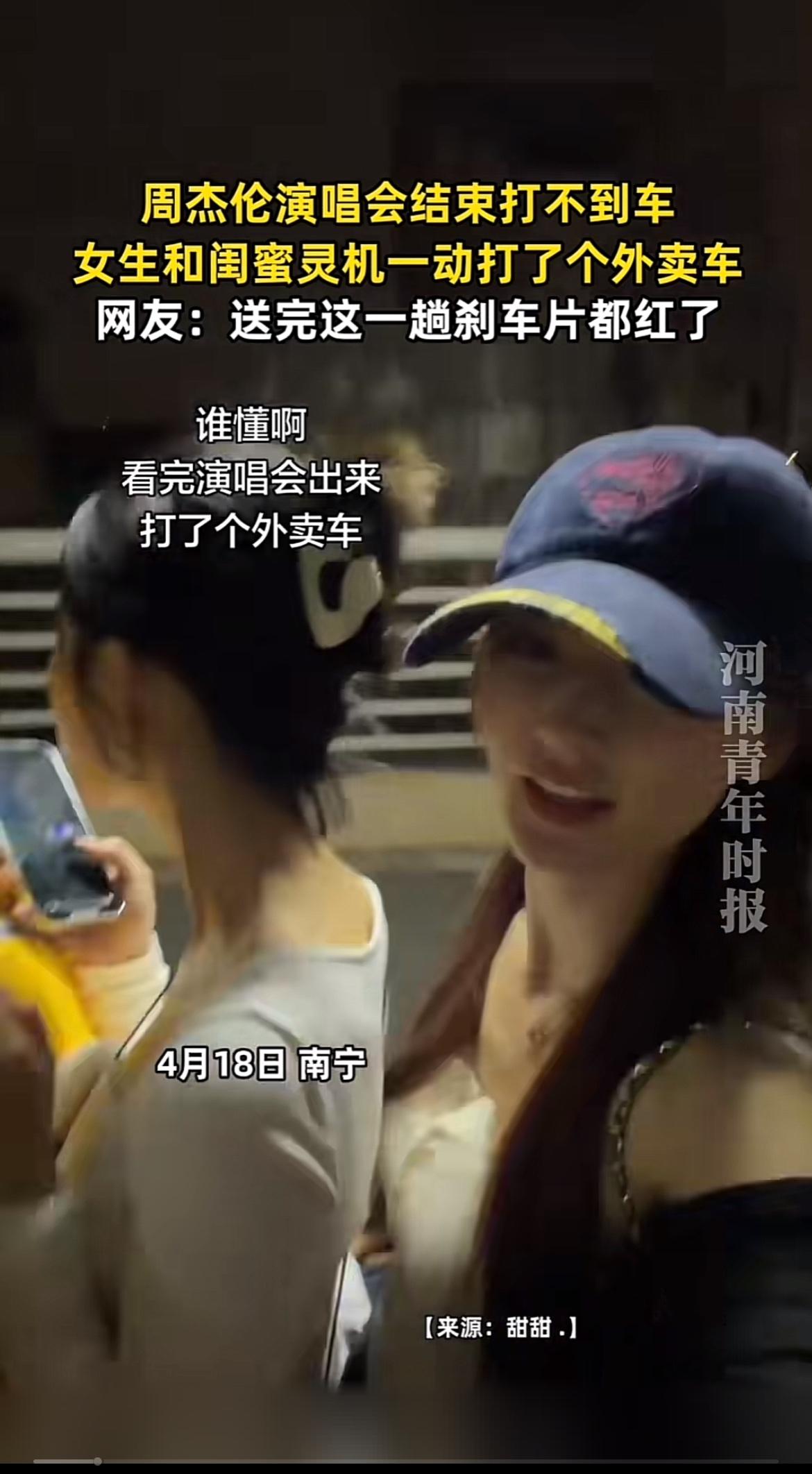 周杰伦演唱会散场后的“返程大战”太有看头了!4月17 - 19日在南宁连开三场,散场时奥体中心外马路被歌迷堵得水泄不通。俩女生打开打车软件,前方排队187人,预计等超1小时。这时闺蜜小李灵机一动,点外卖让小哥送回家。