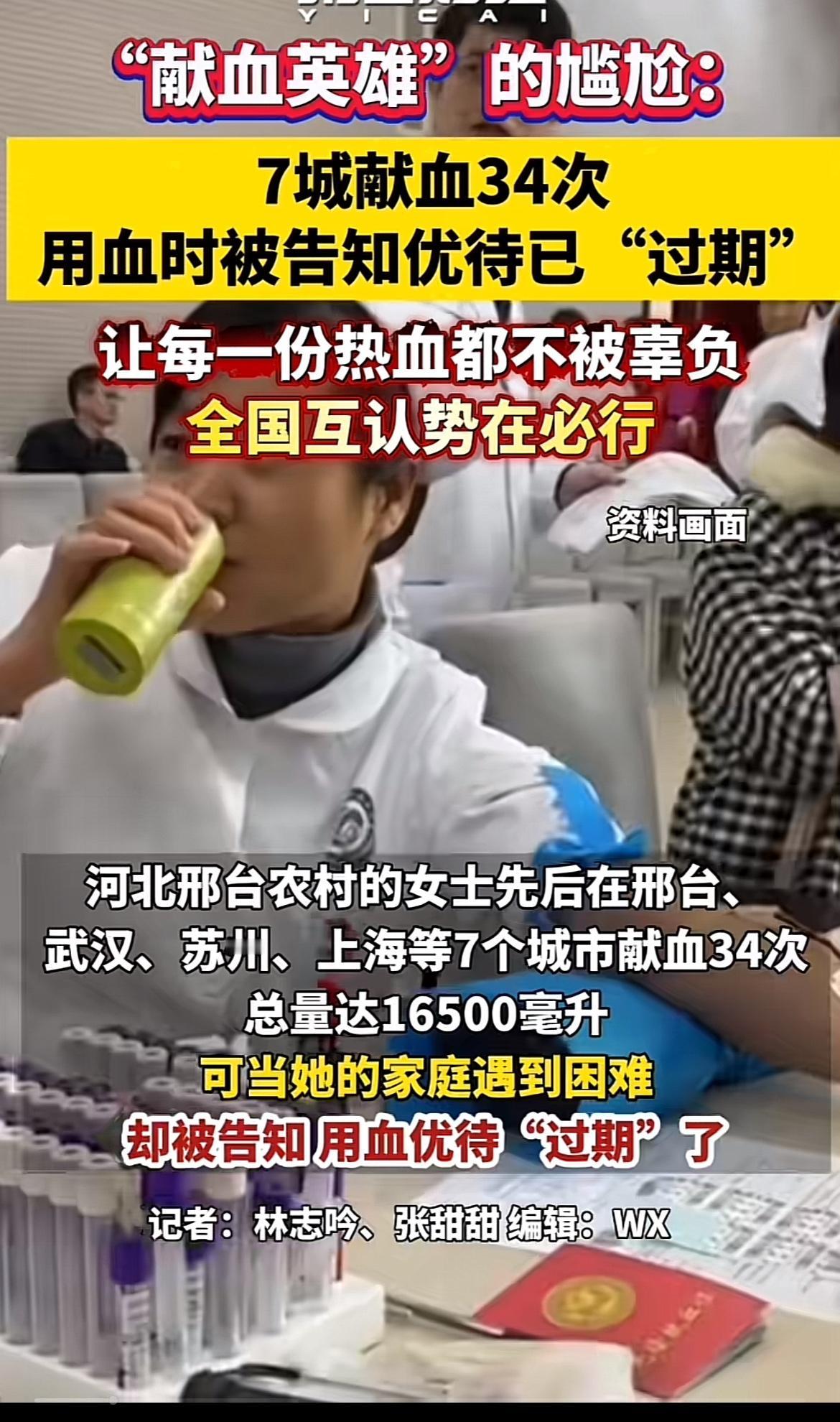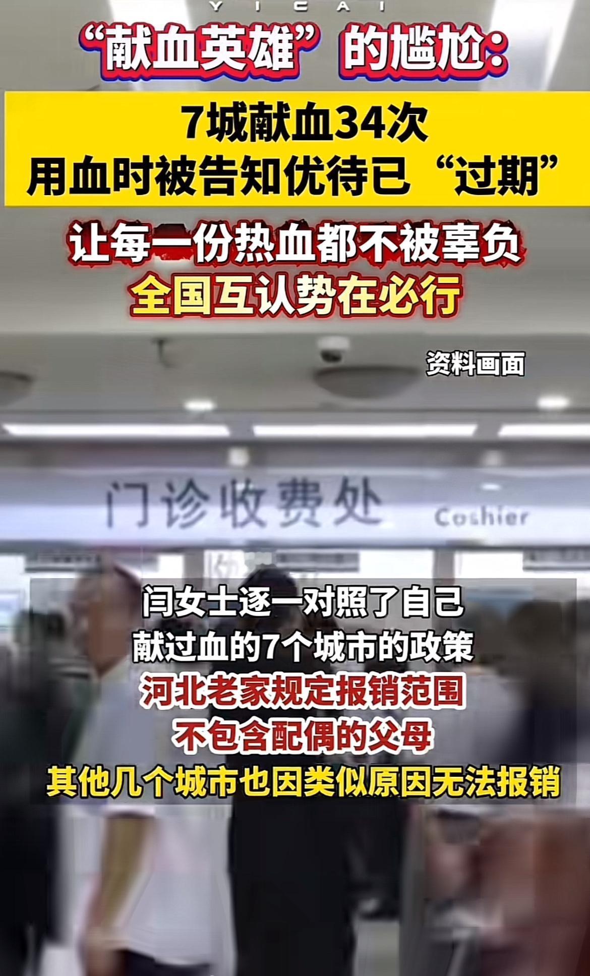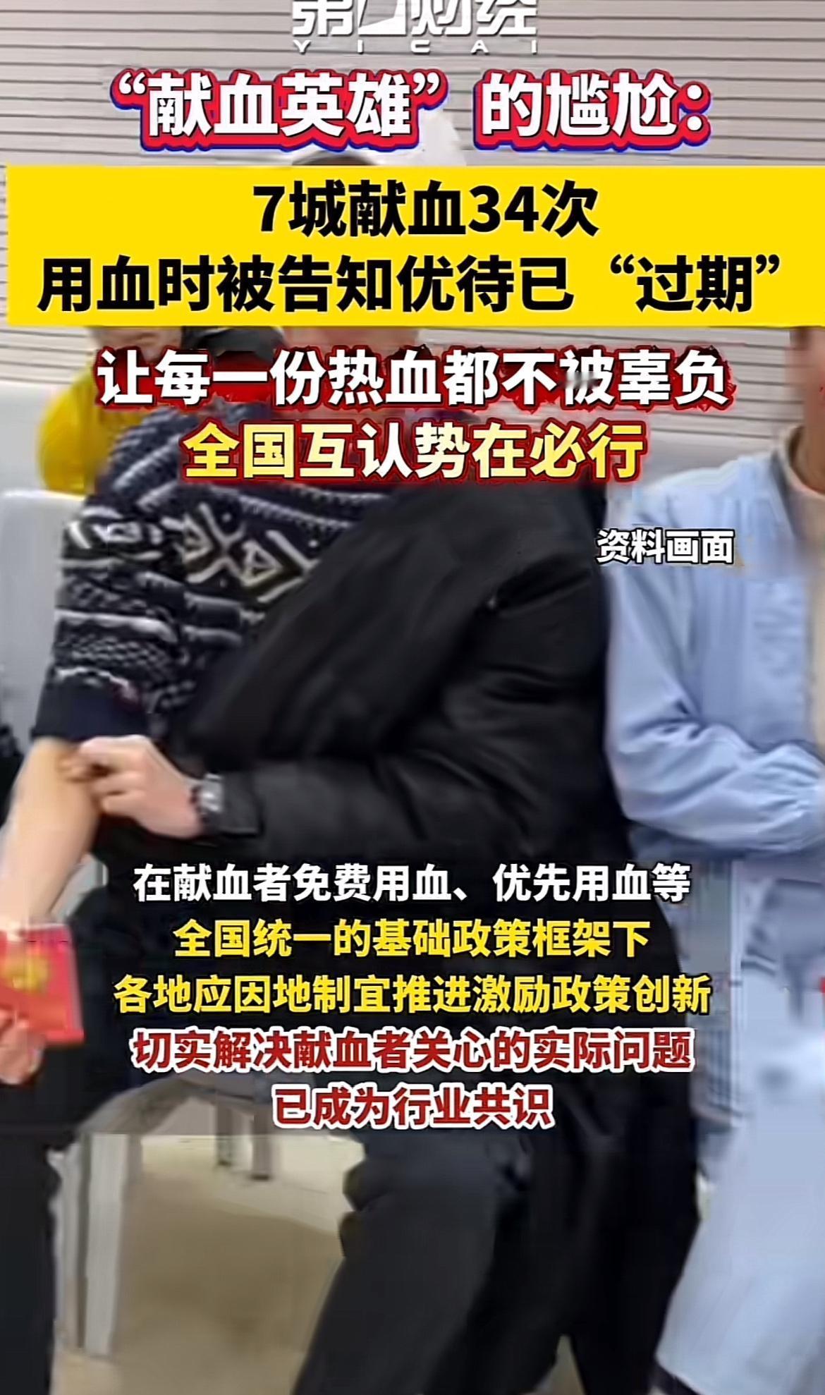 闫女士在7个城市献血34次,堪称“献血英雄”。本以为这份善举能在家人用血时发挥作用,结果却被告知优待已“过期”,这真让人尴尬又心寒。