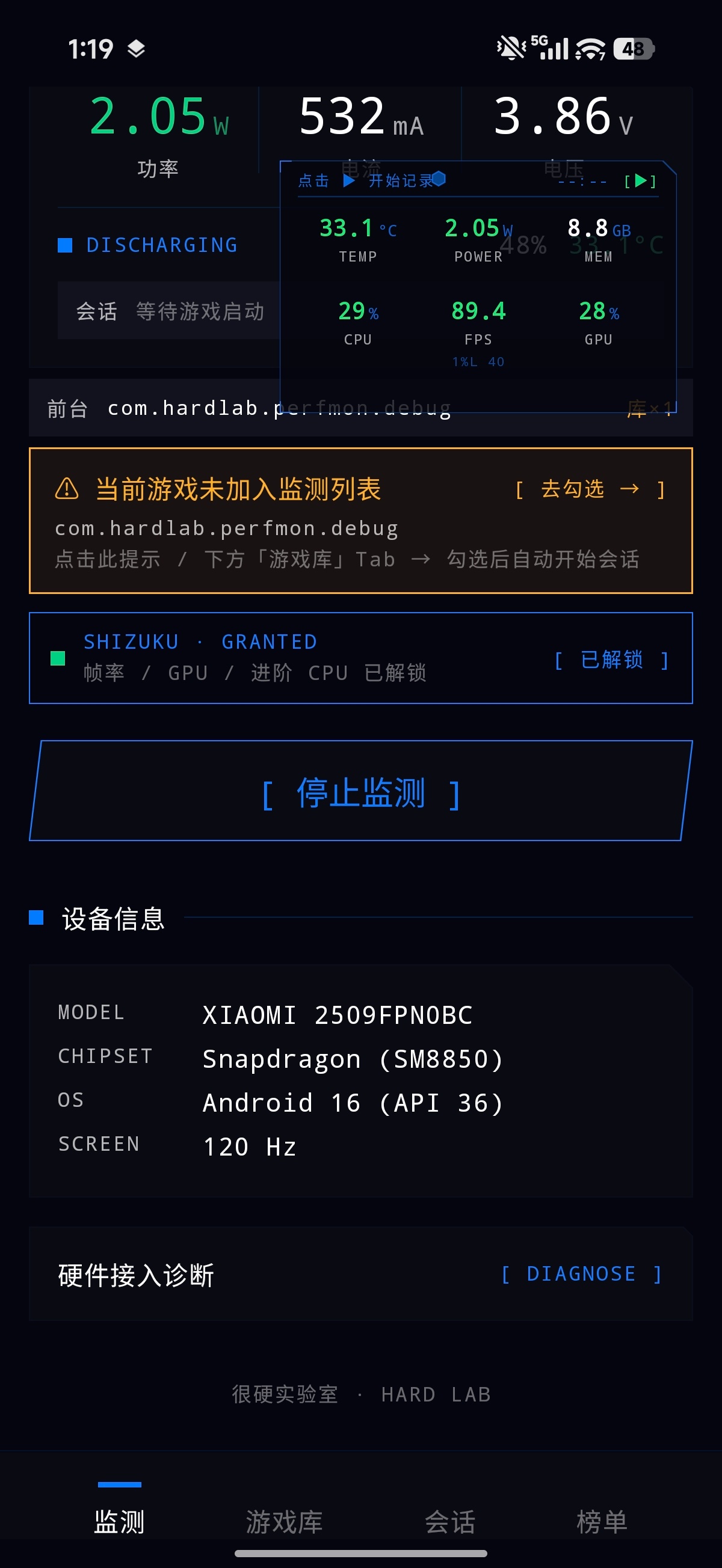 很硬性能监测 app 第一个版本上线,大家可以去:henyingLAB.com 网站下载使用了,注意:如果需要获取 fps gpu 等深度数据,需要结合 shizuku,app 有指引下载,不懂的可以在网站上看看教程! 注意:无广告,本地运行,不会泄露隐私,下一个版本开放 mvp 排名功能。