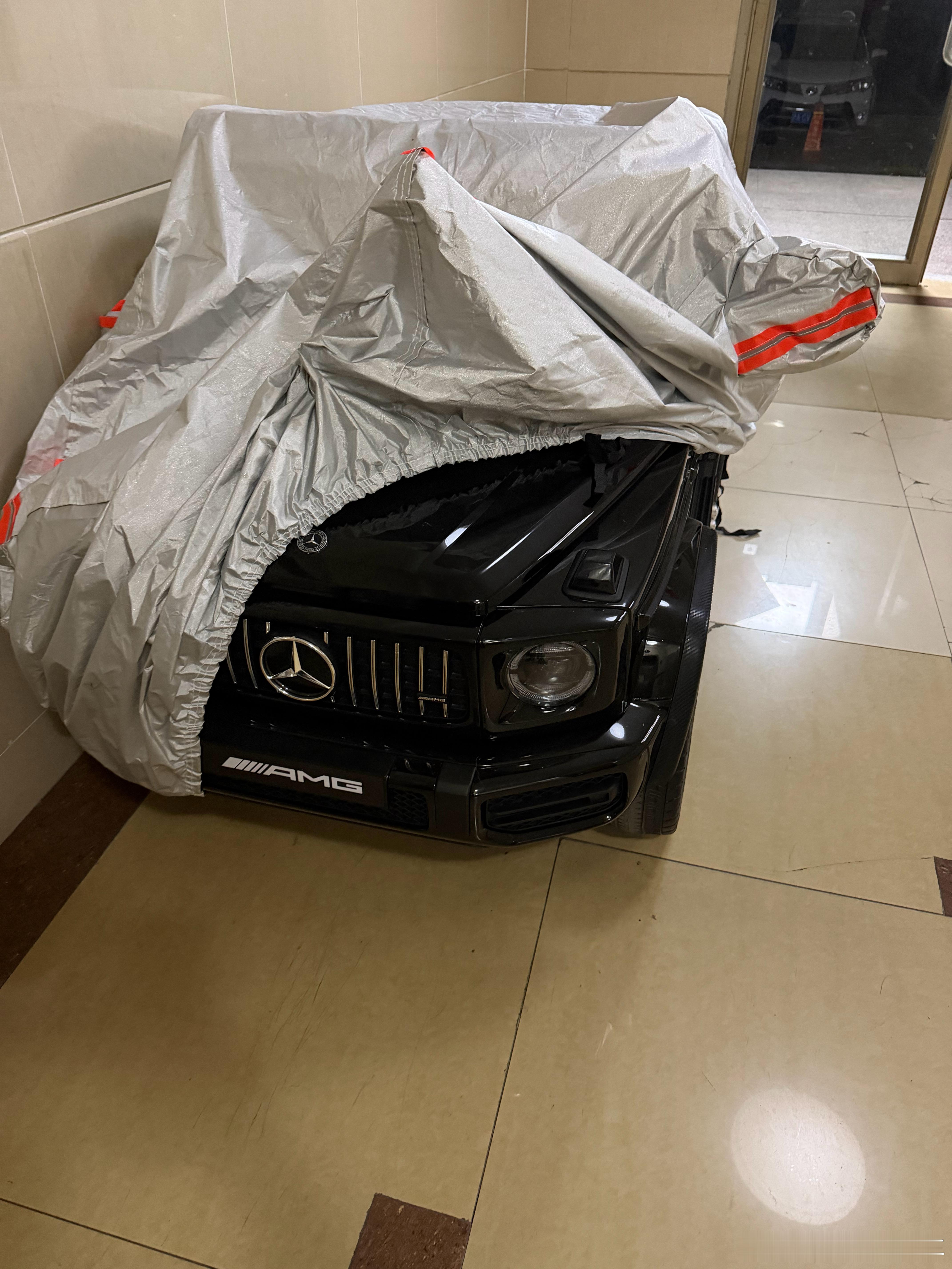 现在的小朋友真的幸福,小小年纪就开上了奔驰大G,还有专属车衣保护漆面,还有室内停车位